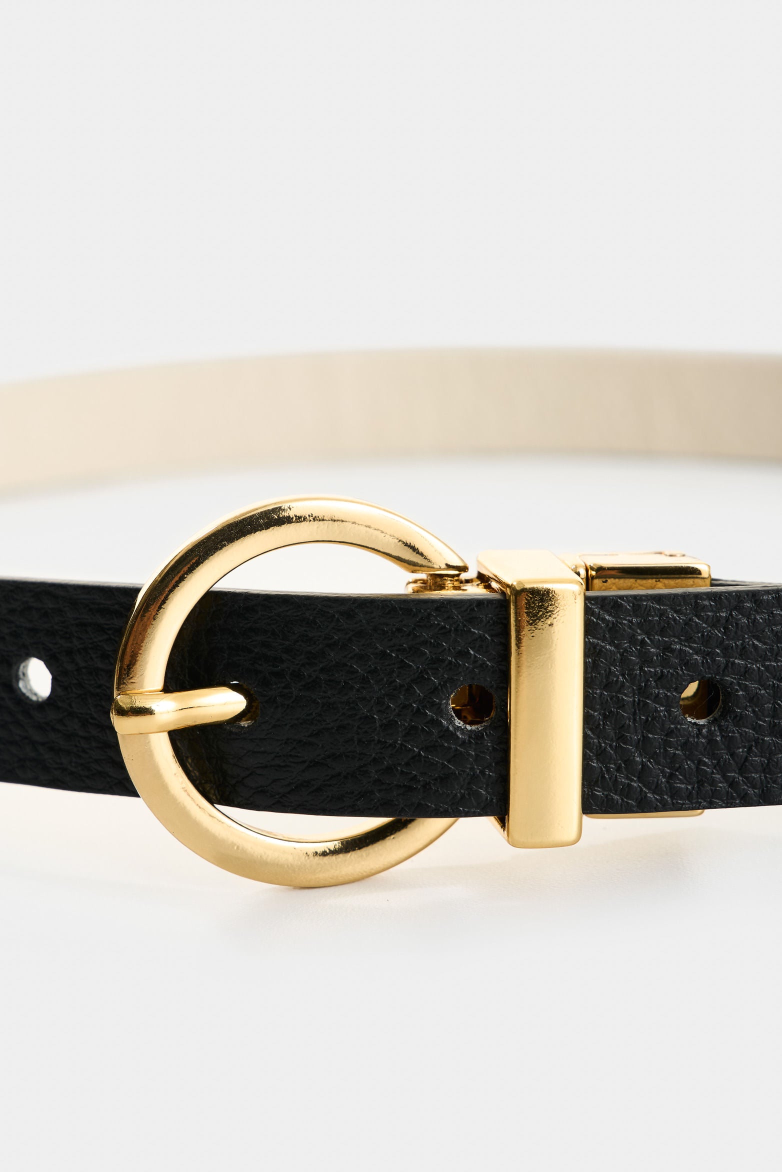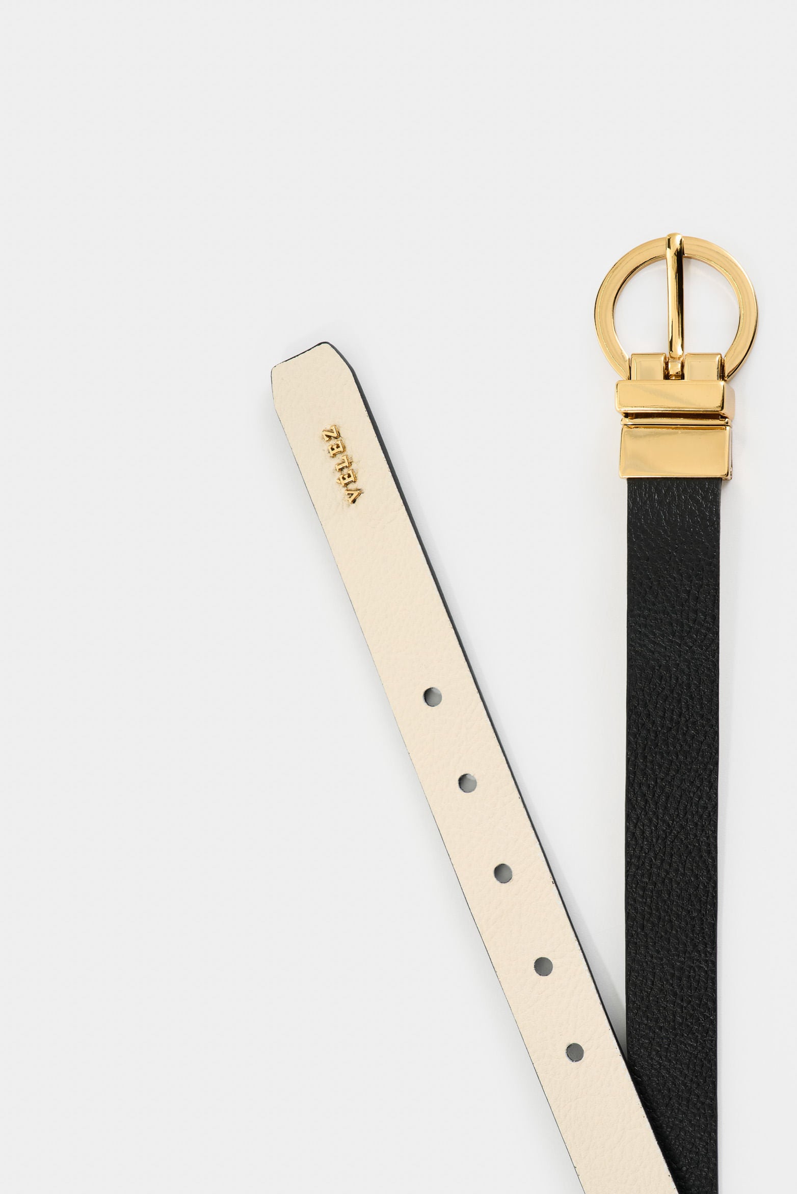 A fusion of sophistication and versatility in a reversible design. This smooth leather belt features one side with Monogram embroidery and the other with a subtle metallic finish, offering two styles in a single piece. Its round gold-tone buckle adds a bold touch, while the refined structure and adjustable fit make it a timeless statement piece for any occasion.