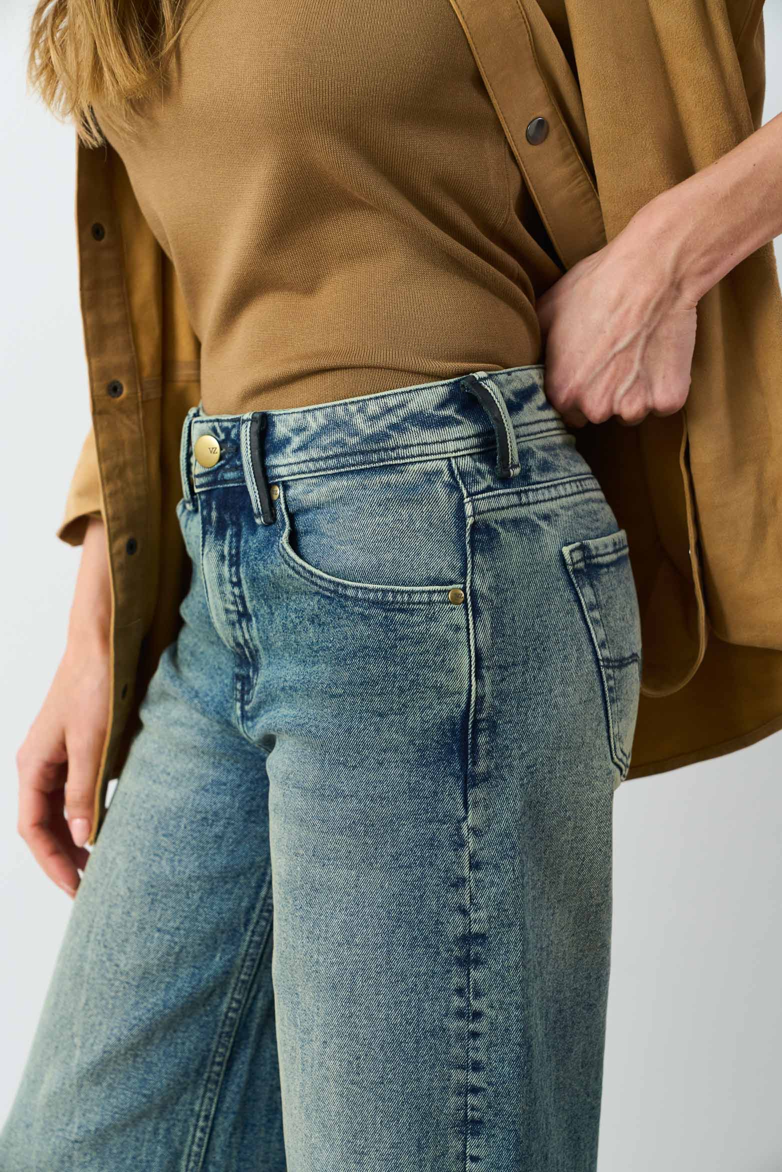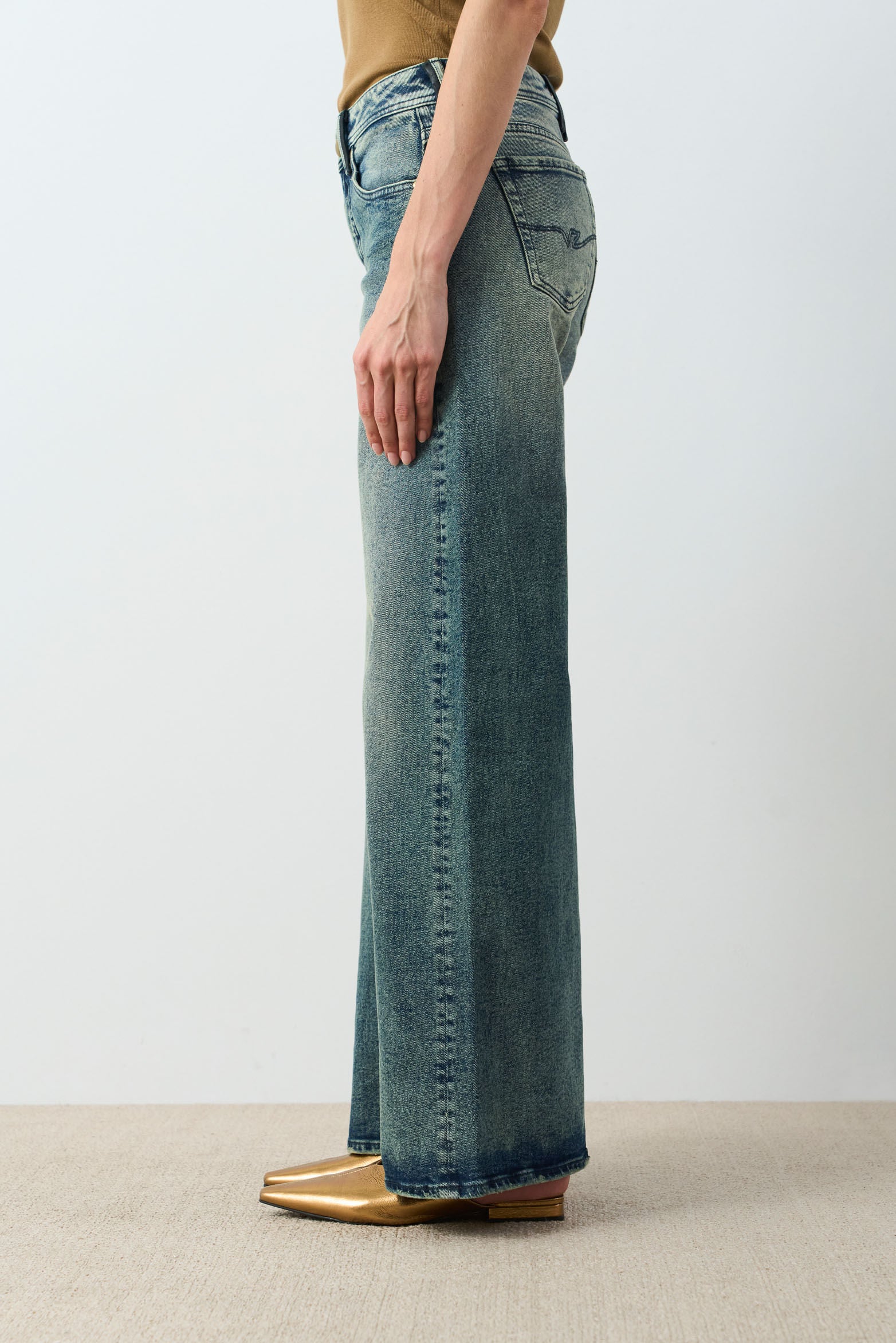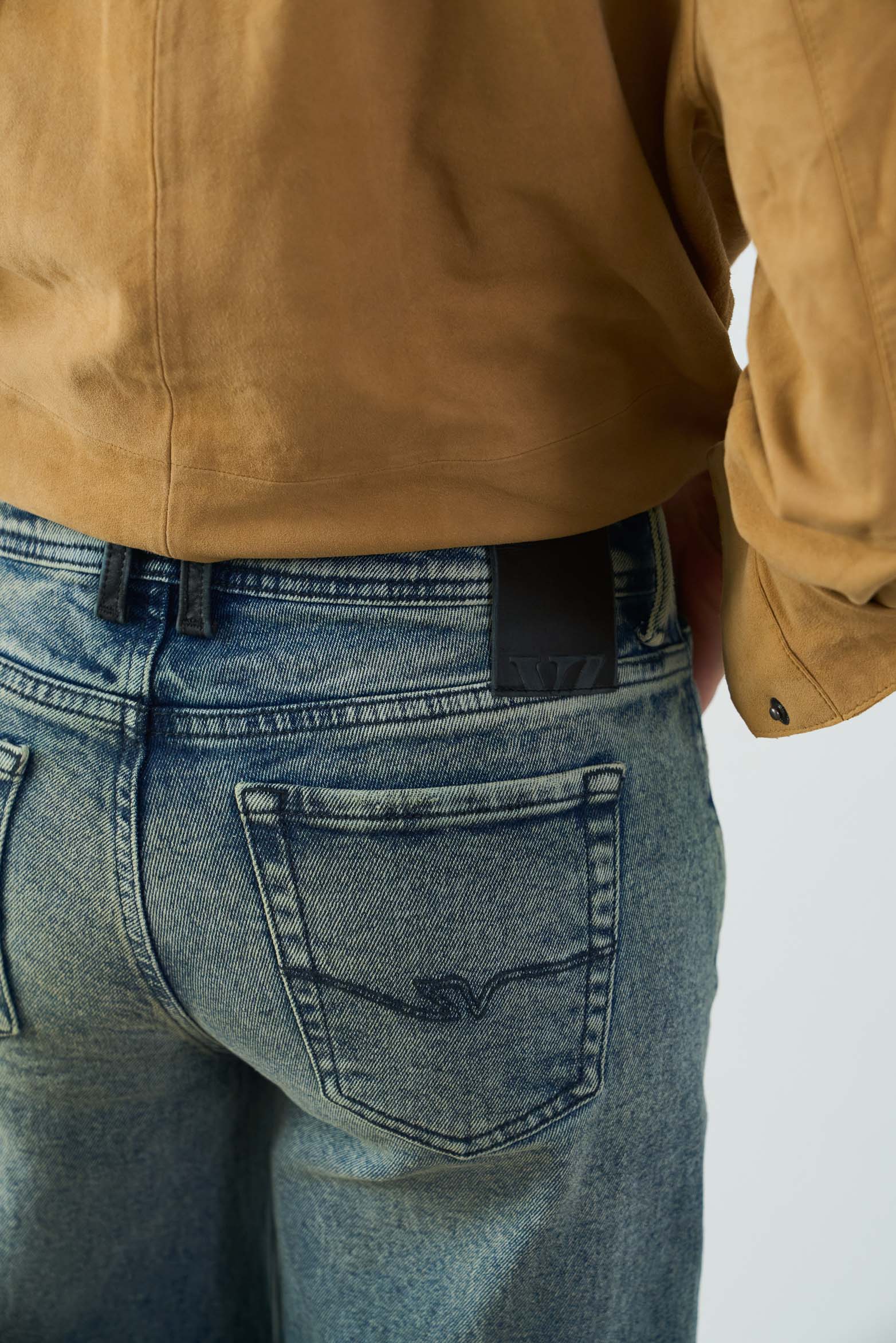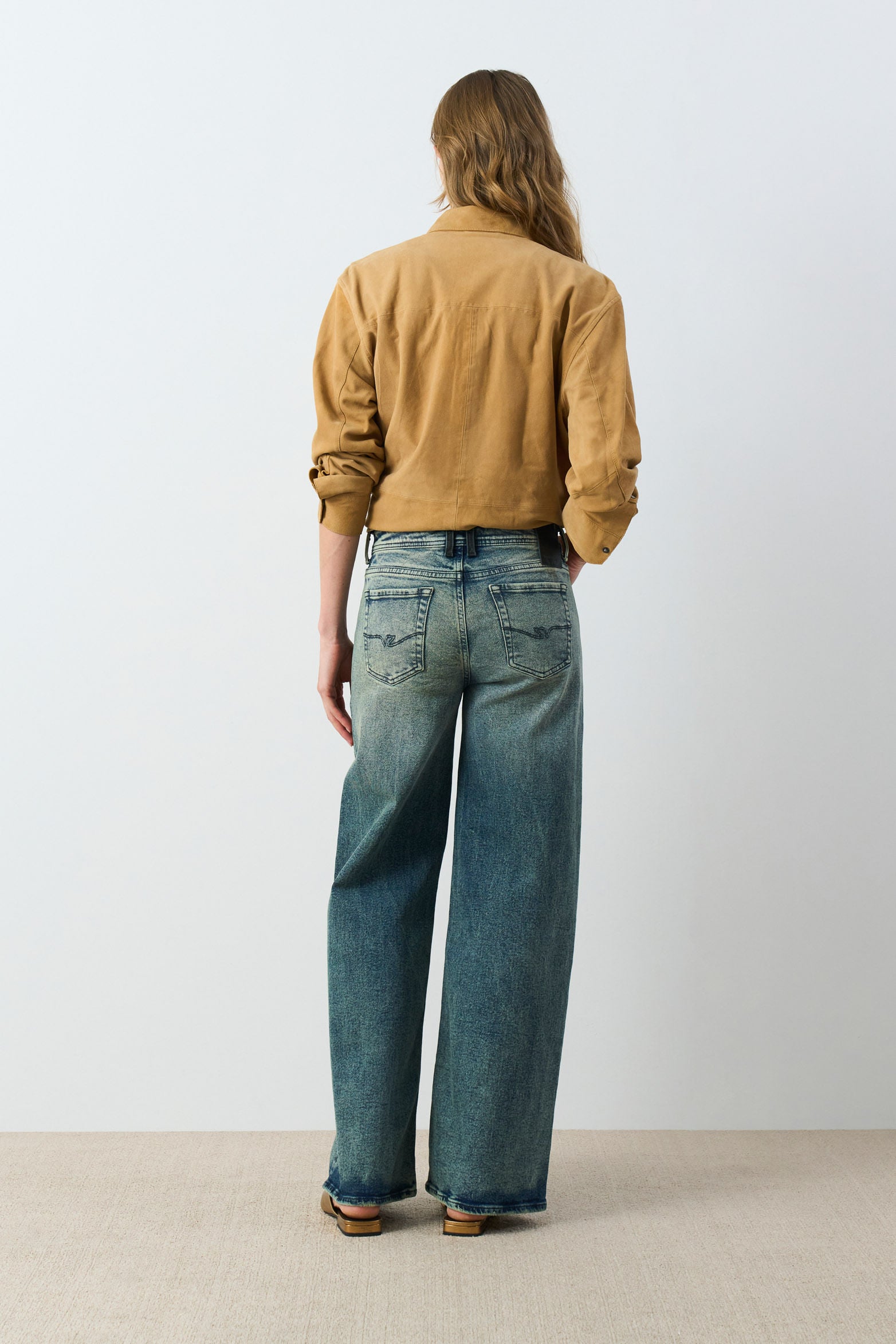 The ‘70s spirit is reinvented in this design featuring a wide-leg silhouette and high waist. Its worn denim finish and visible stitching evoke a vintage flair, while the straight cut balances comfort and structure. A versatile essential that transcends trends perfect to pair with biker jackets or flowy shirts, creating timeless looks with an effortlessly sophisticated character.