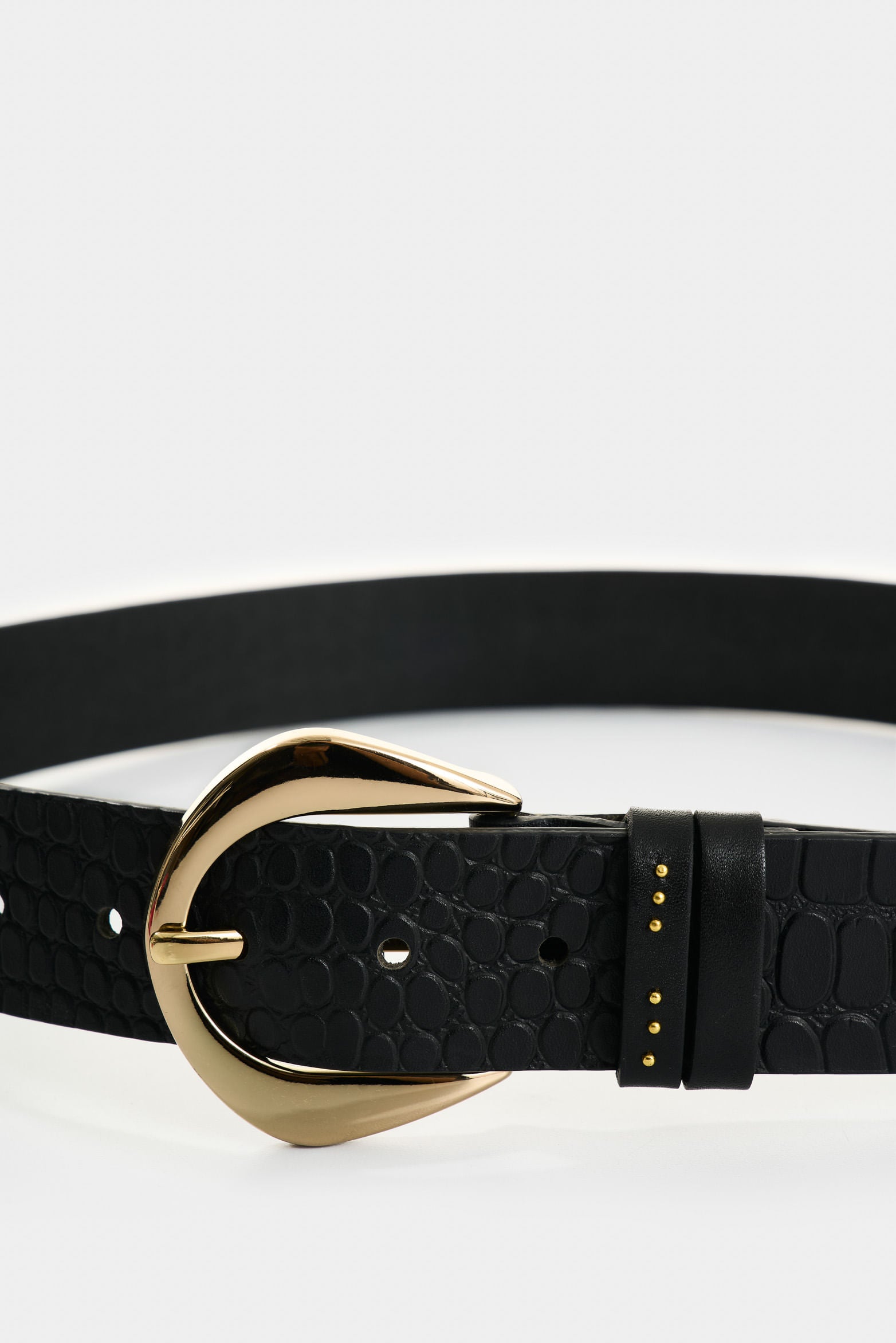 With textures that evoke the natural strength of the plains, this single sided belt combines sophistication with artisanal boho charm. Crafted from croco embossed leather, it stands out for its keeper adorned with mini studs and a semi rounded tip that adds a unique touch. Perfect for accentuating the waist of a maxi dress or wearing casually with your favorite pants, it’s the ideal accessory for an authentic and refined style