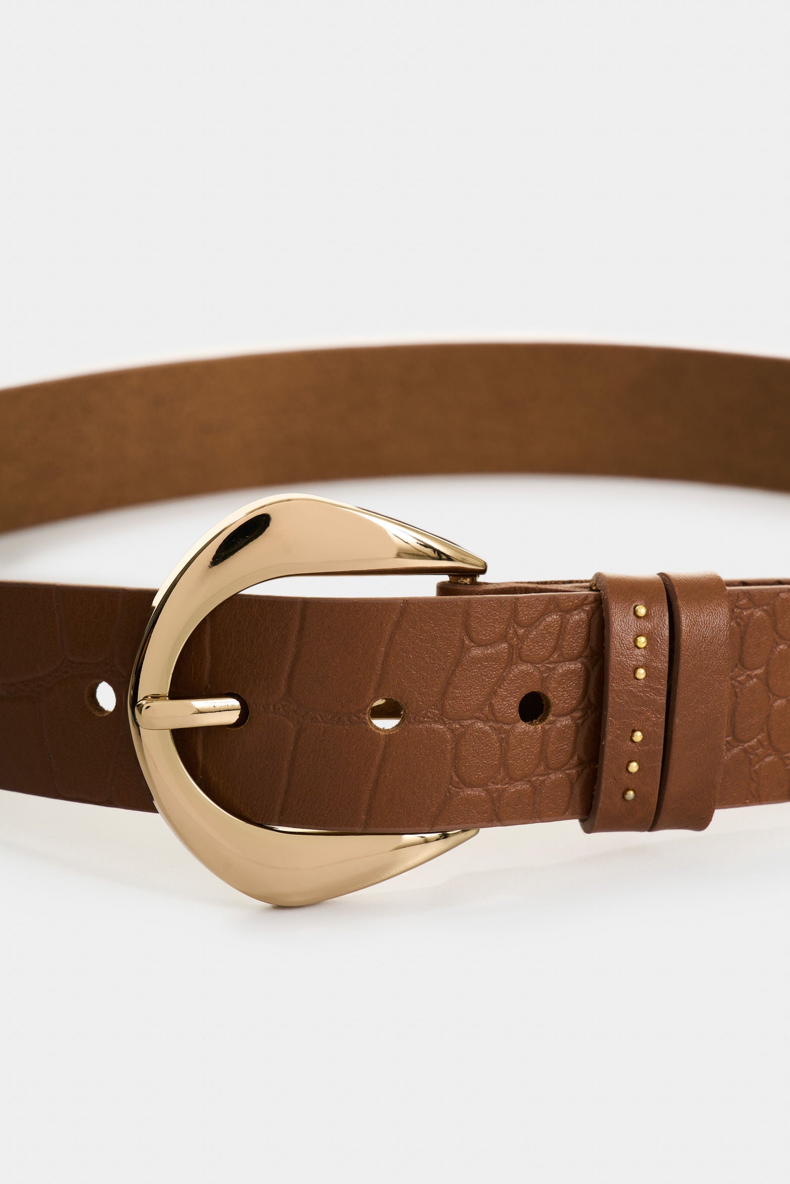 With textures that evoke the natural strength of the plains, this single sided belt combines sophistication with artisanal boho charm. Crafted from croco embossed leather, it stands out for its keeper adorned with mini studs and a semi rounded tip that adds a unique touch. Perfect for accentuating the waist of a maxi dress or wearing casually with your favorite pants, it’s the ideal accessory for an authentic and refined style
