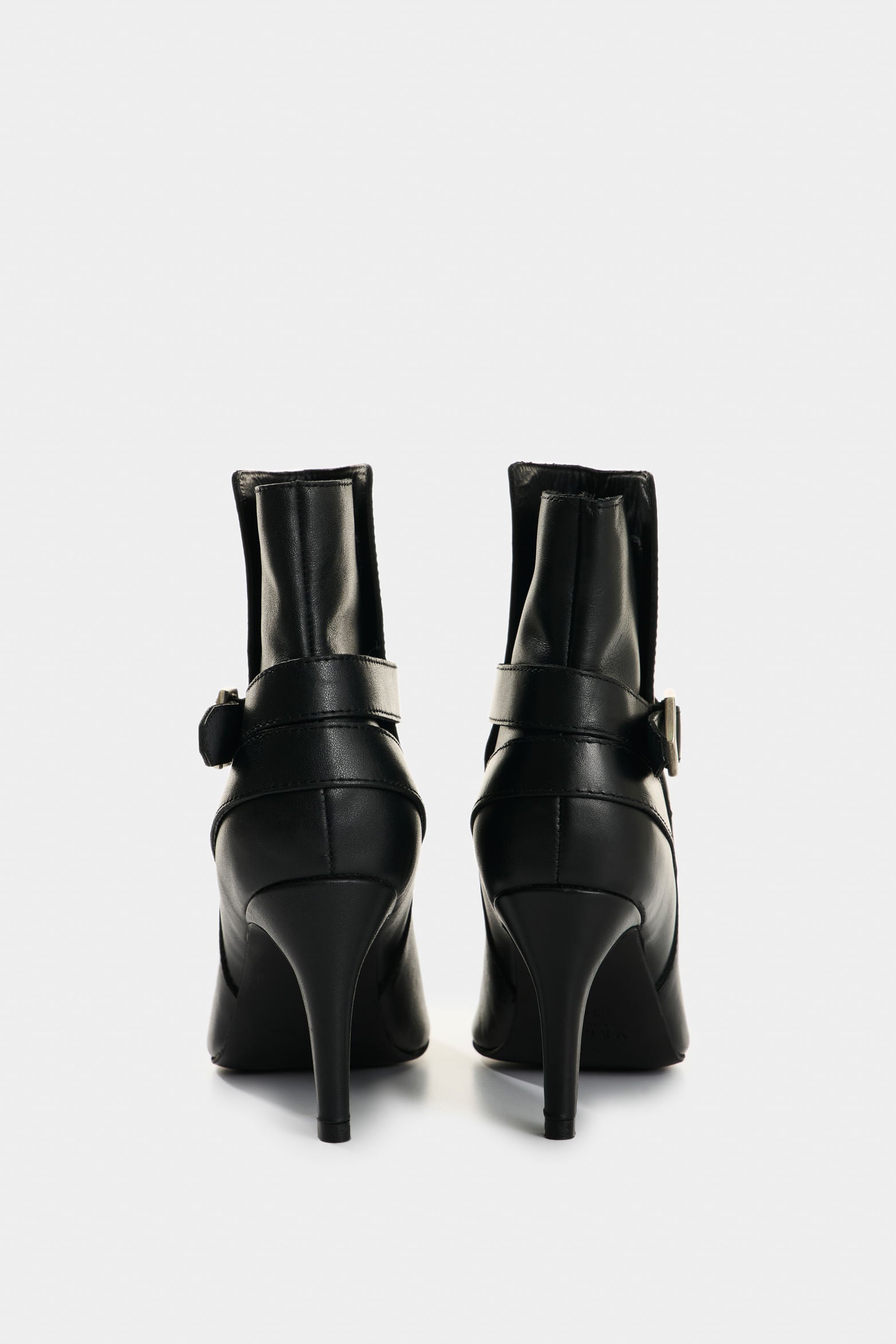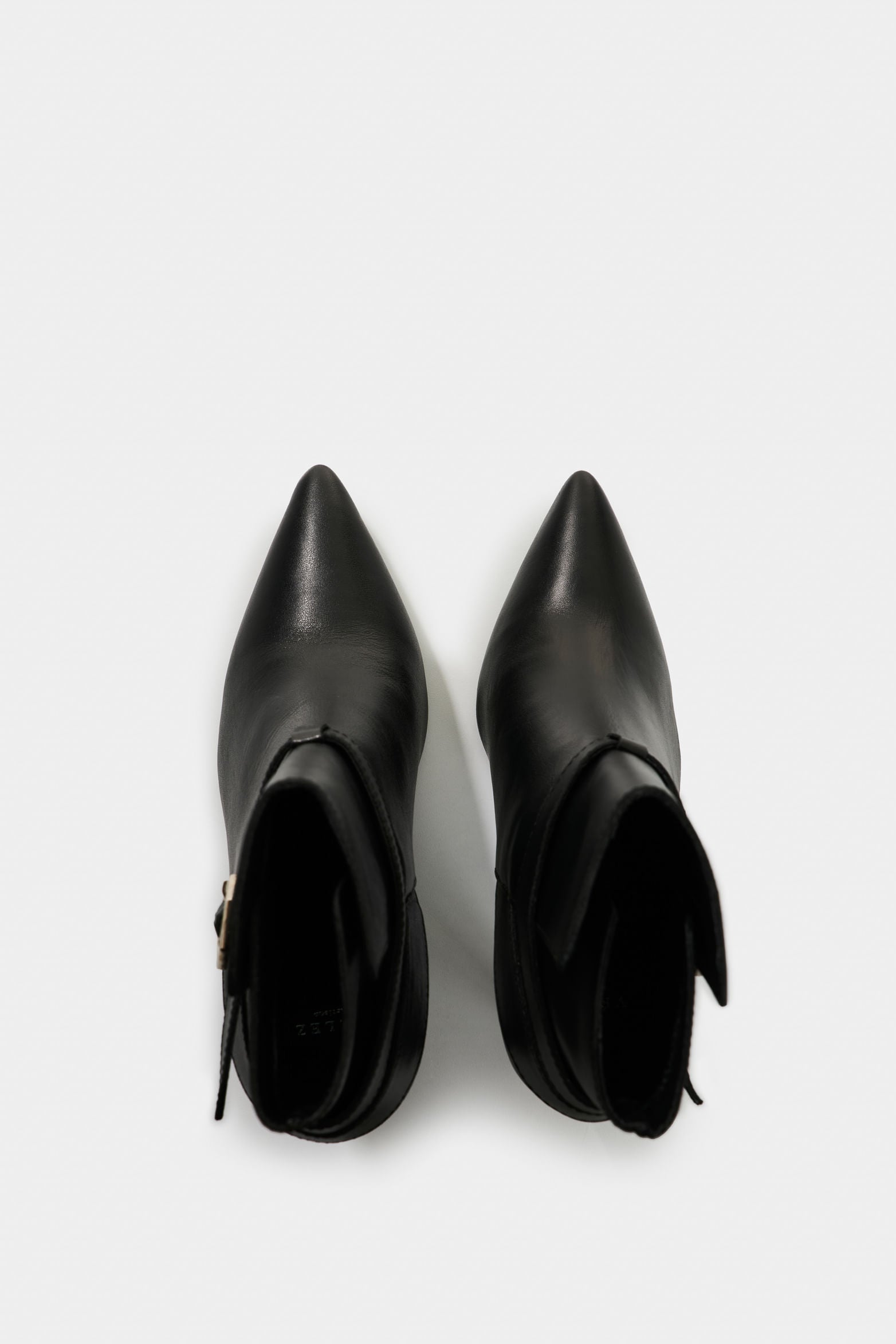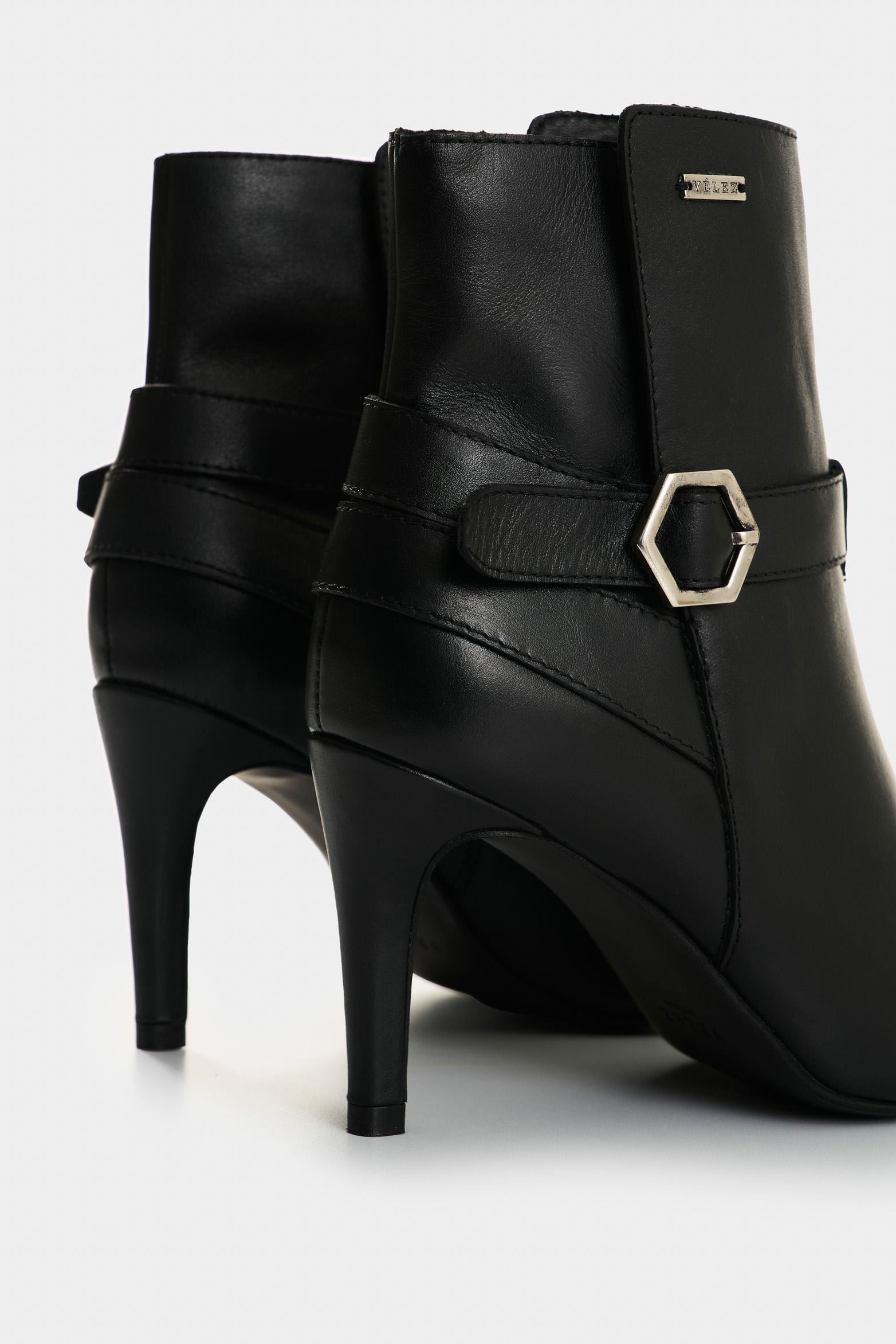 With a refined style that enhances the elegance of straight-leg trousers, dresses, or skinny jeans, these ankle boots offer a structure that elevates the sophisticated charm of any look. Crafted from smooth black leather, they combine soft, comfortable materials with a handcrafted design. The shiny nickel hexagonal buckle and the heel wrapped in matching leather add depth and unique details that embody the artisanal essence of Vélez