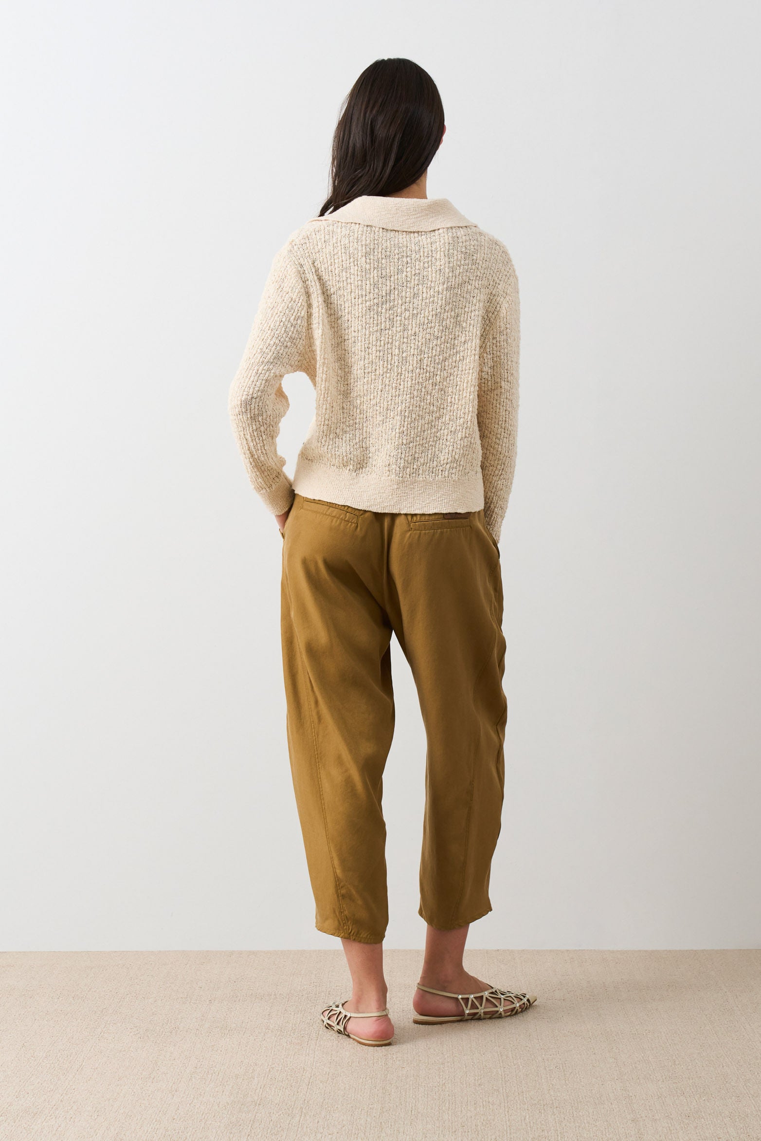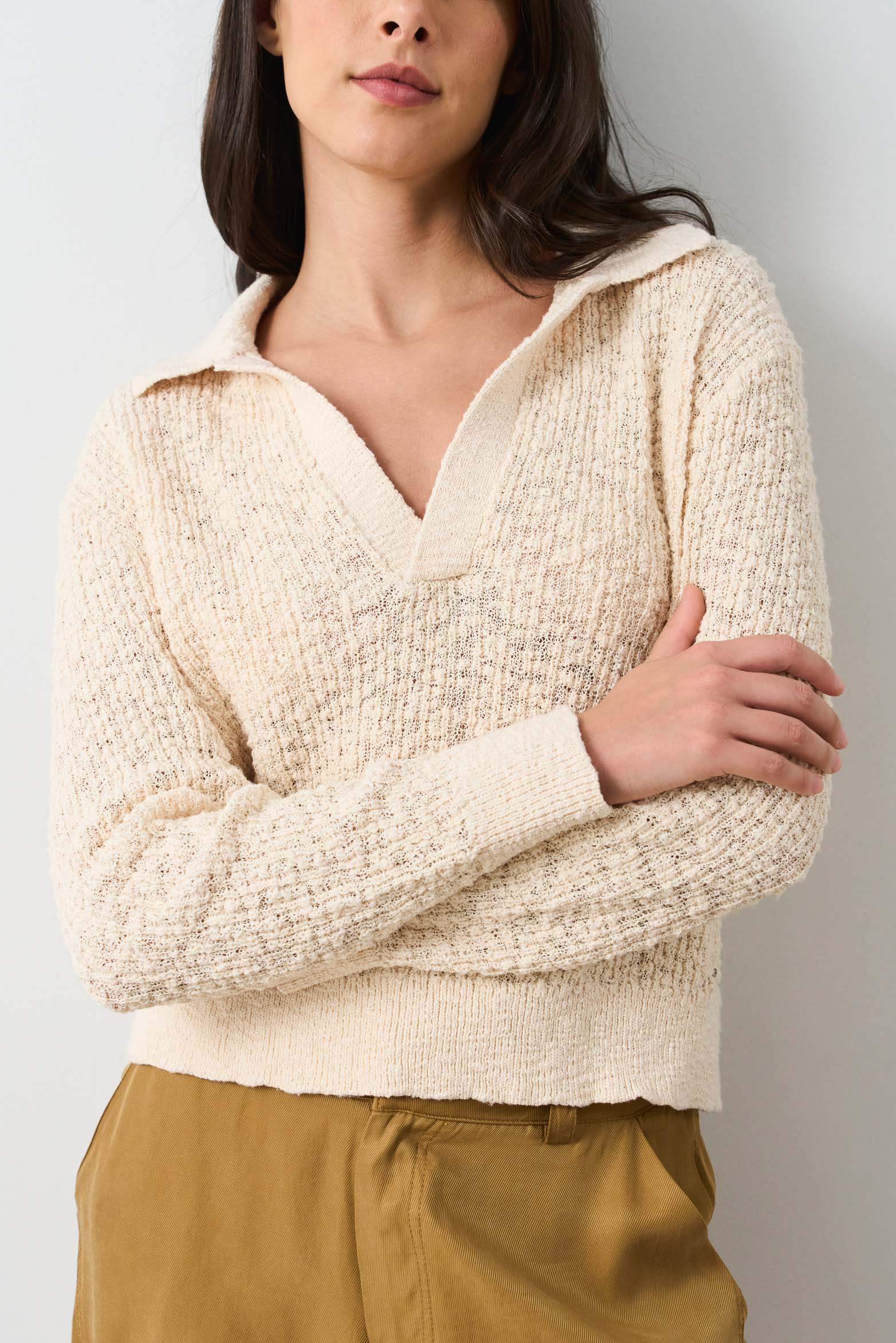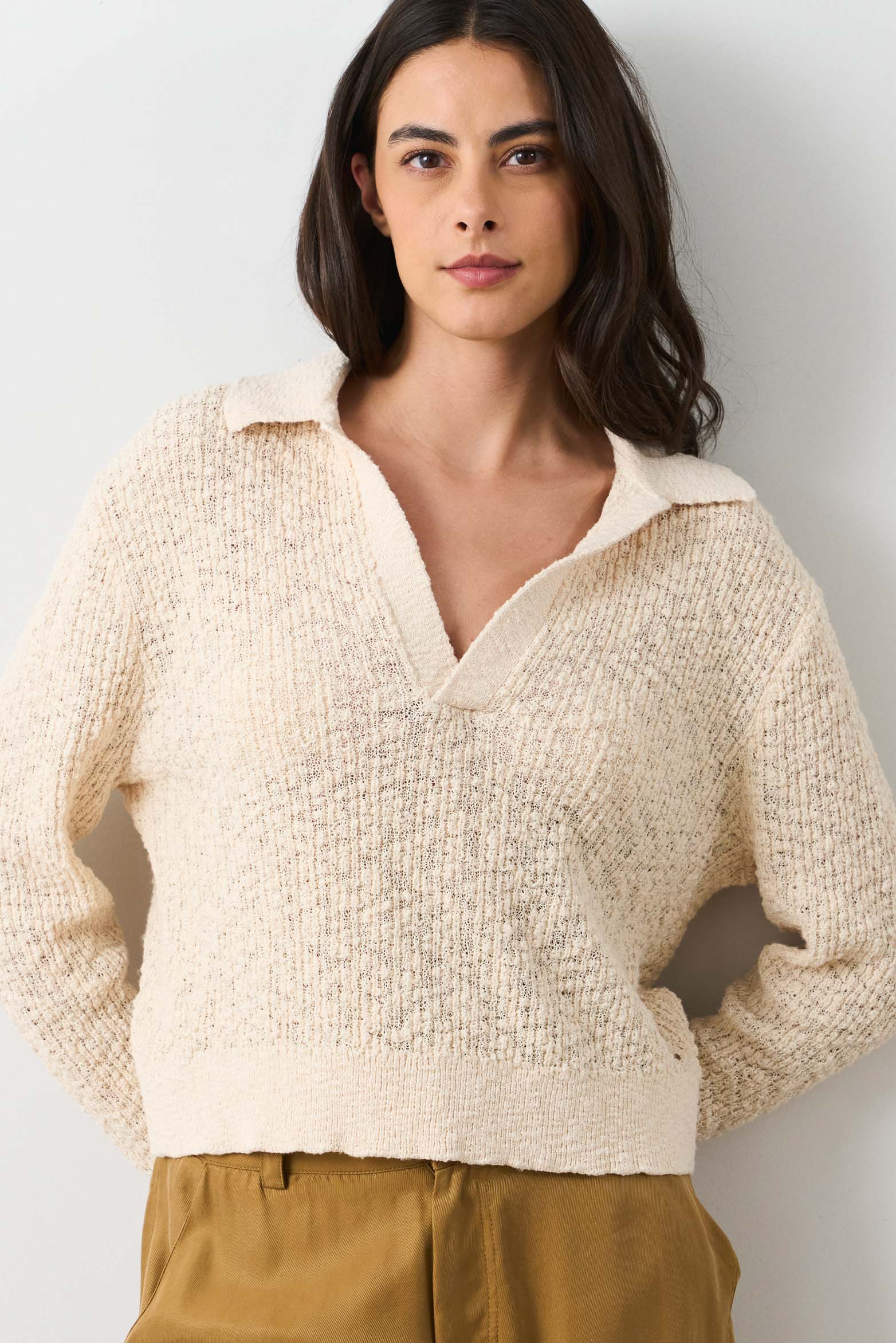 This knitted polo transforms casualwear into a sophisticated and versatile piece. Its ribbed neckline and placket, paired with the classic polo collar, blend timeless details with a contemporary touch. The soft and delicate knit, enhanced by ribbed finishes, offers both comfort and style. Perfect to wear with flowy trousers or relaxed shorts, it adds texture and subtle shine to your looks, effortlessly elevating any outfit with freshness and grace.
