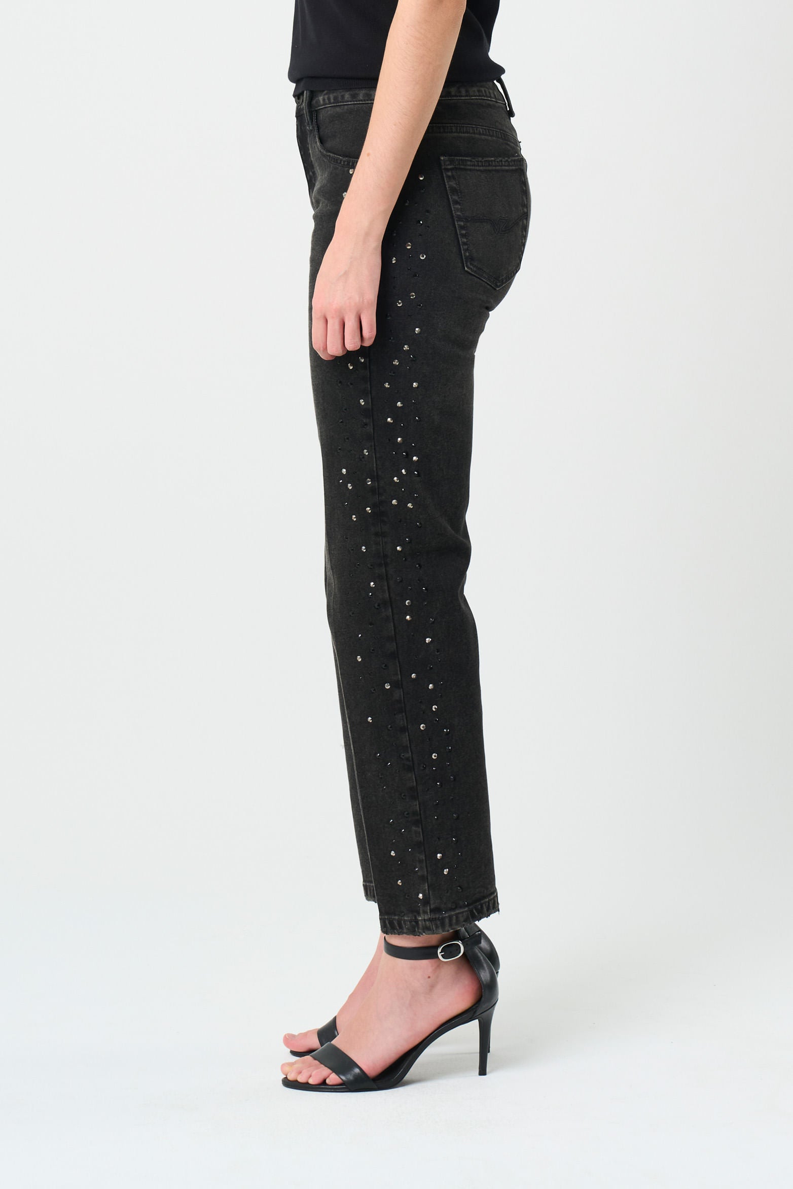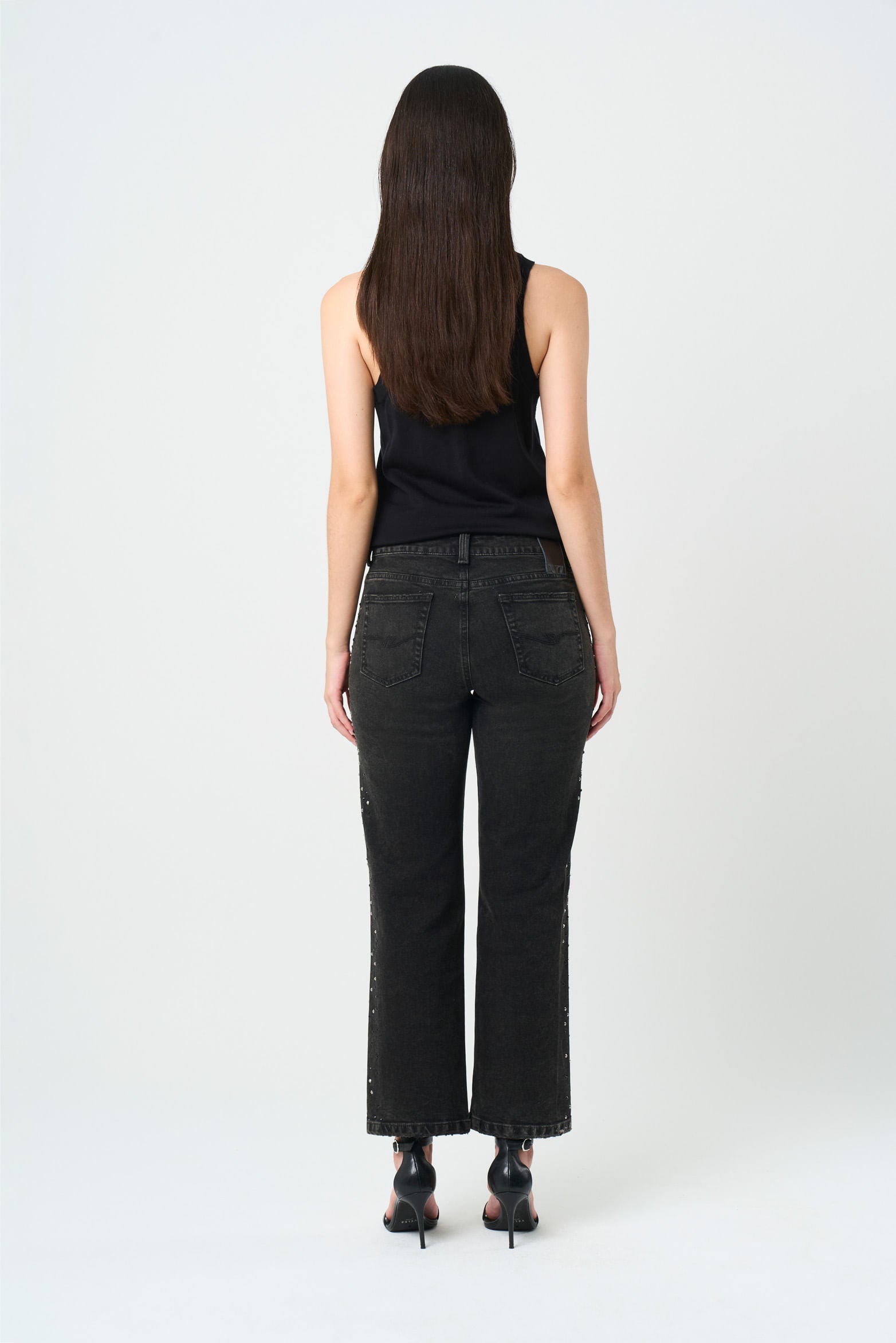 Denim with personality and subtle rebellion. The distressed finish gives it a relaxed vibe, while the metallic studs along the sides create a contrast between texture and shine. Its high-waist mom-fit silhouette with a straight leg combines comfort and structure, making it a versatile piece that easily adapts to both casual and more sophisticated looks.