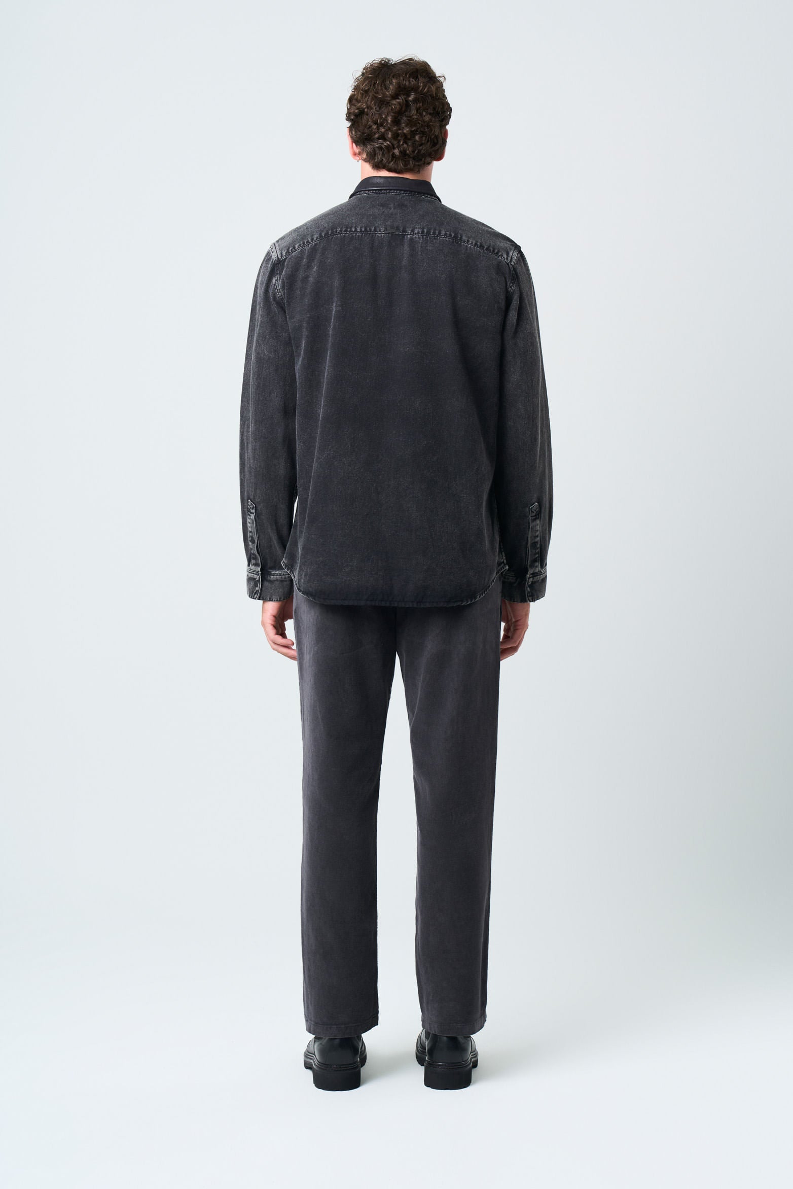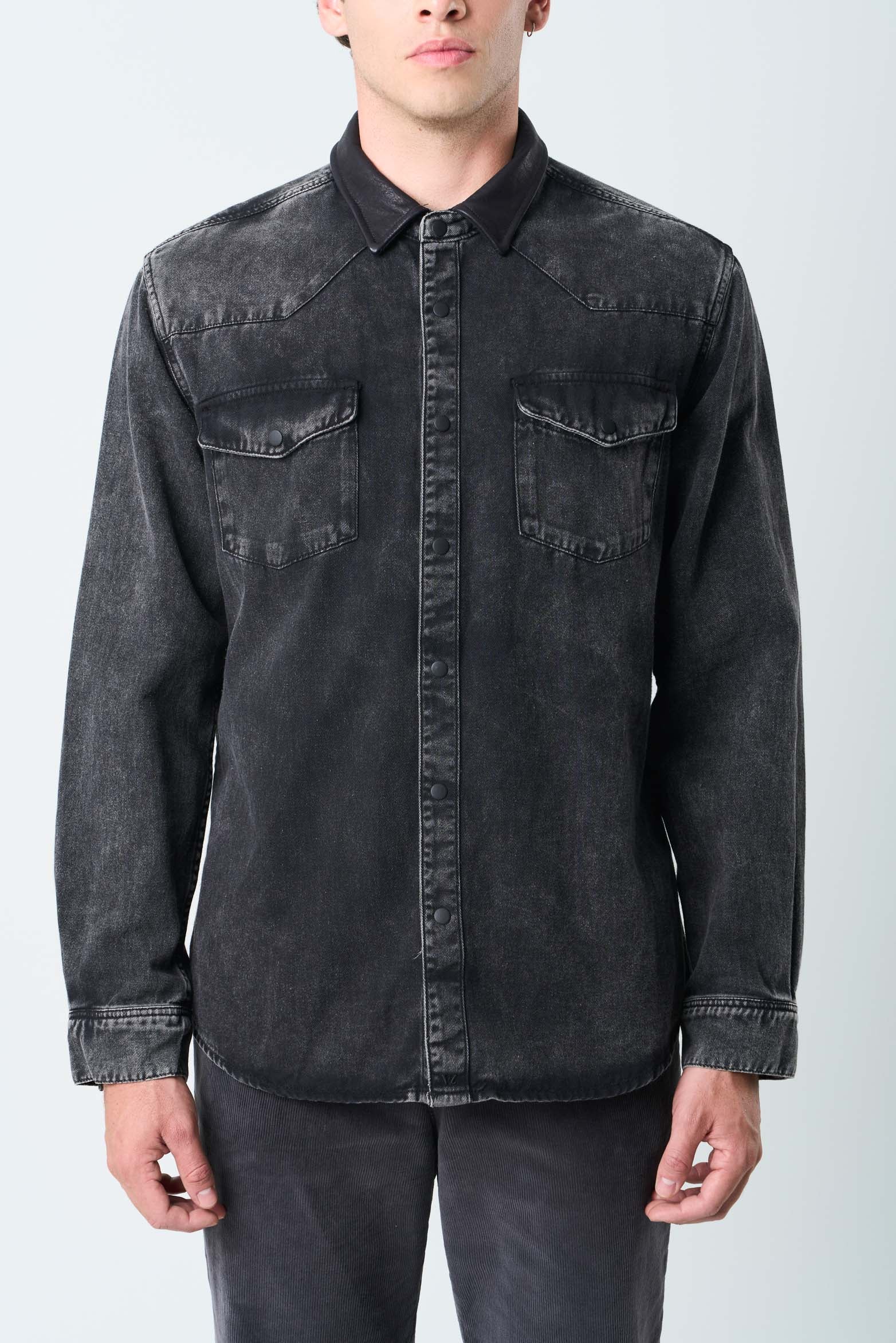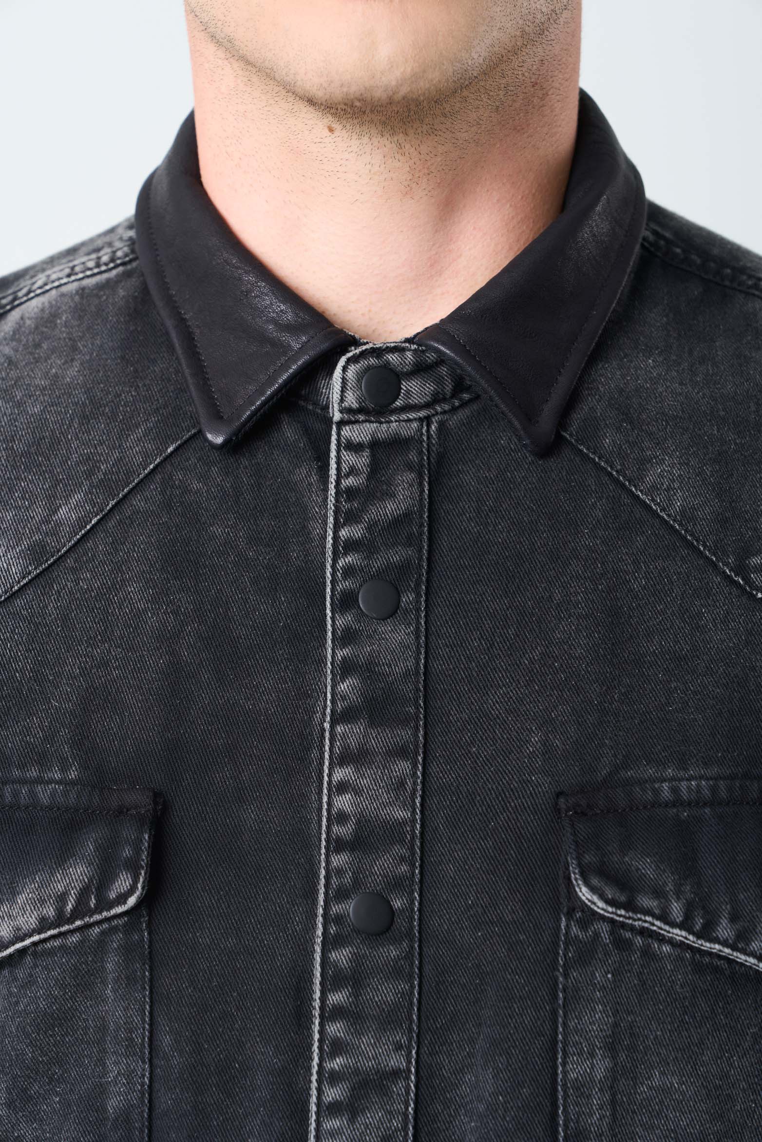 Our overshirt blends denim and leather in a creative design with distinctive texture, capturing a refined rebellious spirit that highlights artisanal expertise and our constant pursuit of innovation. A leather collar and branded snaps add relaxed formality. Crafted through a responsible washing process, this sustainable piece elevates your everyday looks and makes a statement of drive and sophistication.