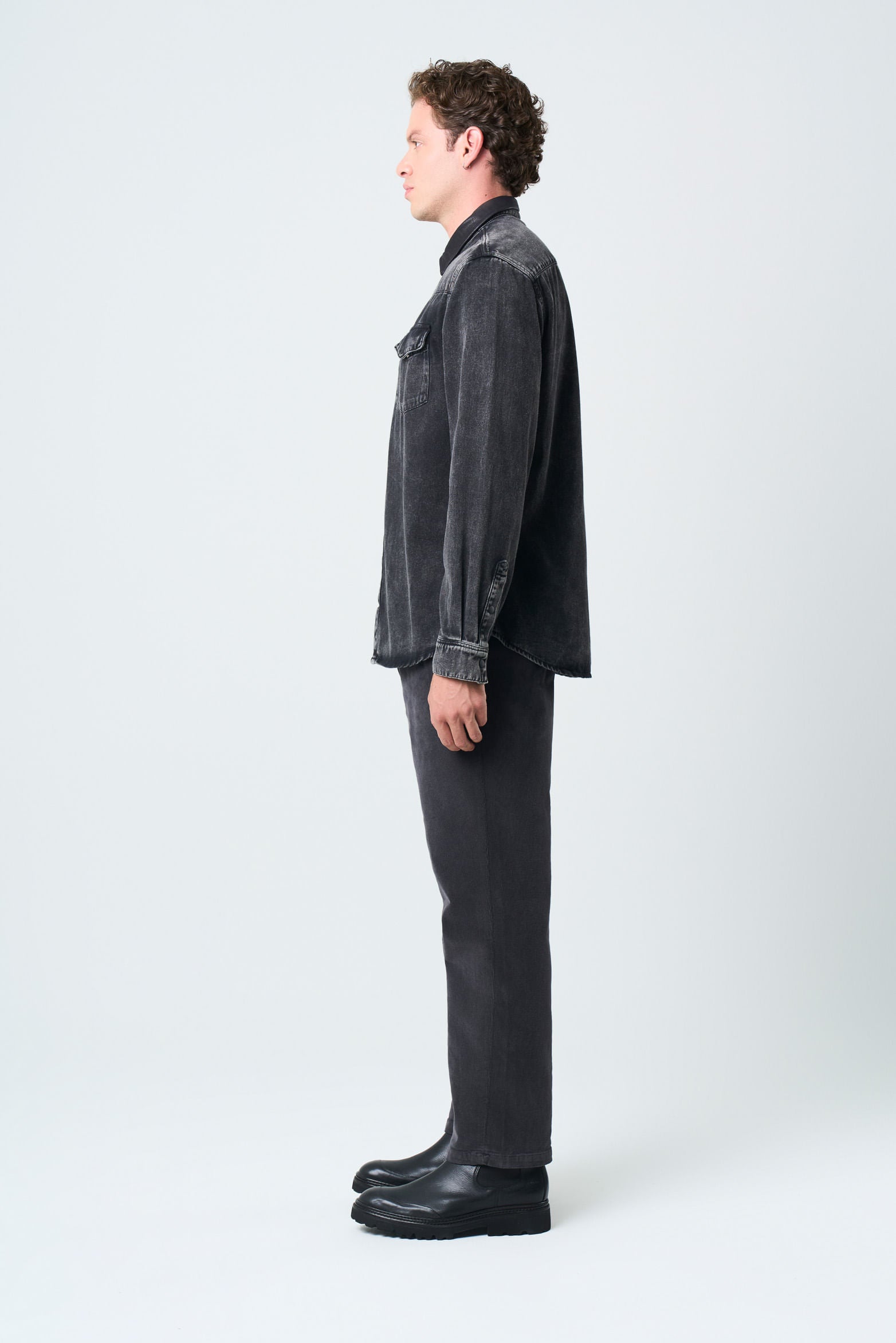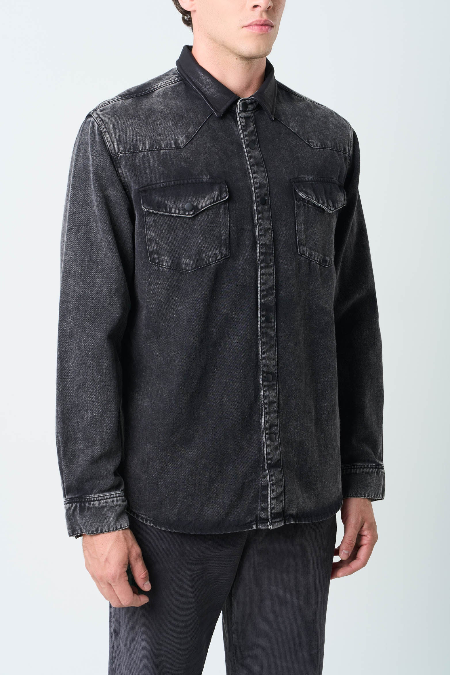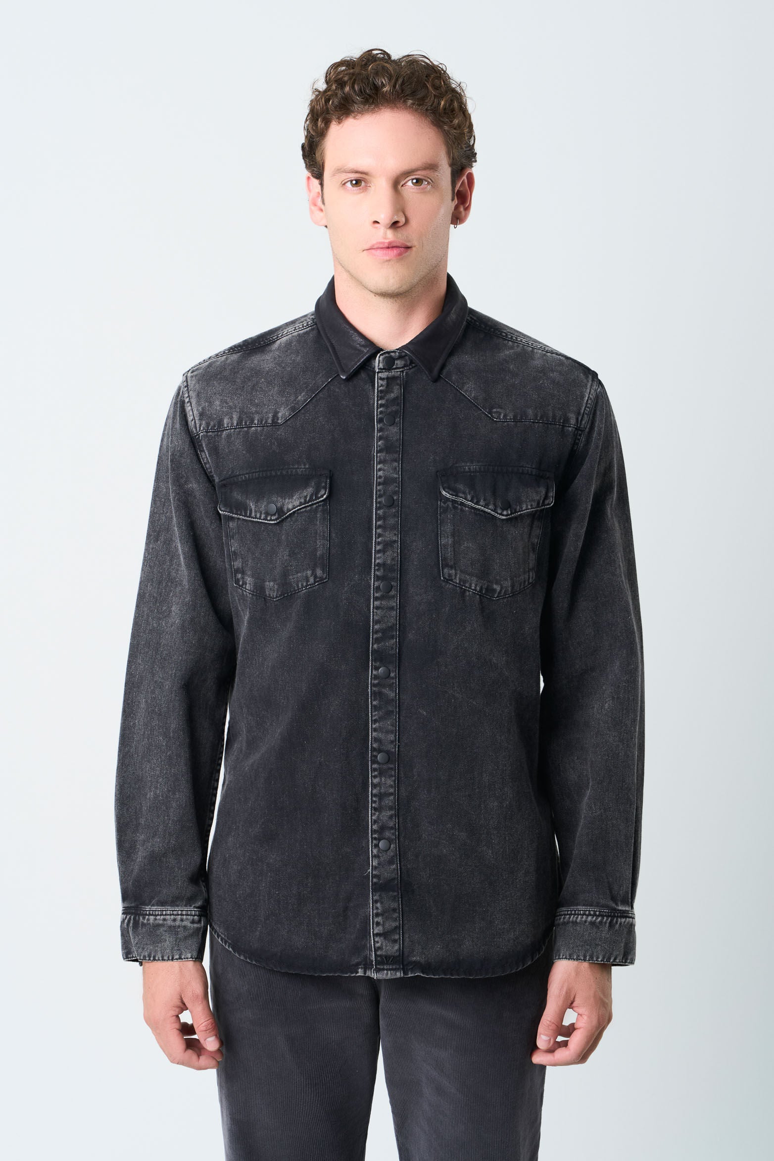 Our overshirt blends denim and leather in a creative design with distinctive texture, capturing a refined rebellious spirit that highlights artisanal expertise and our constant pursuit of innovation. A leather collar and branded snaps add relaxed formality. Crafted through a responsible washing process, this sustainable piece elevates your everyday looks and makes a statement of drive and sophistication.