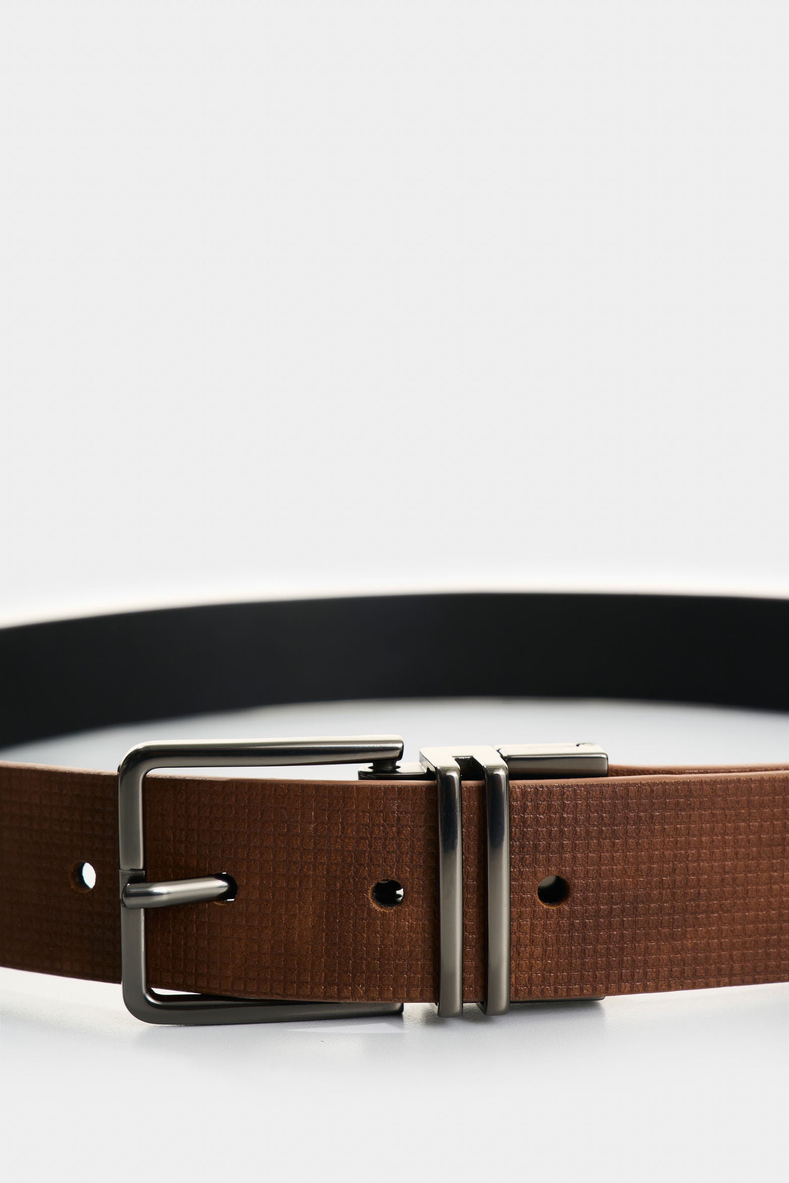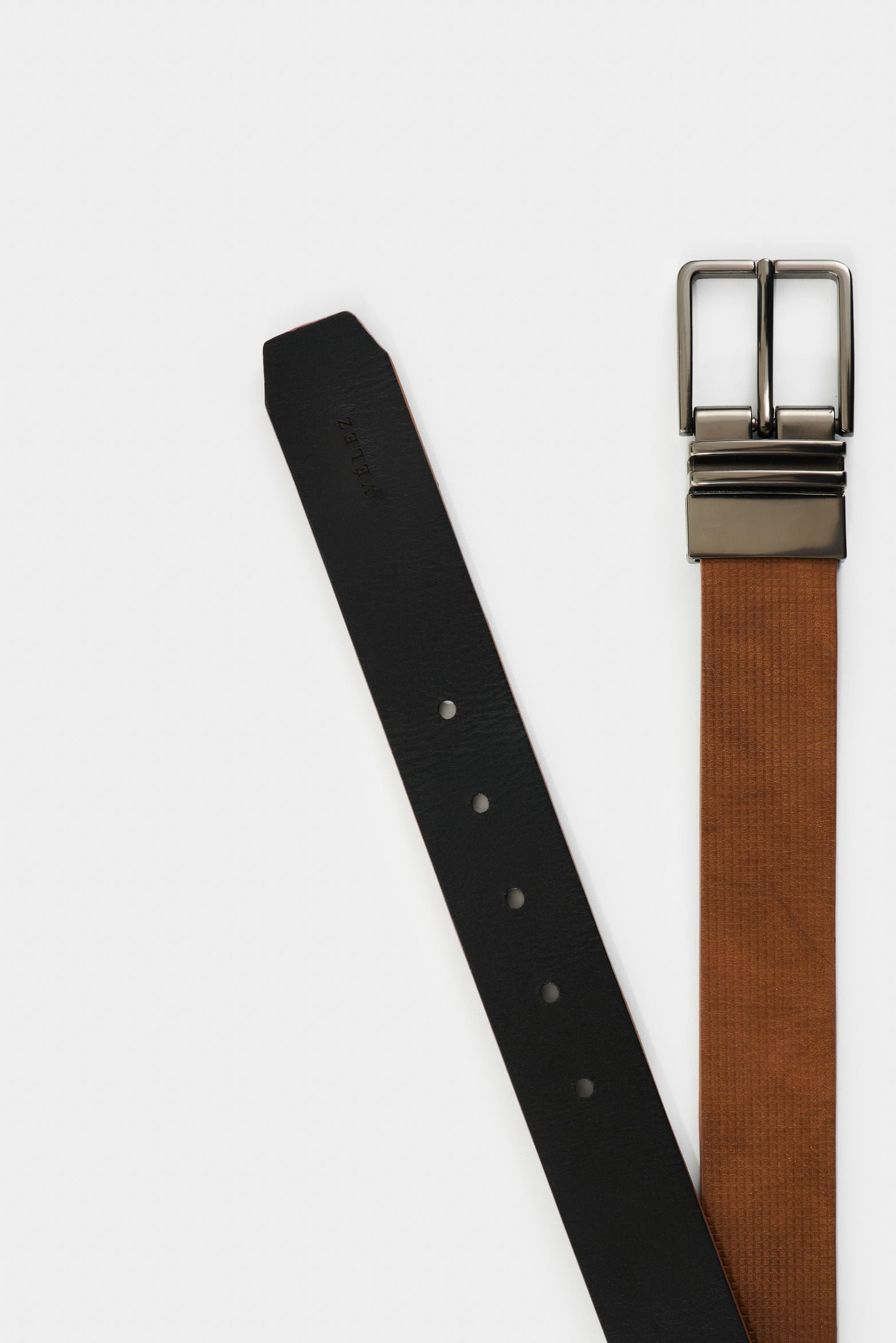 Designed with a focus on craftsmanship and versatility, this double-faced belt in supple leather pairs a semi-gloss finish with a check-embossed texture that highlights its contemporary character. A reversible buckle in black-nickel adds sophistication, while the structured design complements both casual and tailored looks. A refined piece that balances natural beauty with artisanal techniques to elevate your style with authenticity.