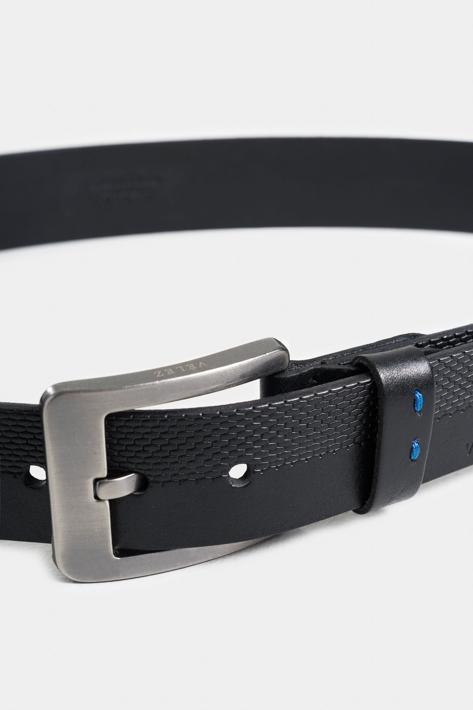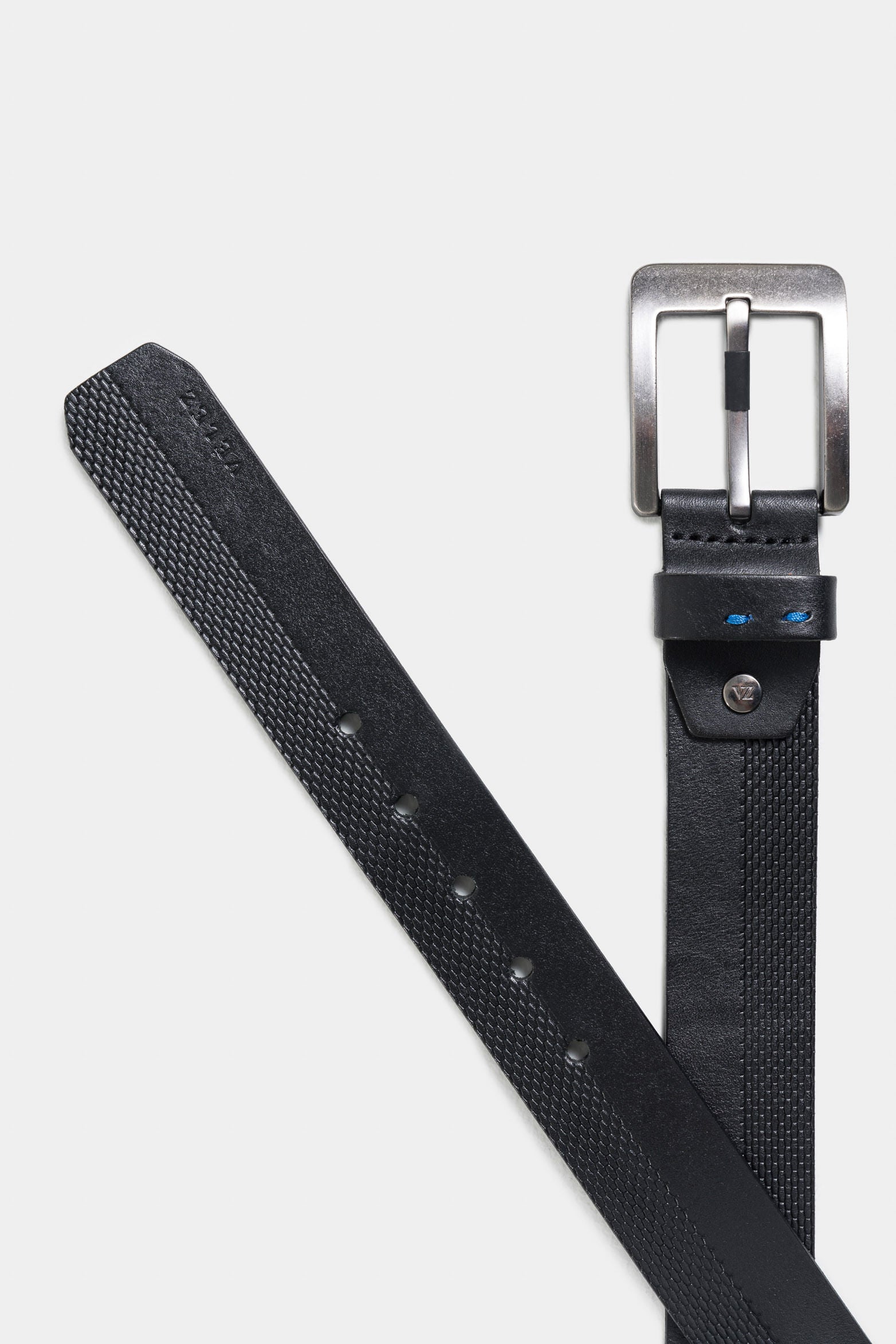 Men’s single-face leather belt with localized textured detail and an aged effect along the strap edges and keeper; satin black-nickel buckle; 40 mm strap. Ideal for casual and office wear, available in multiple color options.