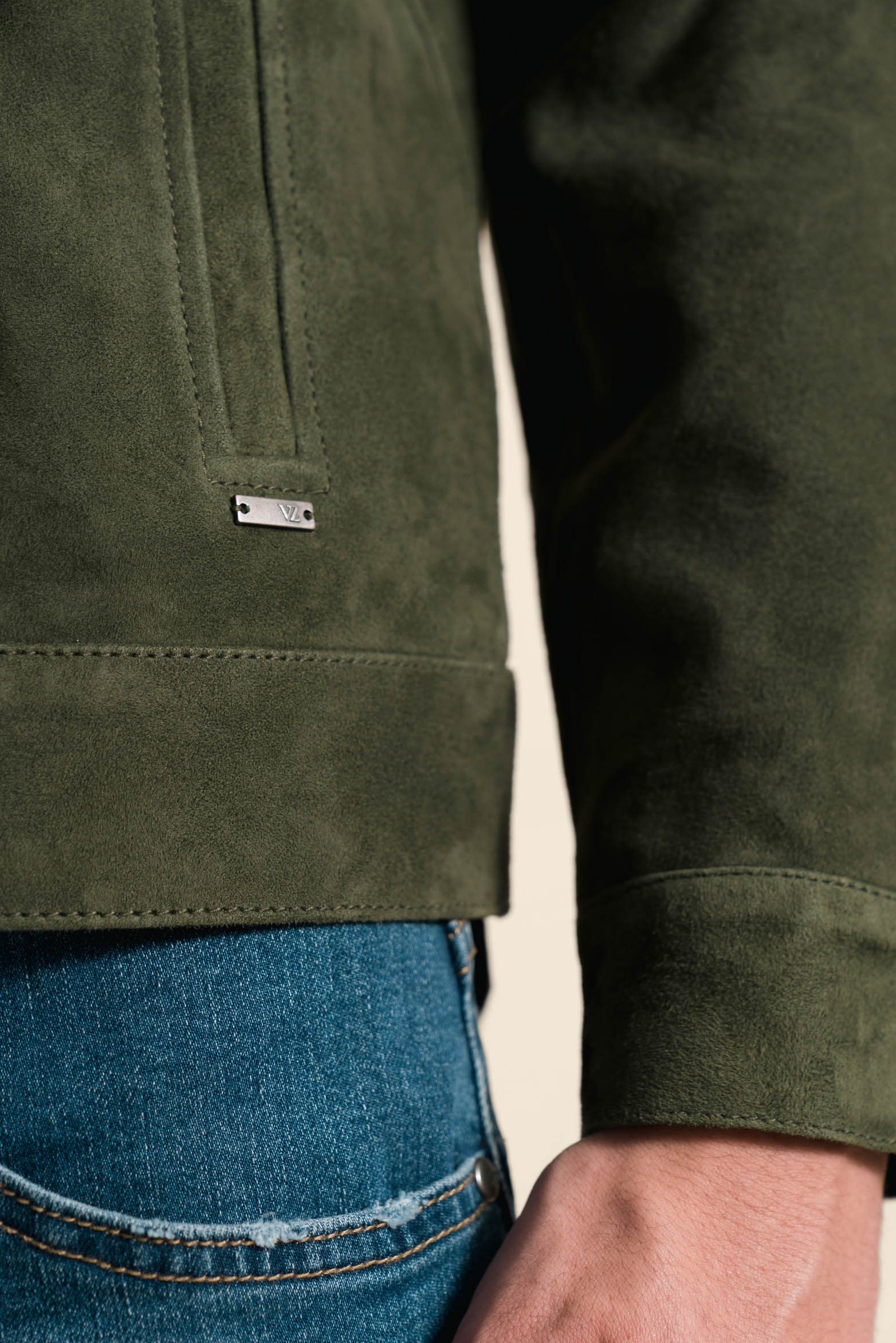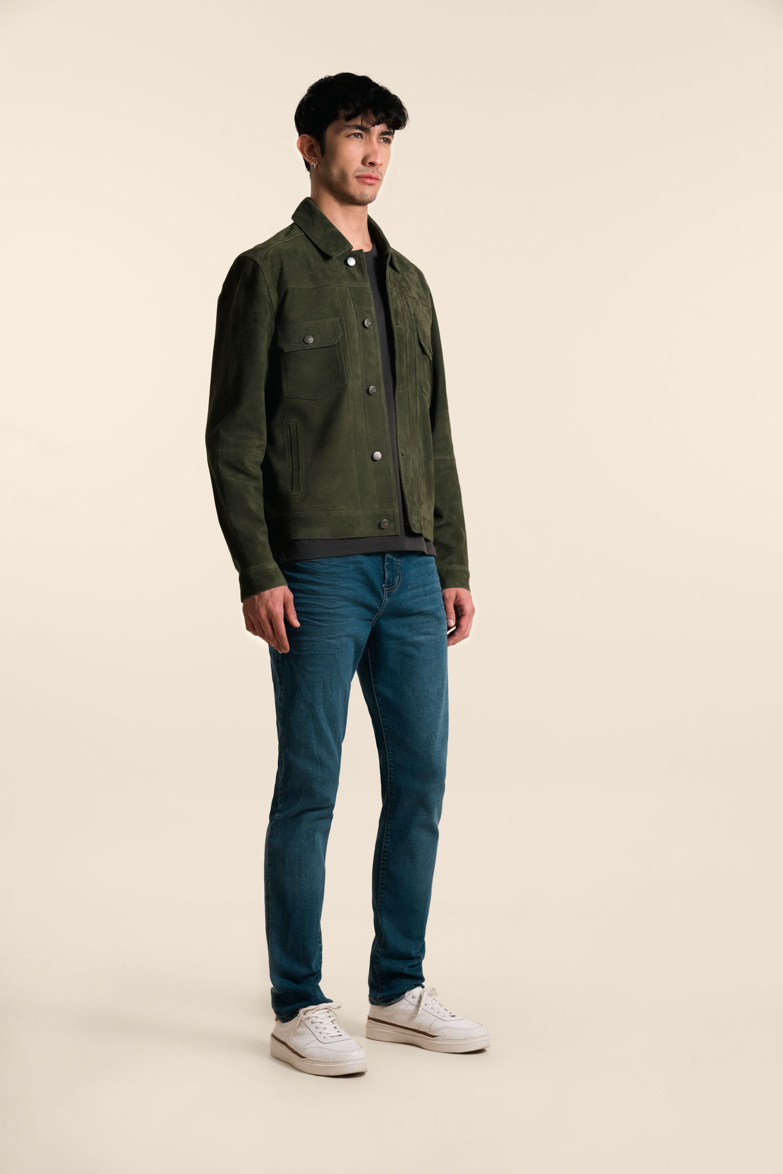 Our trucker-style jacket in Zambeze suede is a nod to classic tailoring with its chambray collar, riveted pockets, and button closure. A versatile piece to complement your casual ensemble.