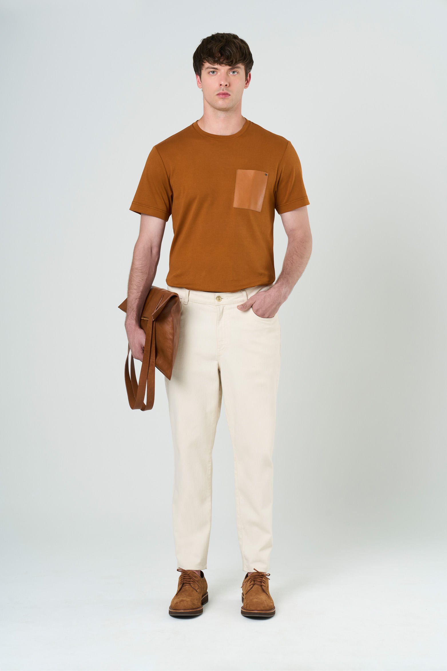 We redefine casual fashion with our 100% cotton T-shirt, featuring a light and comfortable silhouette that elevates clean and refined styles. Ideal for the contemporary man, this timeless piece showcases subtle details like the contrasting neck ribbing and the leather pocket with VZ hardware, adding an effortless sophistication. This renewed classic is a wardrobe essential, designed with fresh materials to easily pair with your existing pieces, perfect for transitioning between relaxed and semi-formal looks.