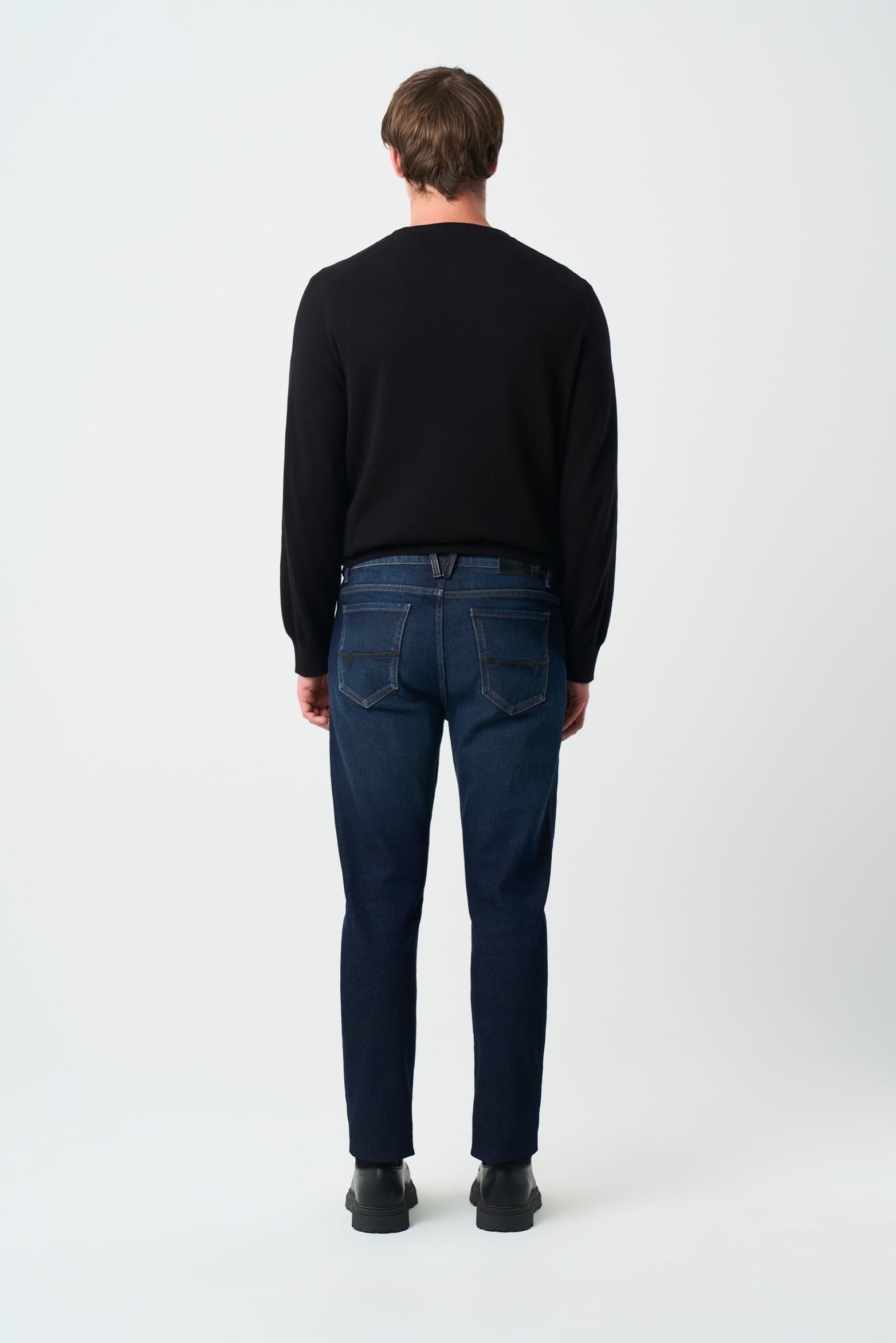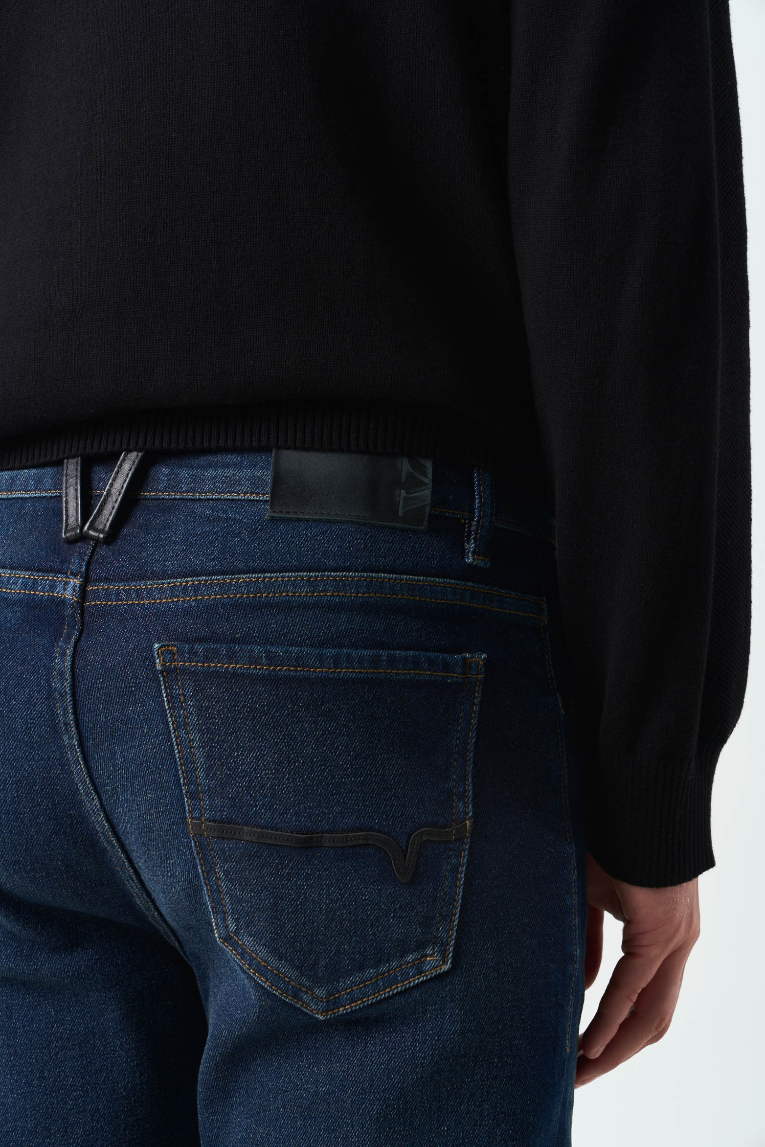 A timeless essential that adapts to every piece in your wardrobe, these semi-fitted blue denim jeans combine luxurious texture with the everyday comfort you need. Leather details on the belt loops and coin pocket add an artisanal touch that elevates their silhouette. With a subtle finish that emphasizes the details, these jeans become a renewed classic, perfect for any occasion.
