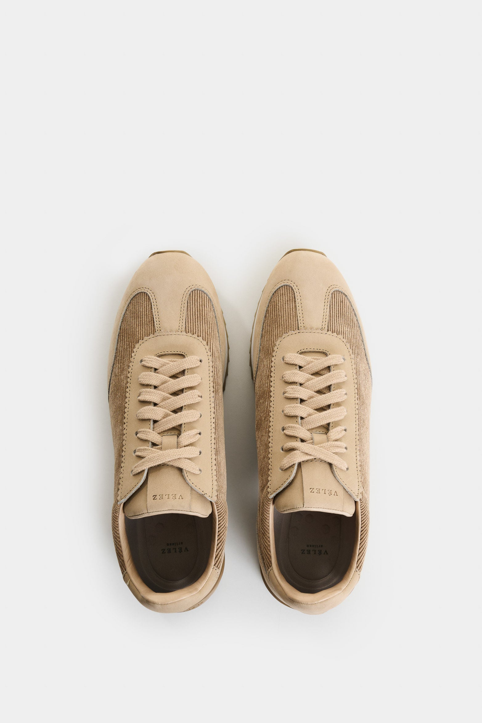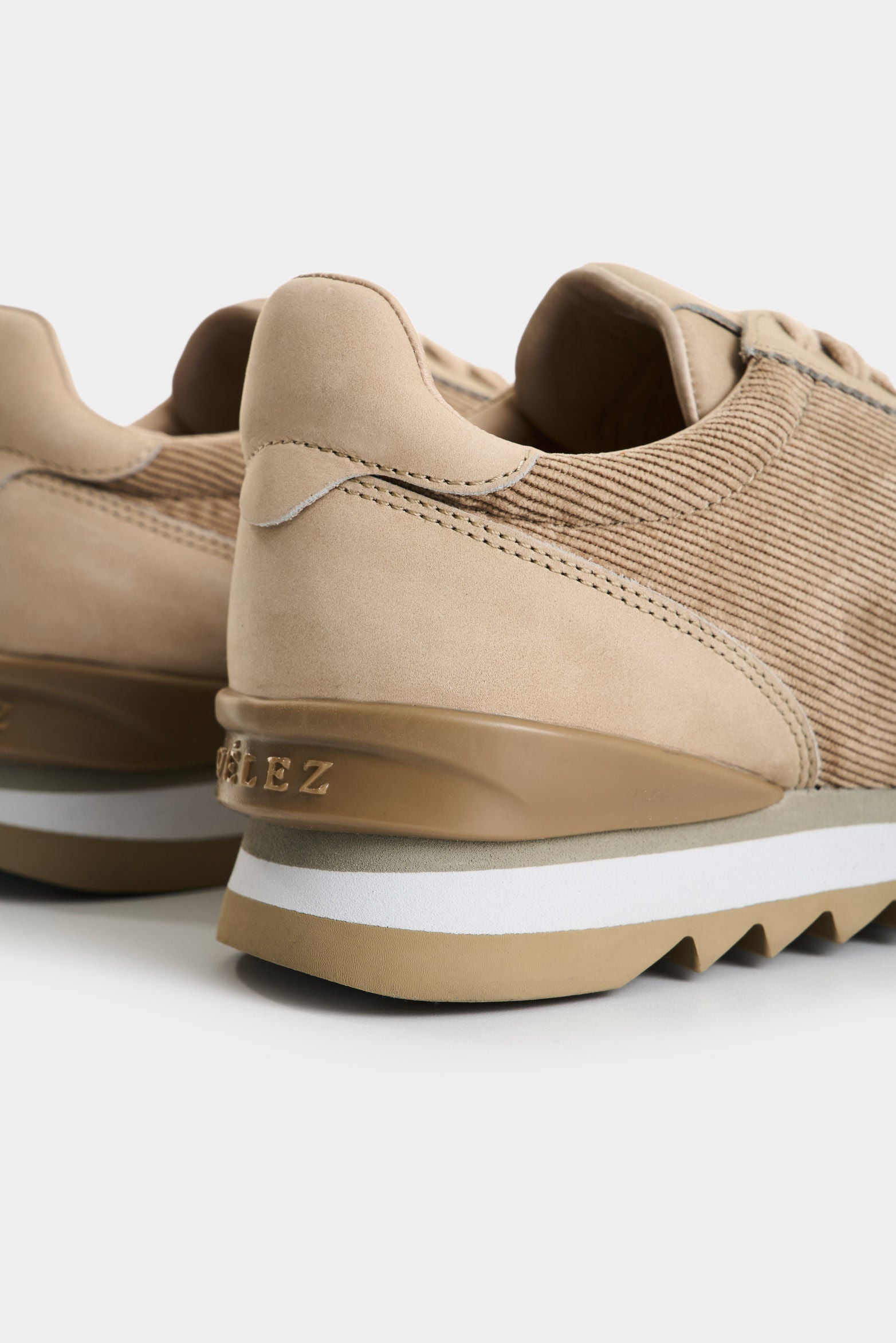 Energy and movement in every step. These sneakers blend fresh materials with precise techniques to achieve a perfect balance between flexibility and support. The corduroy textile and leather provide texture and structure, while the bicolor EVA sole with a natural rubber tread ensures comfort and traction. A lightweight, dynamic silhouette that adapts effortlessly to any occasion elevating each step with authenticity.