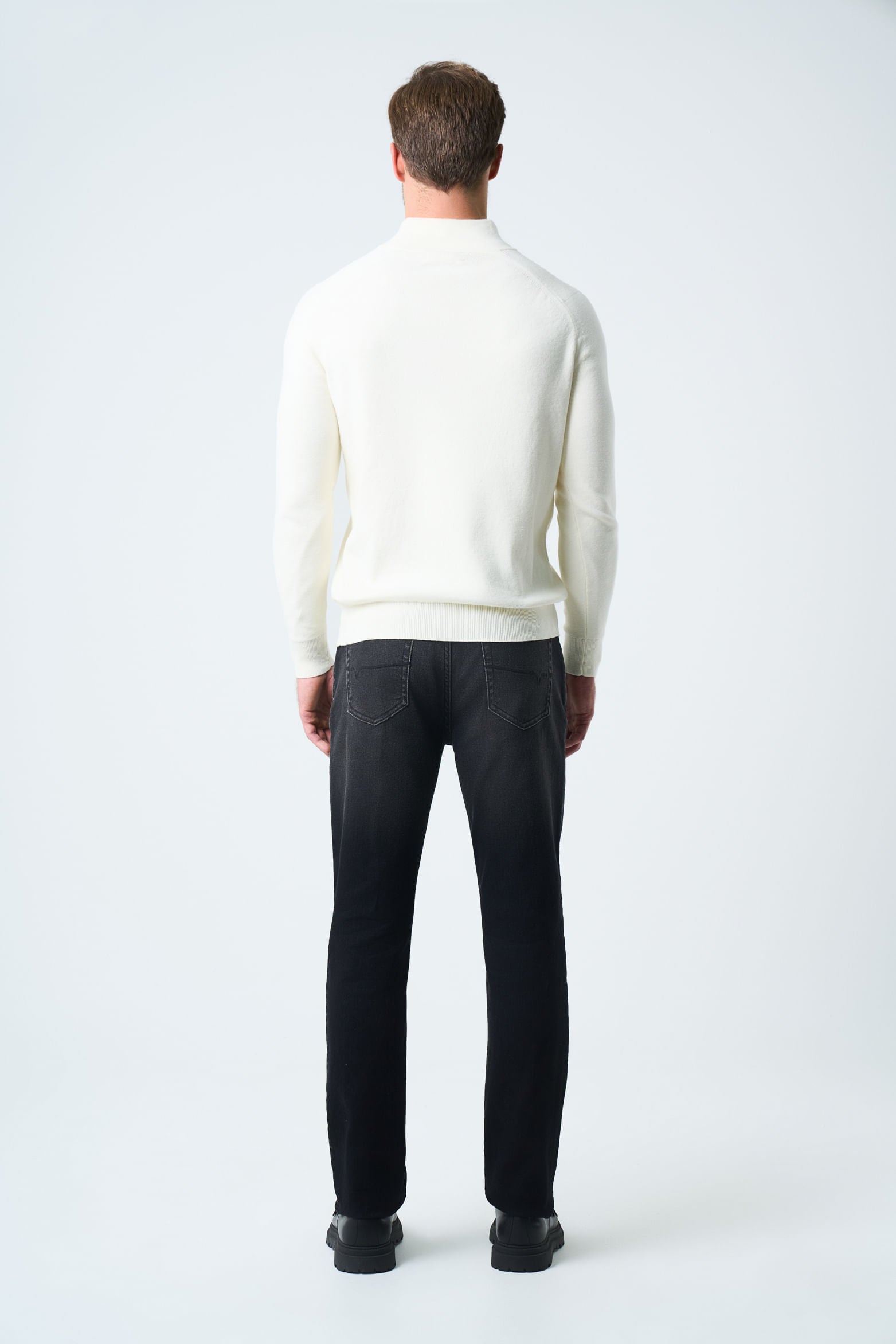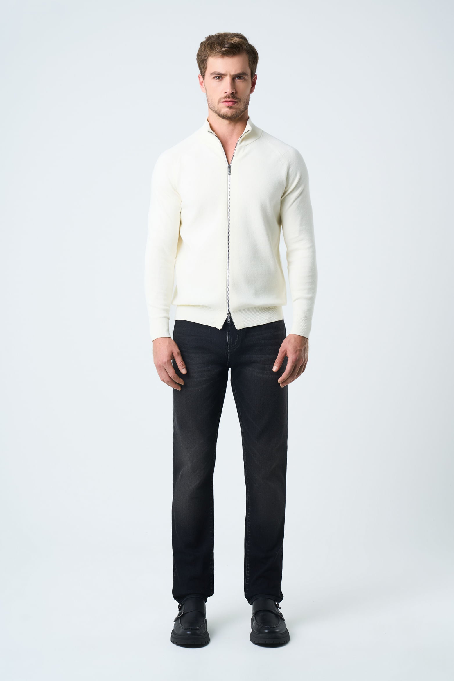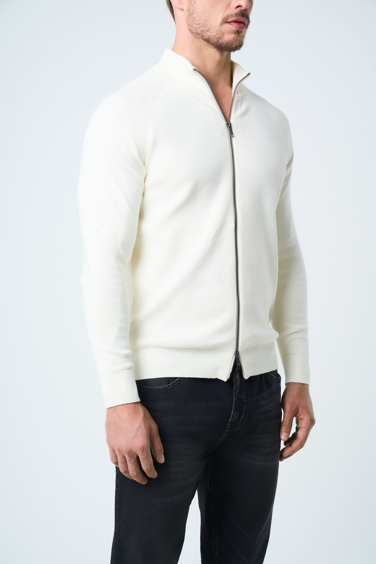 Accessories that stand out for their texture and design, elevating any occasion. Our lightweight knit unicolor sweater features raglan sleeves and a high neck that add sophistication, with an innovative ribbed shoulder detail that breaks the mold. Its semi-fitted silhouette and functional front zipper ensure comfort and versatility. This sweater is perfect for pairing with jeans and sneakers, creating casual and stylish looks, making it an indispensable piece in your wardrobe.