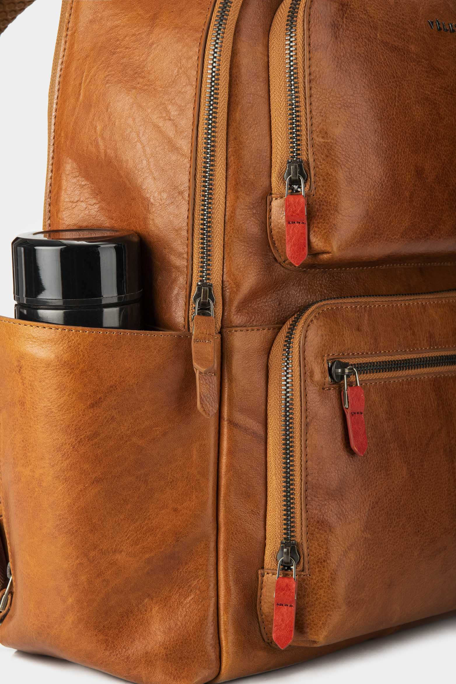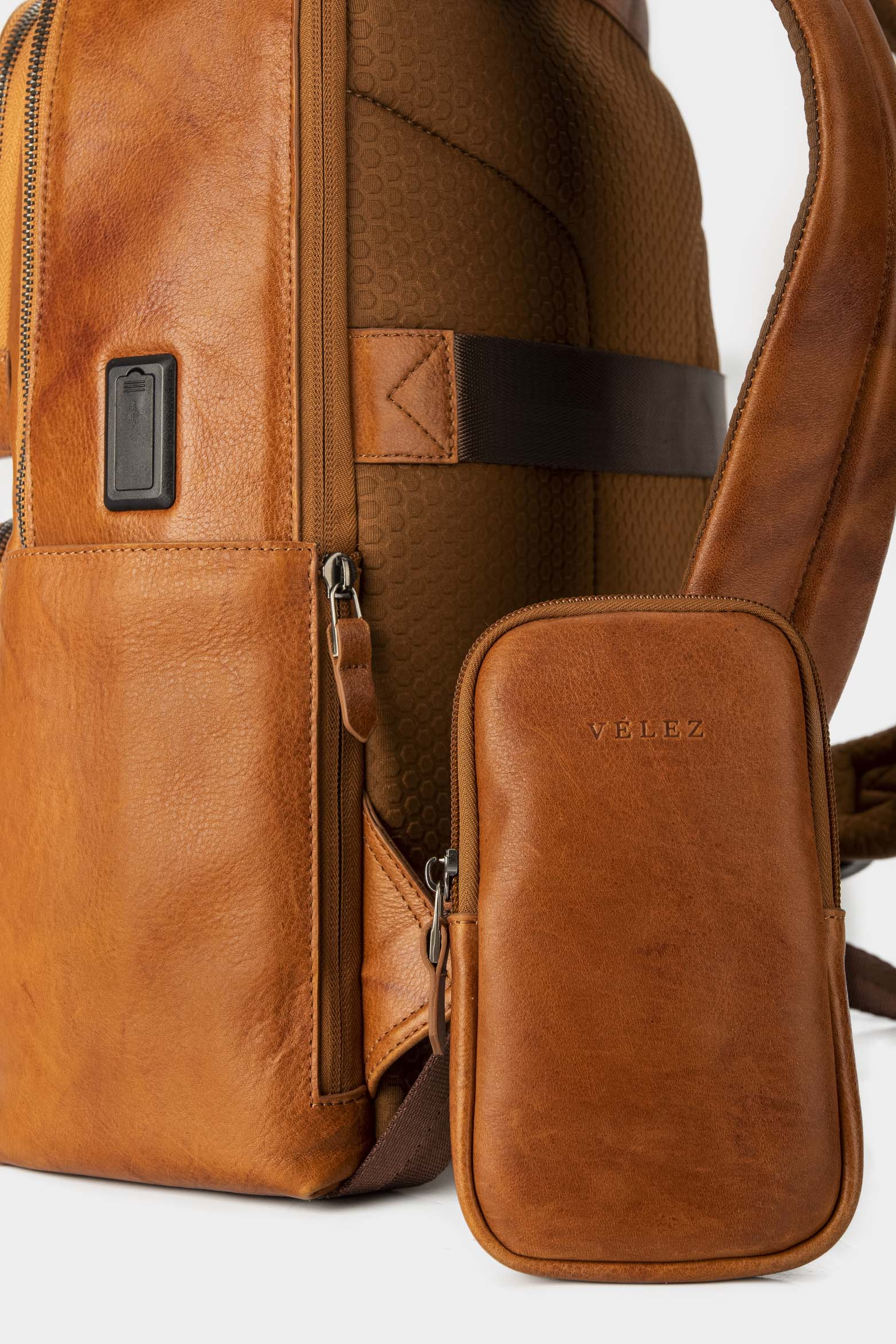 Our smooth leather backpack with a natural shine features a soft-touch finish and color-accented panels. Designed for versatility, it includes two front zip pockets with metallic closures, a spacious main compartment with internal pockets, and bold contrast detailing. It also comes with a built-in USB port on the side and a detachable pouch with a carabiner clip, ideal for carrying essentials on the go.