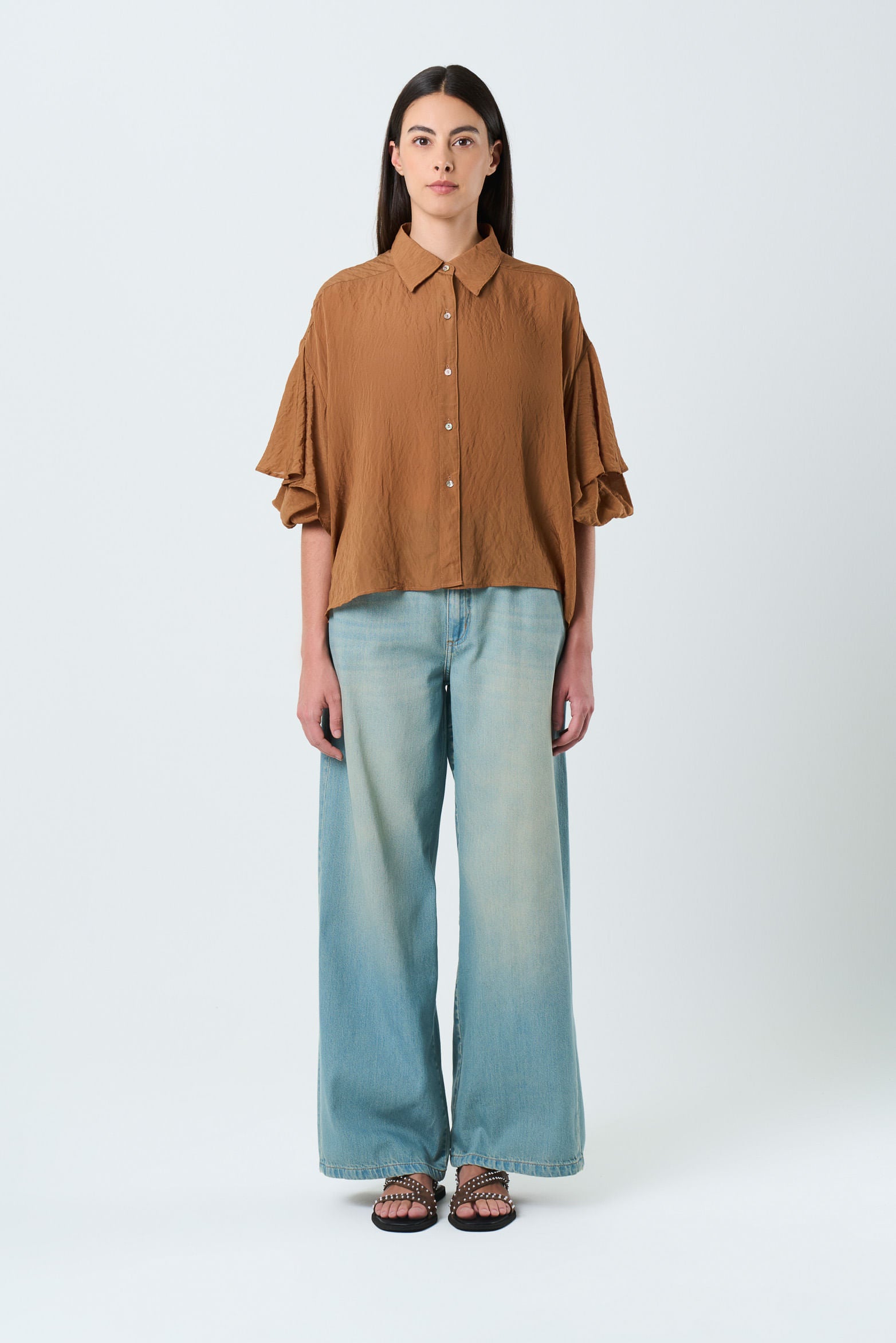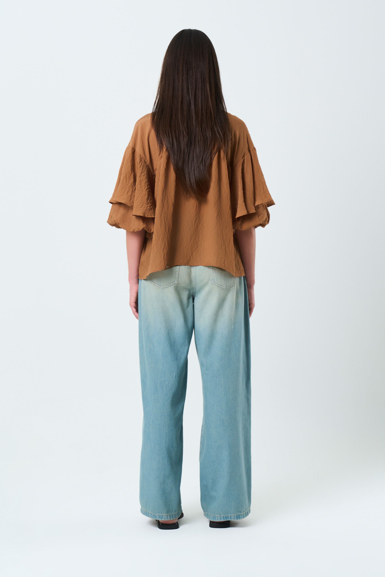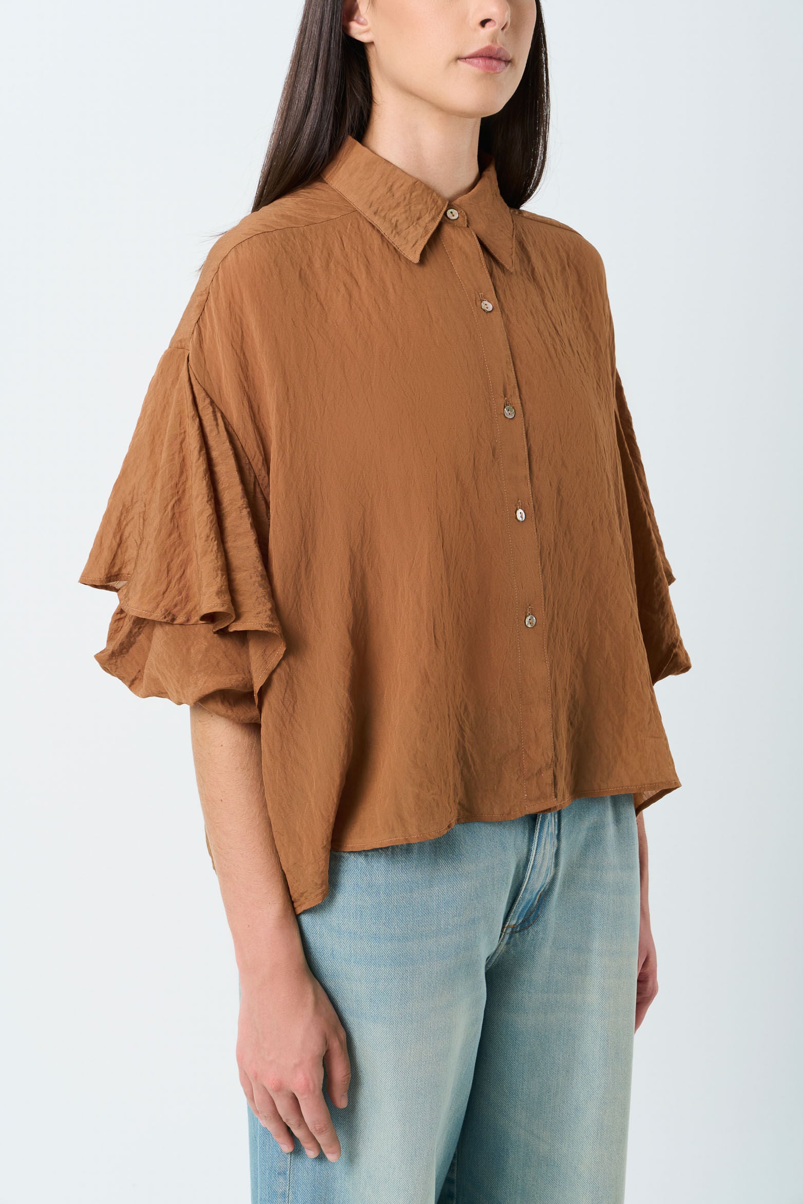 Romantic and flowing, this blouse combines voluminous shapes with character, highlighting a sophisticated femininity and classic charm. Its sheer design and balloon sleeves evoke a delicate, bohemian style, perfect for pairing with jeans or maxi skirts. Every detail, from the V-neckline to the overlaid boleros, adds a boho touch ideal for any occasion.