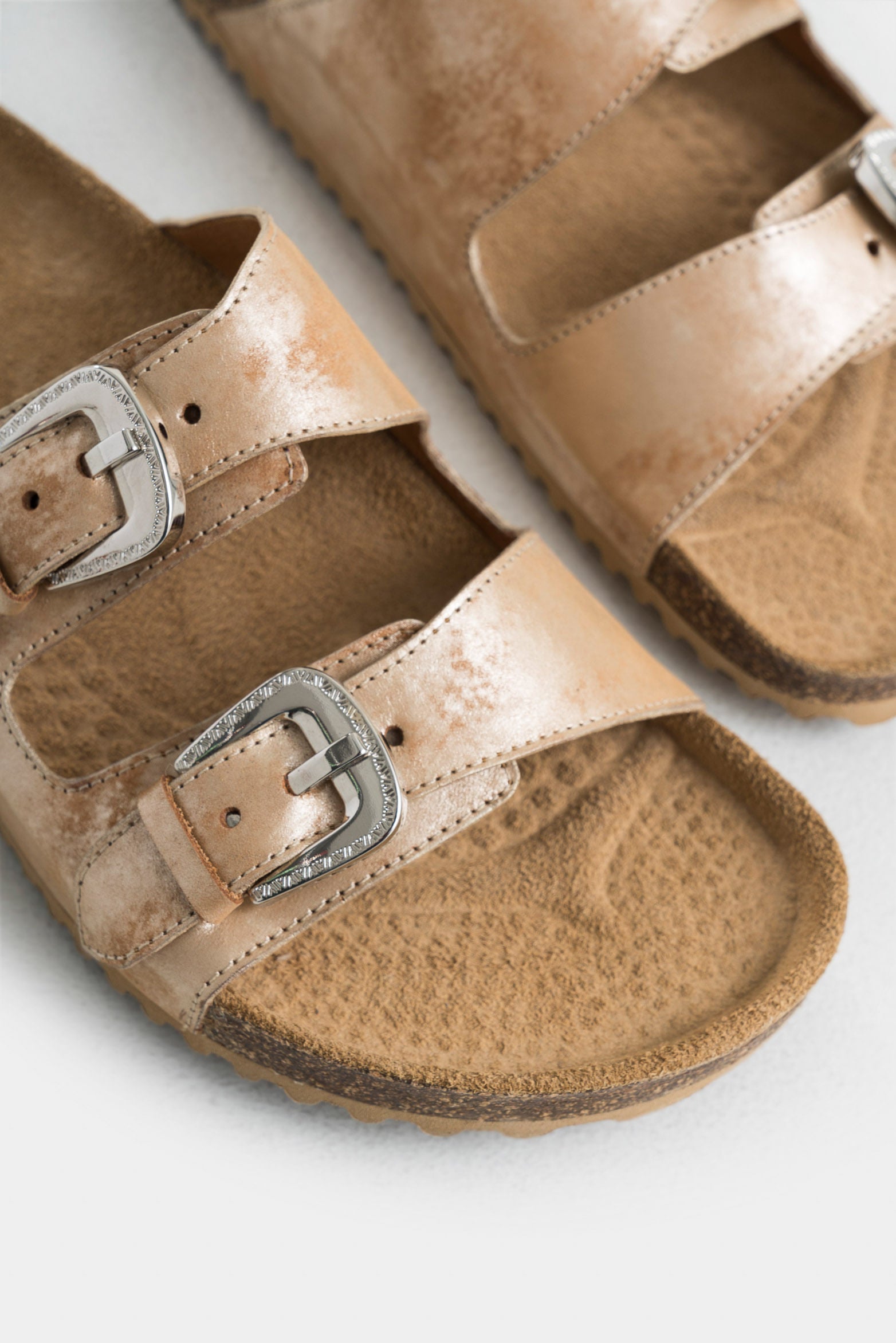Our handcrafted foil leather sandals are made for the spontaneous, travel-loving woman—bringing style and lightness to every step. Authenticity meets comfort in this unique design, where the adjustable strap with metallic buckle pairs with an anatomical cork sole for maximum comfort. The EVA treaded outsole enhances the organic texture, adding a boho-chic and exclusive touch. Travel, explore, discover.