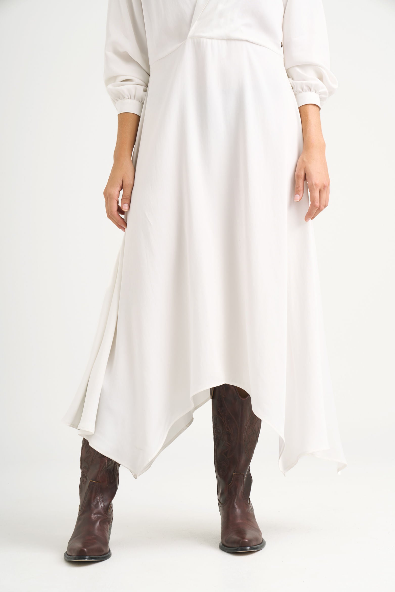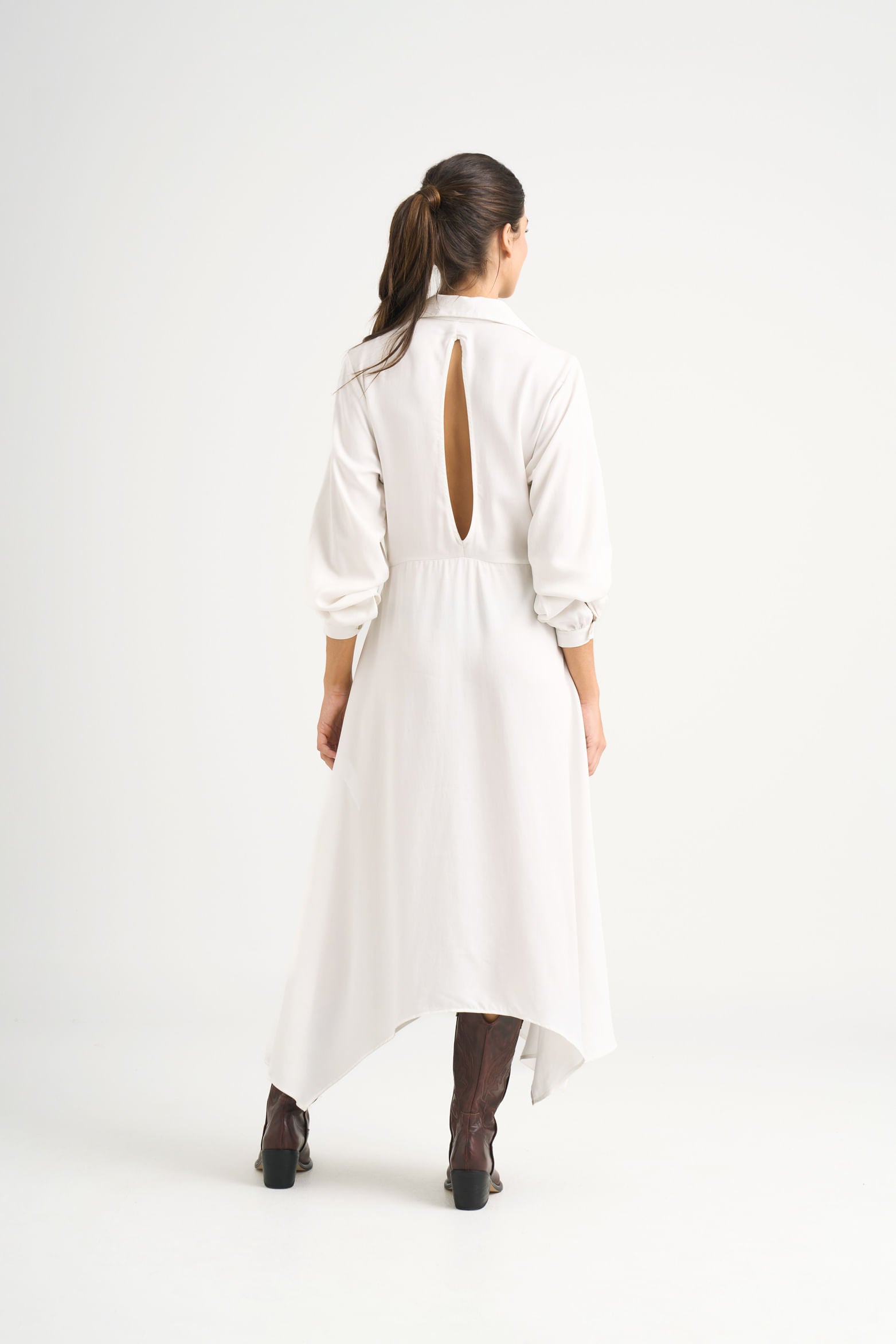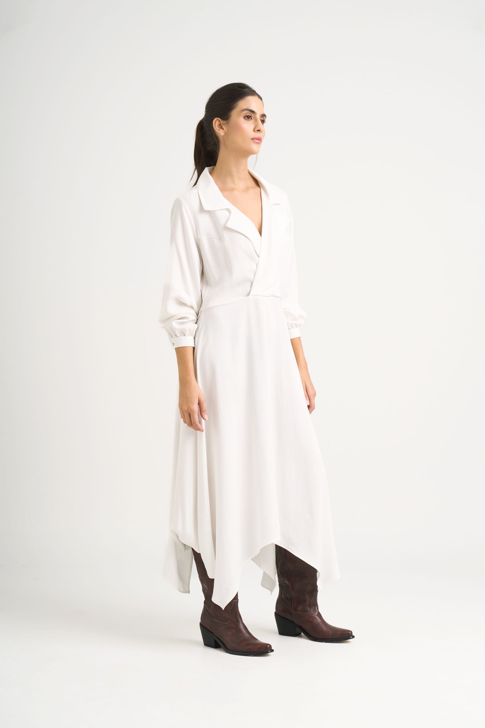 This midi dress, with an asymmetric silhouette, stands out for its lapel collar and front cross panels, ideal for formal events paired with heeled sandals or even Texan boots for a more casual impact. The combination of a delicate waist with long sleeves finished in cuffs adds a touch of classic style. The internal back zip provides perfect fit and comfort, making this dress a versatile and elegant piece for your exceptional occasions.