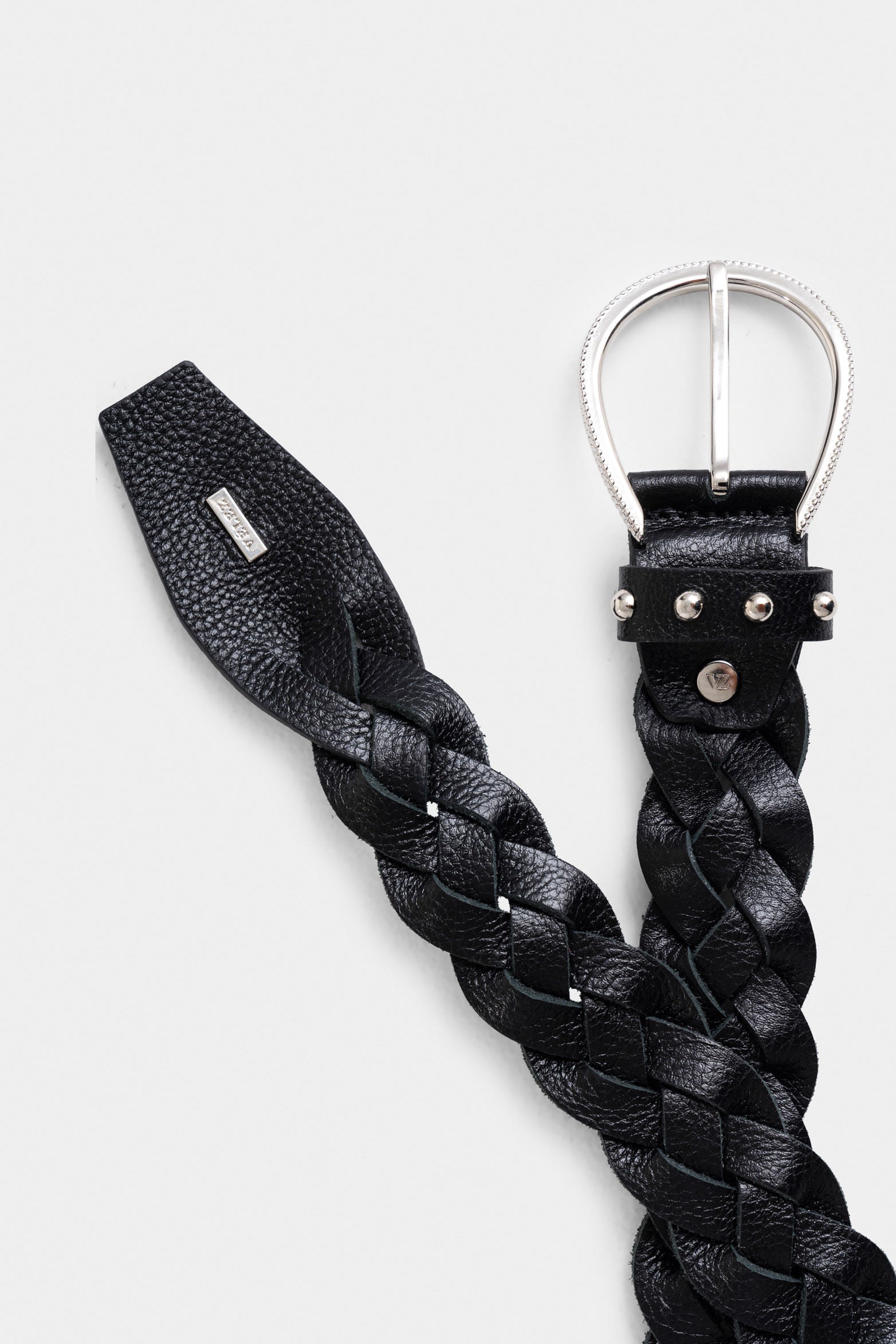 An exquisite fusion of tradition and avant-garde, our leather belt with a fine grain is a statement of satisfaction. Its timeless materials and luxurious details, like the braided strap and metallic studded pass-through, evoke ancestral artisan techniques. The hexagonal buckle and metallic accents enhance its elegance. It's the perfect complement to enhance any look with a contemporary note of distinction.