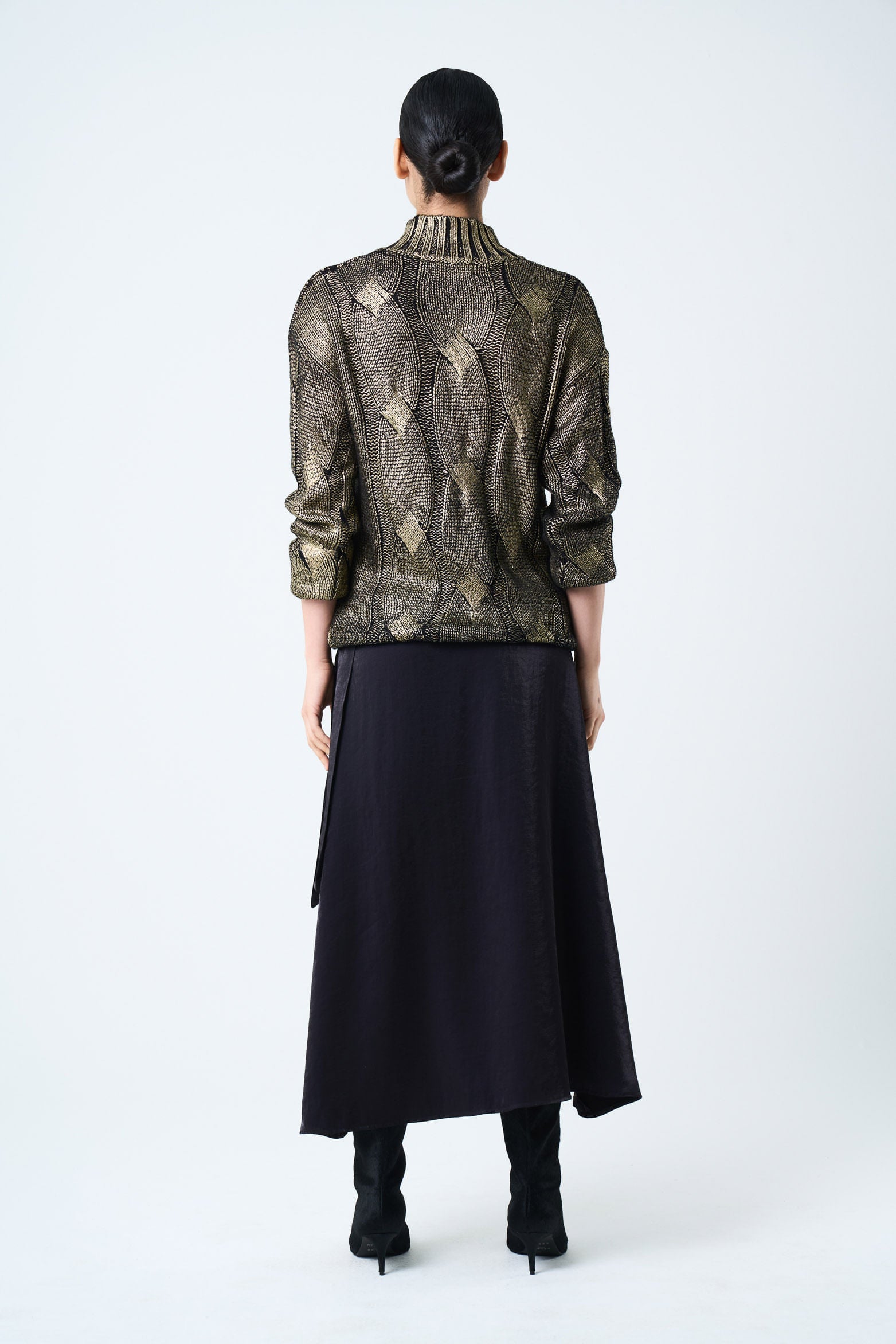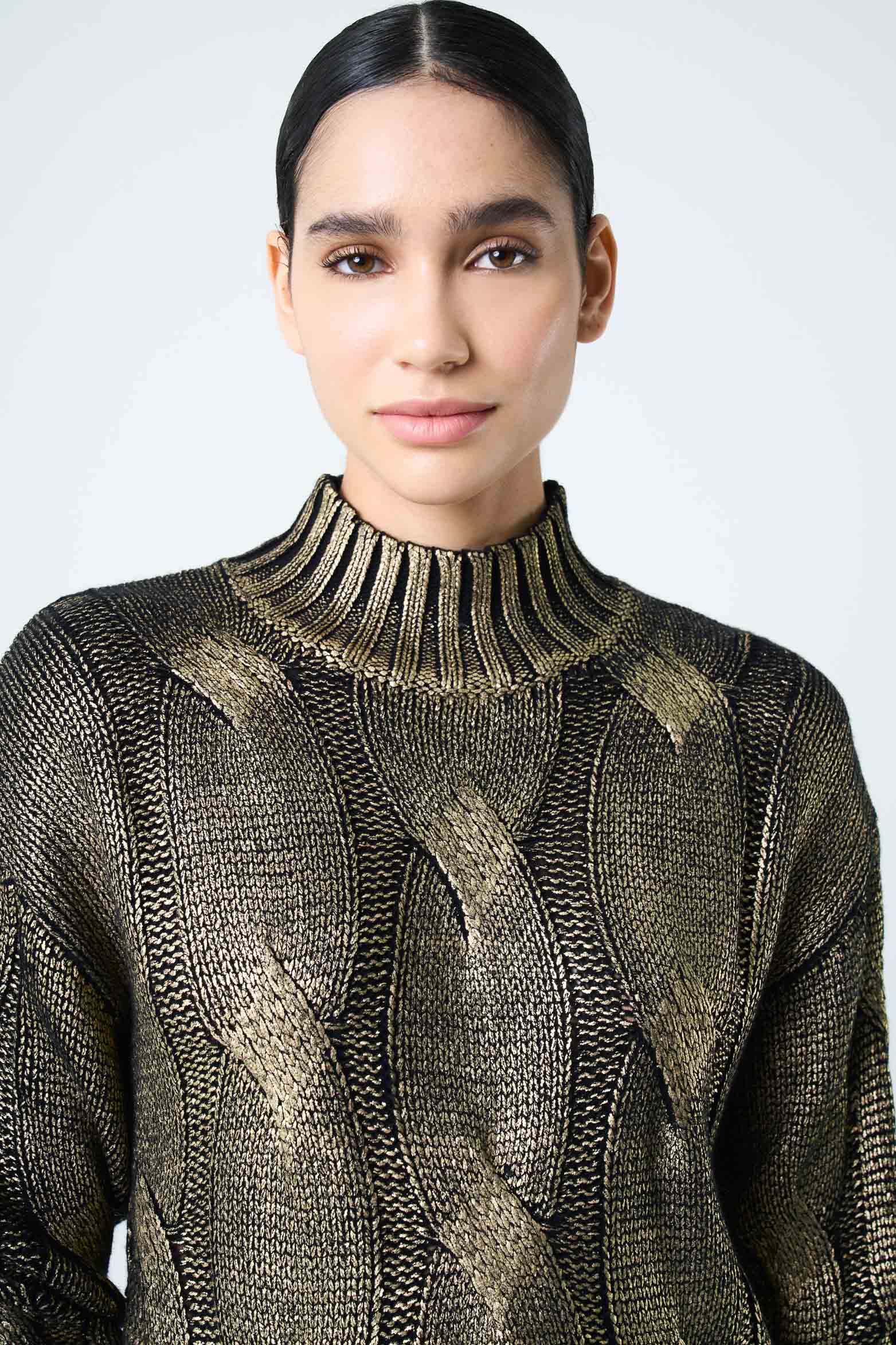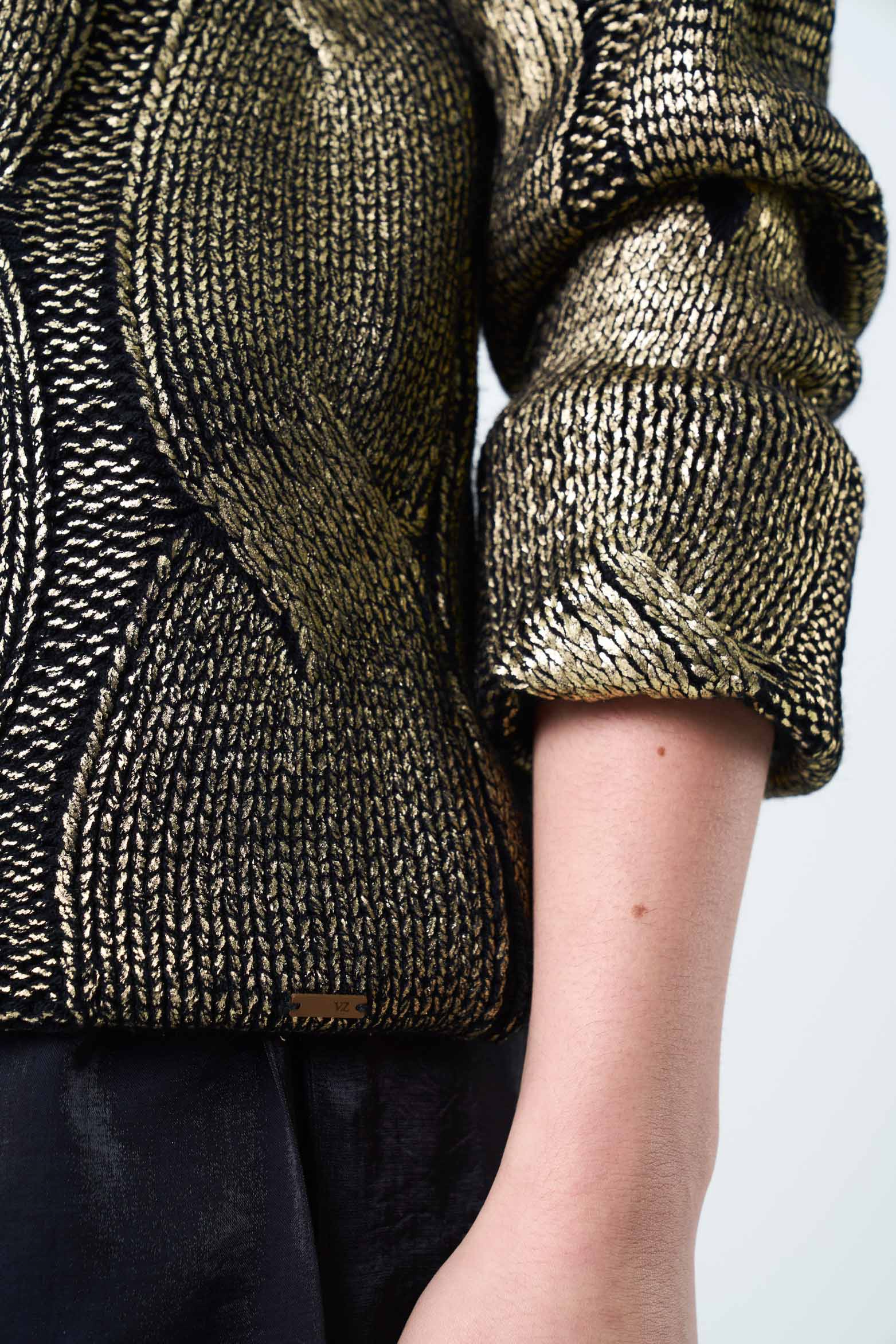 A sweater where every detail tells a story of heritage and sophistication. Its soft knit, adorned with a metallic effect and foil finish, shines with a unique and contemporary touch. The design features a cozy turtleneck and long sleeves, enhanced with ribbed finishes on the neck, cuffs, and hem. More than a garment, it is an expression of luxury and individual style, perfect for adding an artisanal touch of luxury to your wardrobe with its braided texture.