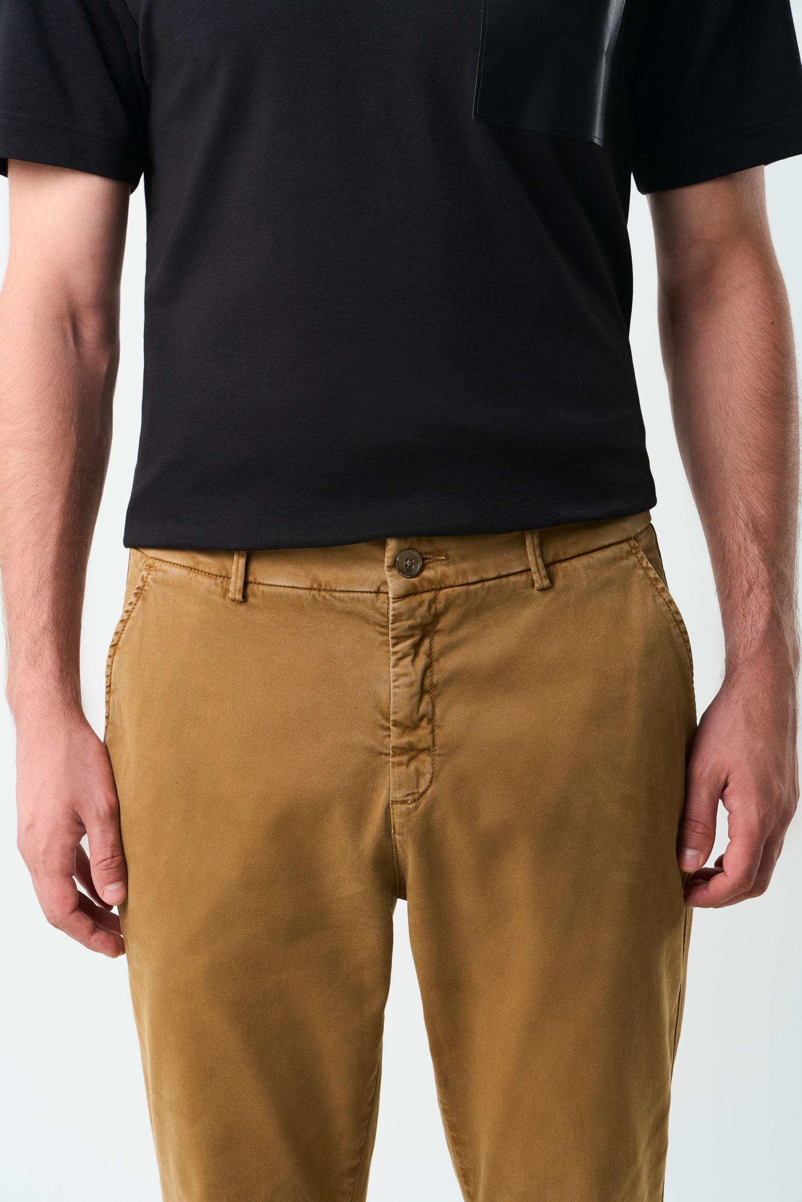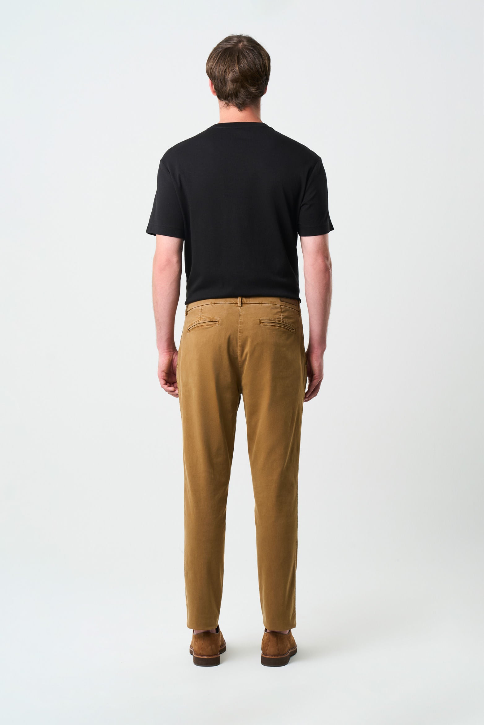 Chino-style trousers crafted from premium stretch fabric and artisanally dyed, featuring a slim fit, semi-fitted leg opening, two side pockets, and two welt pockets at the back. With wear and time, these men's trousers develop a vintage look thanks to the friction of the combed yarns that provide a subtle sheen. This versatile piece will be a valuable addition to your wardrobe, pairing effortlessly with various footwear styles for both casual and formal occasions.