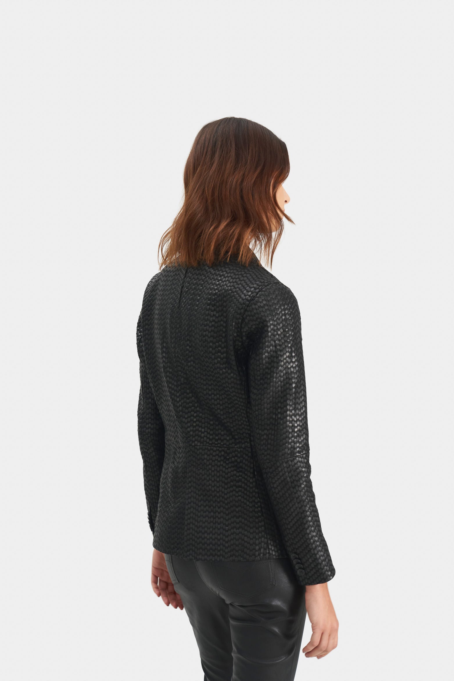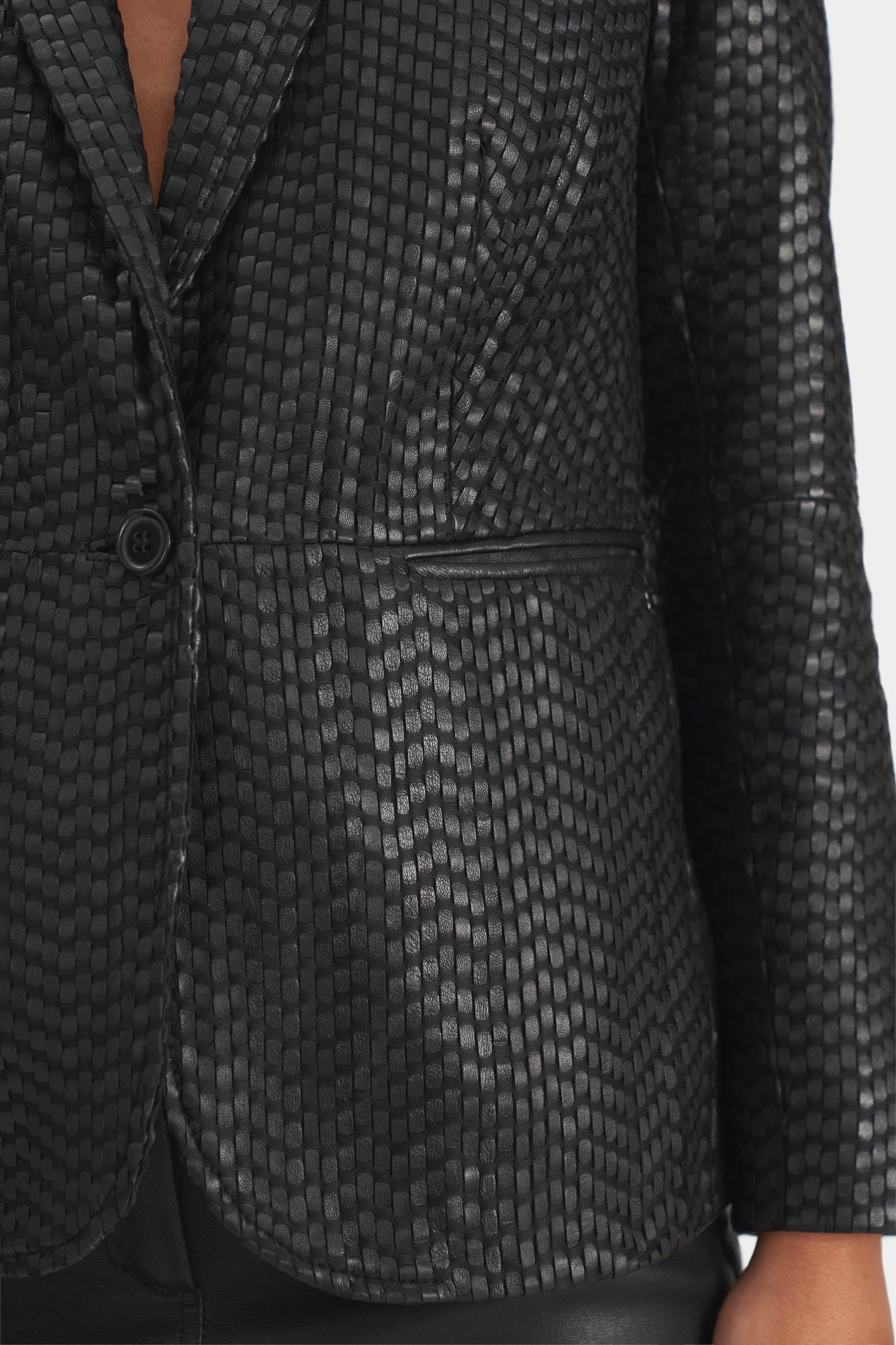 Traditional silhouettes are reimagined in the fashion world through details that add value to their lines and cuts. Our semi-loose fit blazer, crafted in leather, enhances the classic lapel collar and welt pocket design through the artisanal quality of its handwoven texture. Wear it to add character and elegance to your formal looks.
