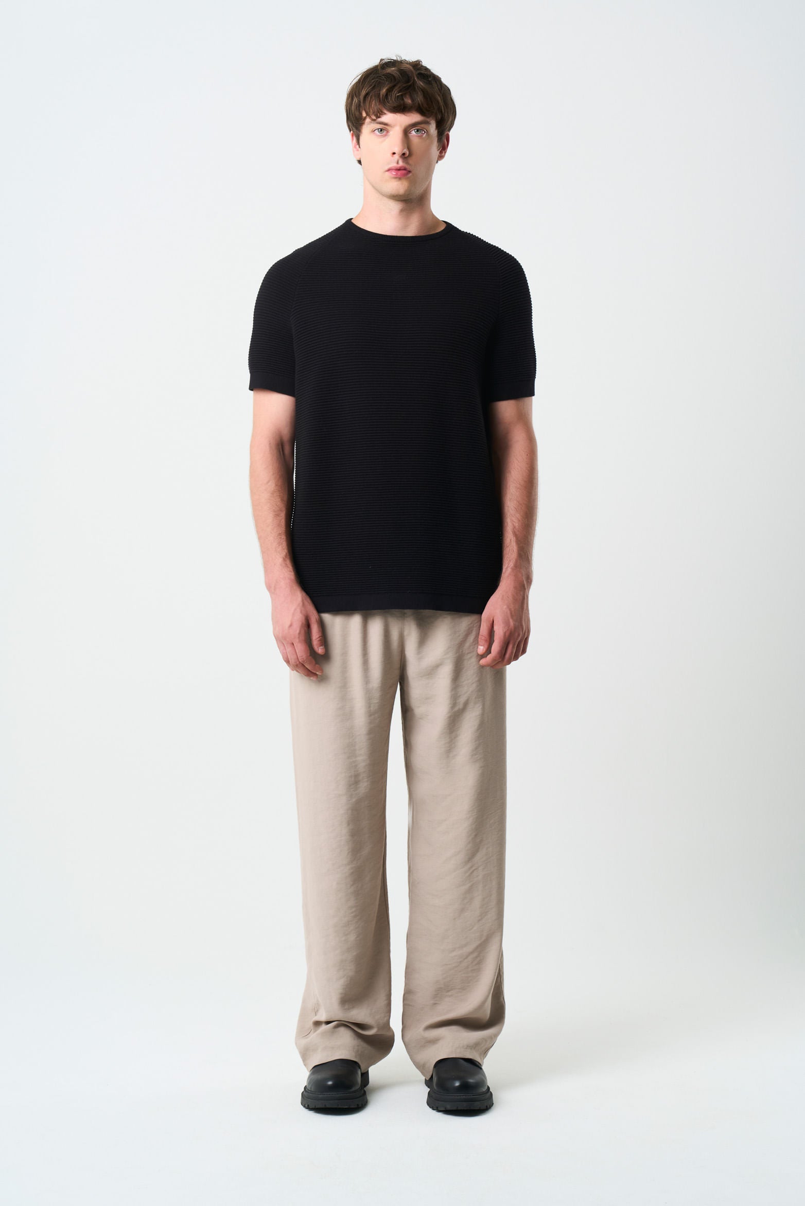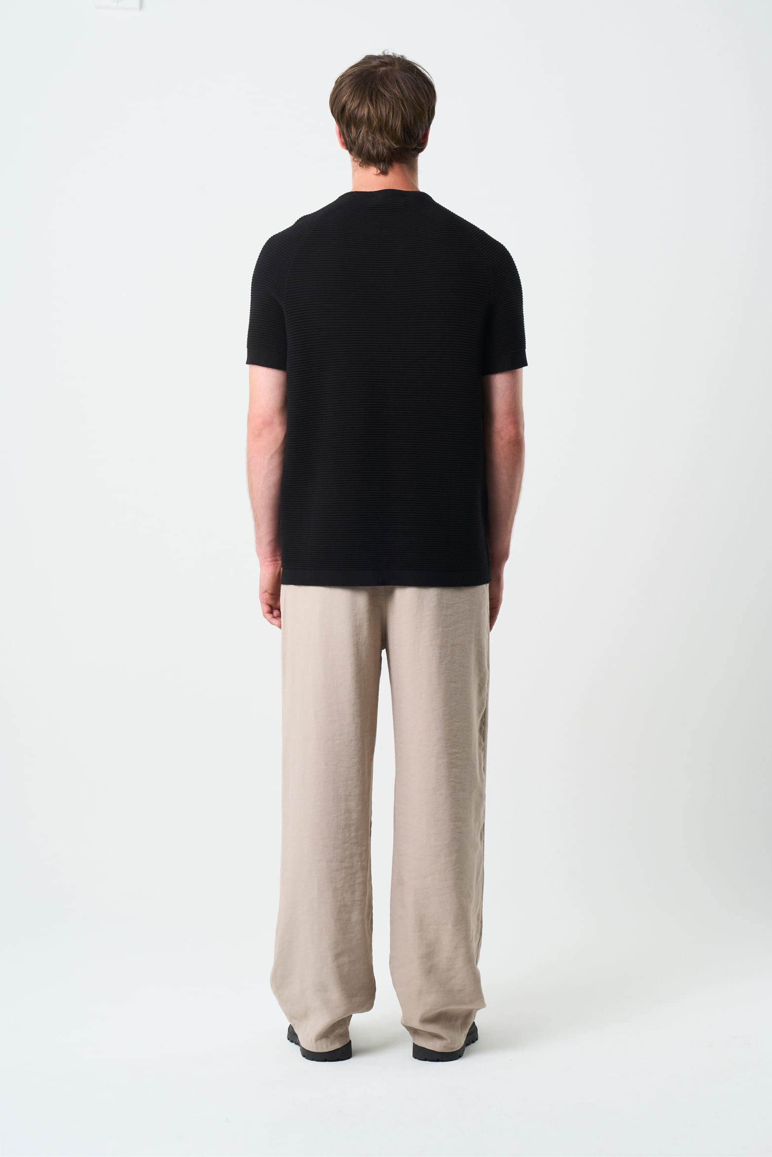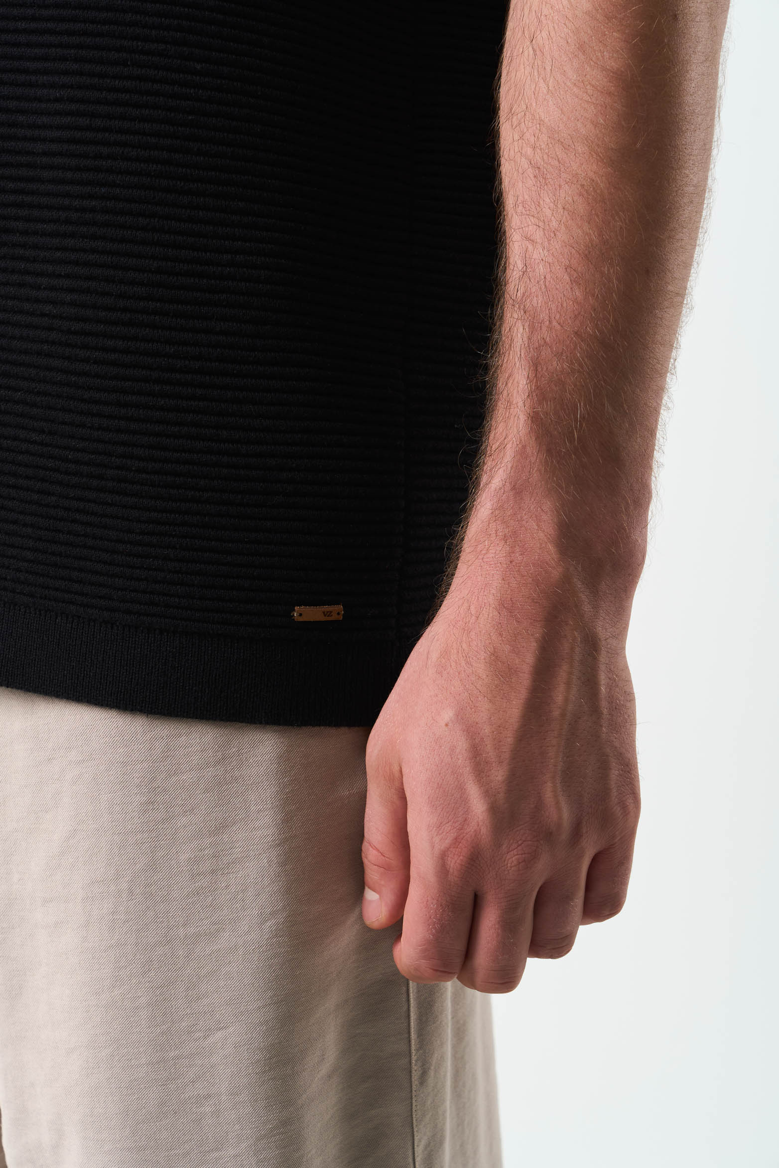 A knit polo shirt that elevates your everyday look with understated luxury and impeccable style. Its textured textile base and semi-fitted silhouette offer a fresh and sophisticated feel in every detail. Perfect for pairing with Bermuda shorts, jeans, or trousers, this piece provides a special and comfortable touch, ideal for elevating a naturally elegant style, whether you're heading to the office or enjoying a weekend outing.