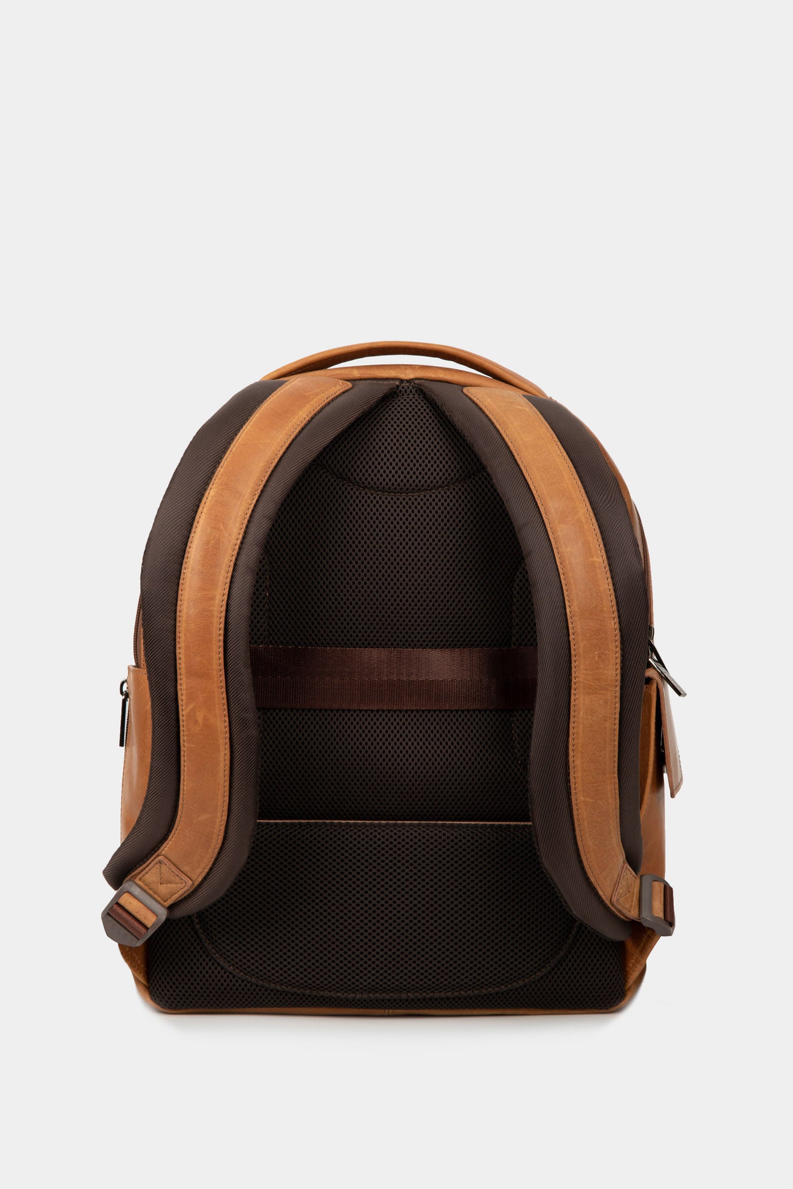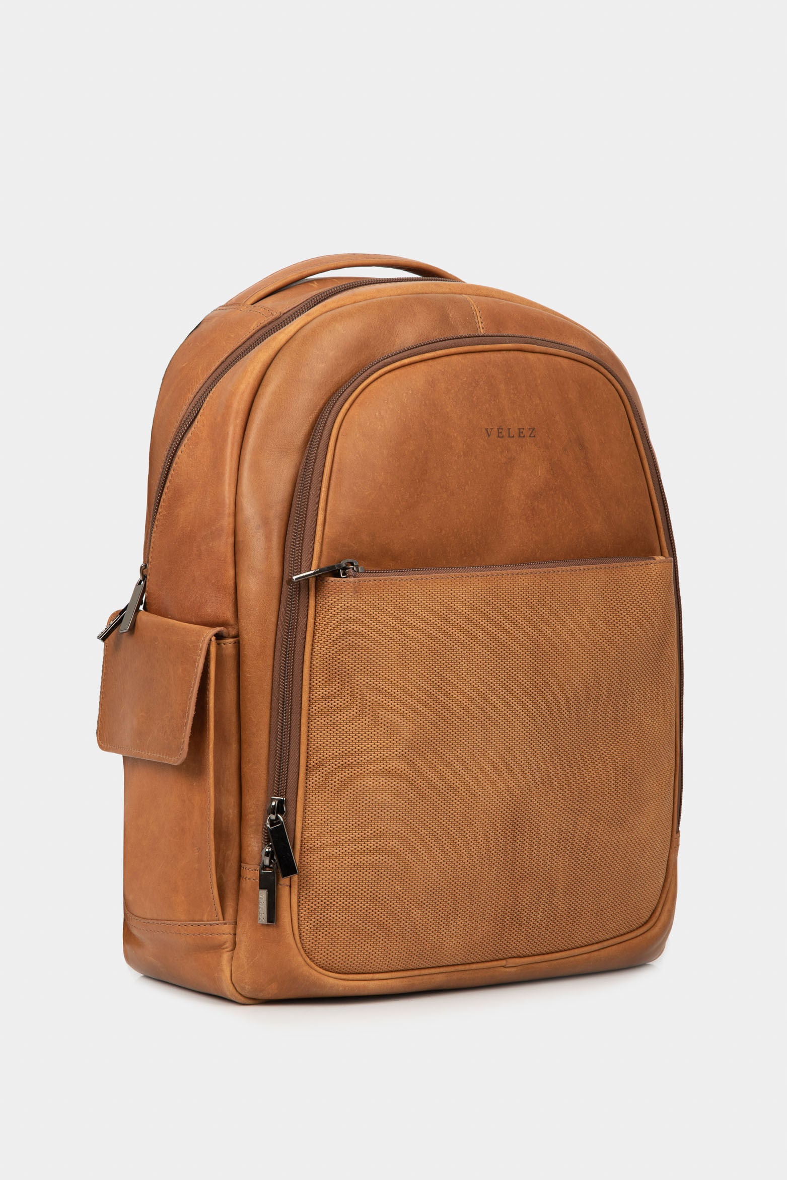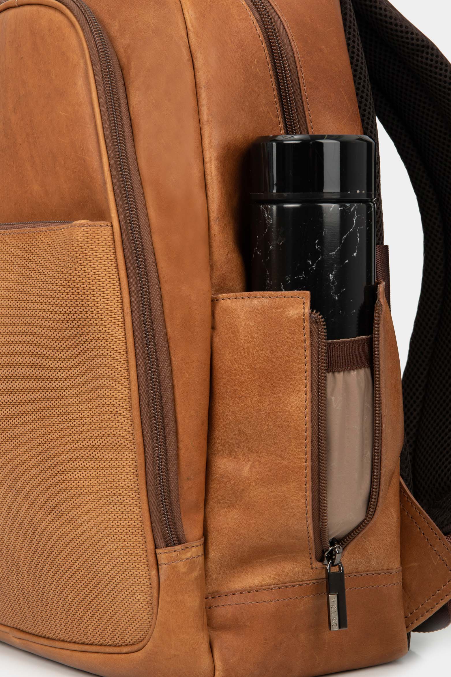 Men’s Tropical leather backpack with a vintage-look and ergonomic and adjustable padded straps; concealed zipper pocket on the bottom of the back trolley strap for luggage; side pocket for thermos, cell phone or bottle; 15” PC and tablet pocket inside; internal compartments for storing small items including pen holders and card holders; front plate detail on quick-access pocket with zipper that keeps items securely stored.