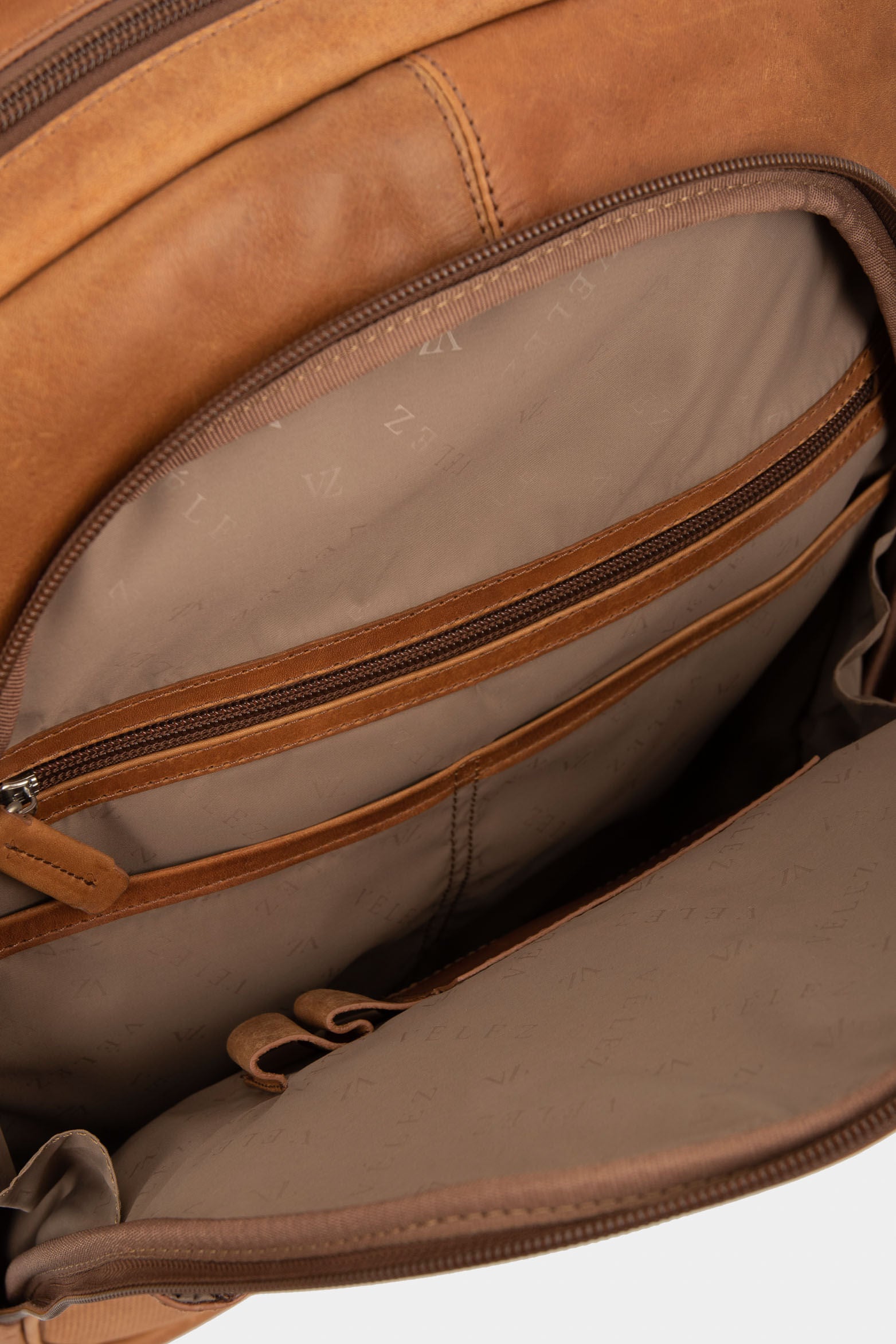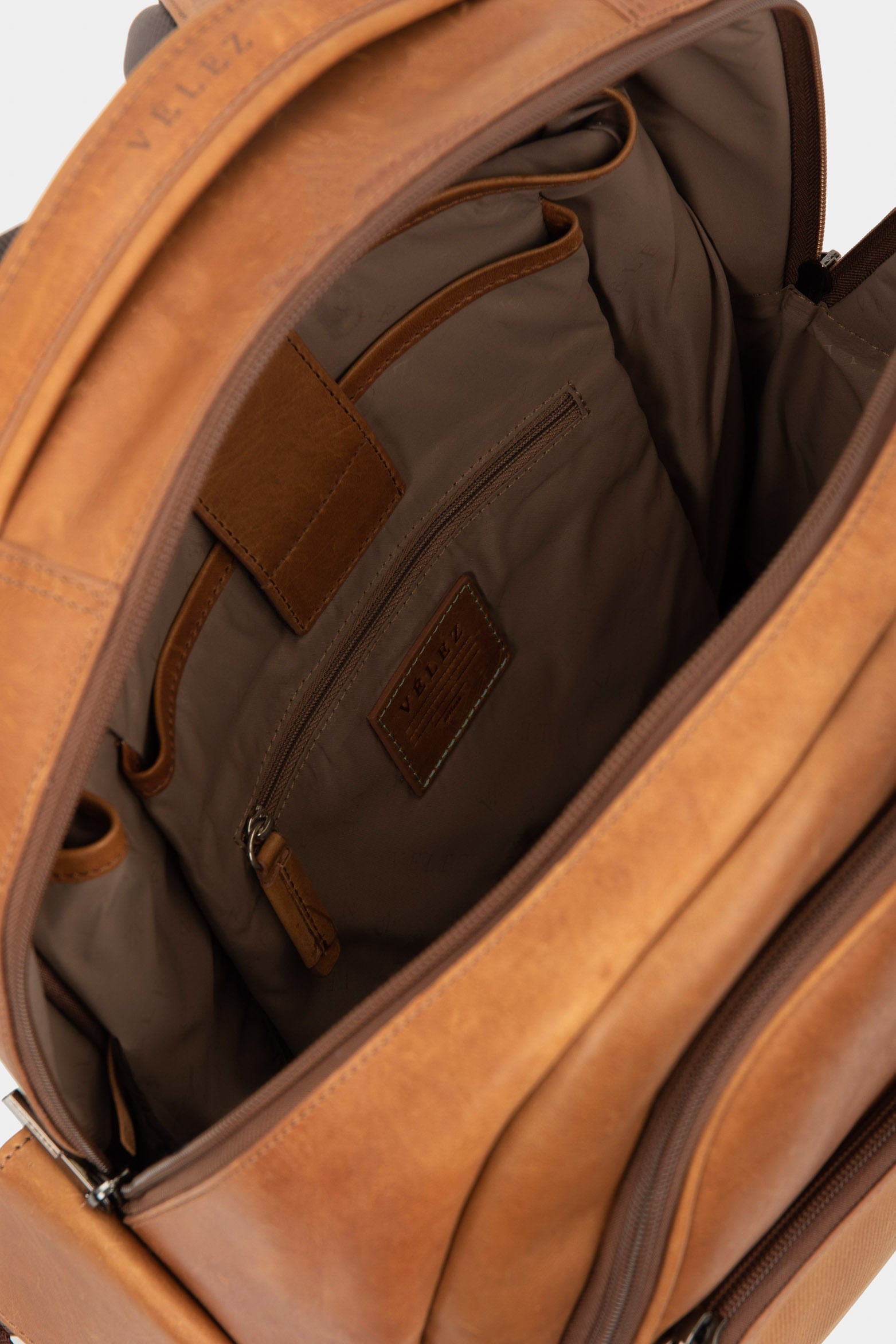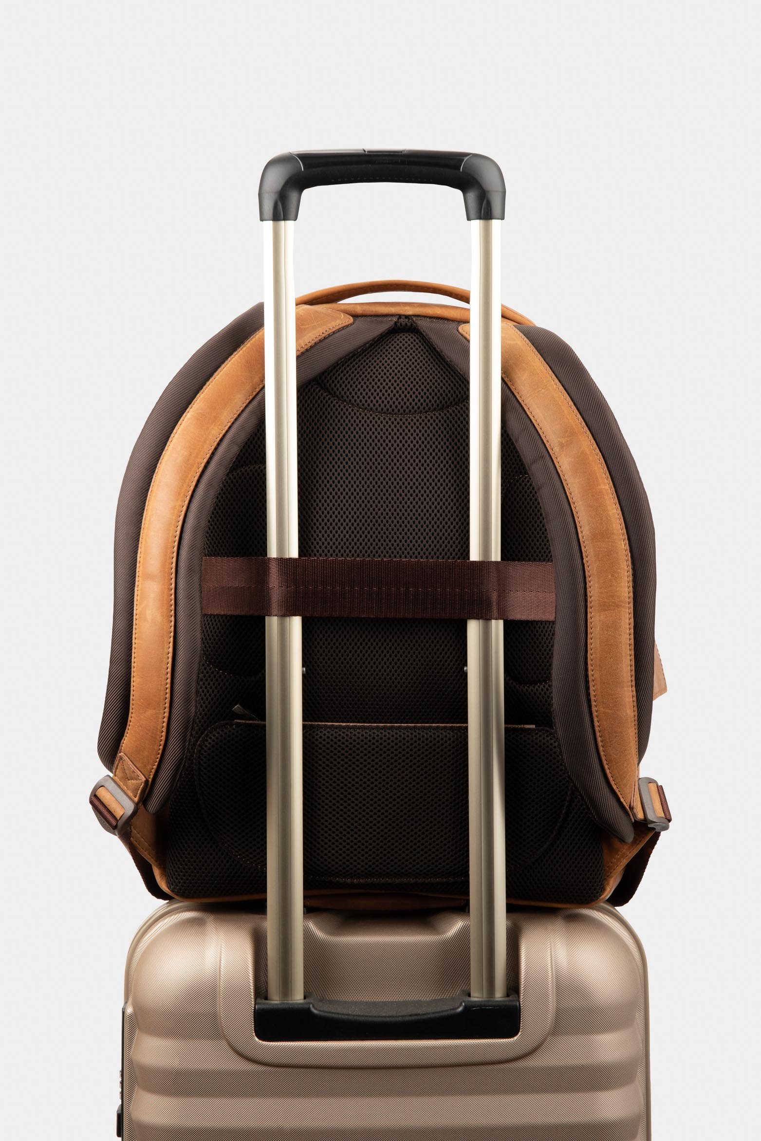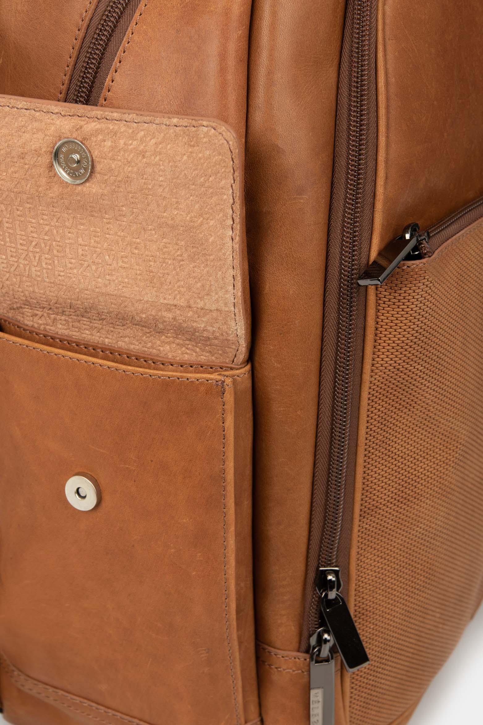Men’s Tropical leather backpack with a vintage-look and ergonomic and adjustable padded straps; concealed zipper pocket on the bottom of the back trolley strap for luggage; side pocket for thermos, cell phone or bottle; 15” PC and tablet pocket inside; internal compartments for storing small items including pen holders and card holders; front plate detail on quick-access pocket with zipper that keeps items securely stored.