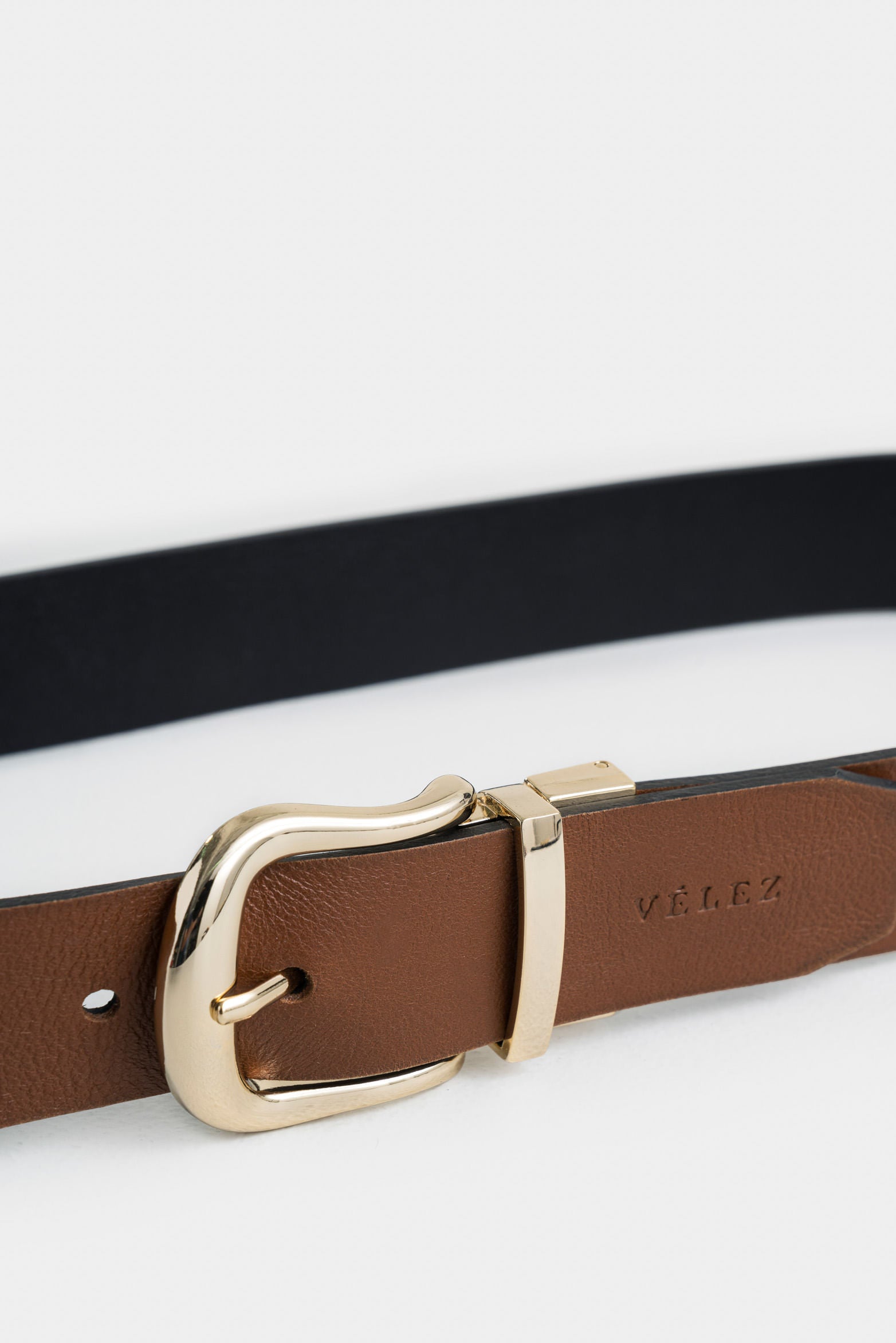 Our double-sided Tropical New 2.0 belt is versatile and sophisticated; it combines elegance and durability. With its hexagonal buckle and distinctive Vélez metallic applique, this belt combines two colors in one design and is perfect for adding a style touch to any outfit, whether formal or casual. Crafted from smooth, high-quality leather, it’s a long-lasting element with an impeccable aspect. Its modern and timeless design makes it an ideal accessory for any occasion, elevating the creativity of your daily outfits.
