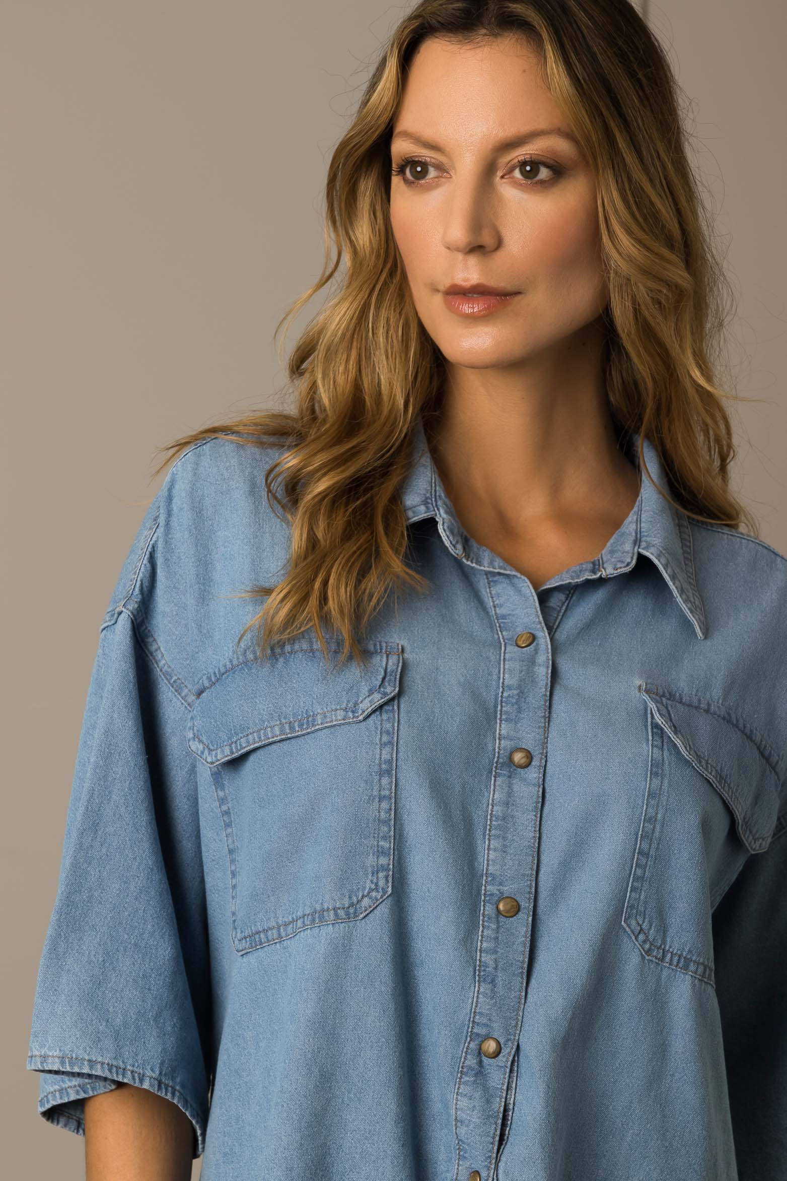 A fusion of sporty vibes with an on-trend textile base, our unisex oversized shirt made from denim is the perfect essential. Its three-quarter sleeves, wide cuffs and front flap pockets make this a versatile piece that can be worn with casual looks. Wear it with high-rise slim pants, sneakers and a jacket that highlights your style.