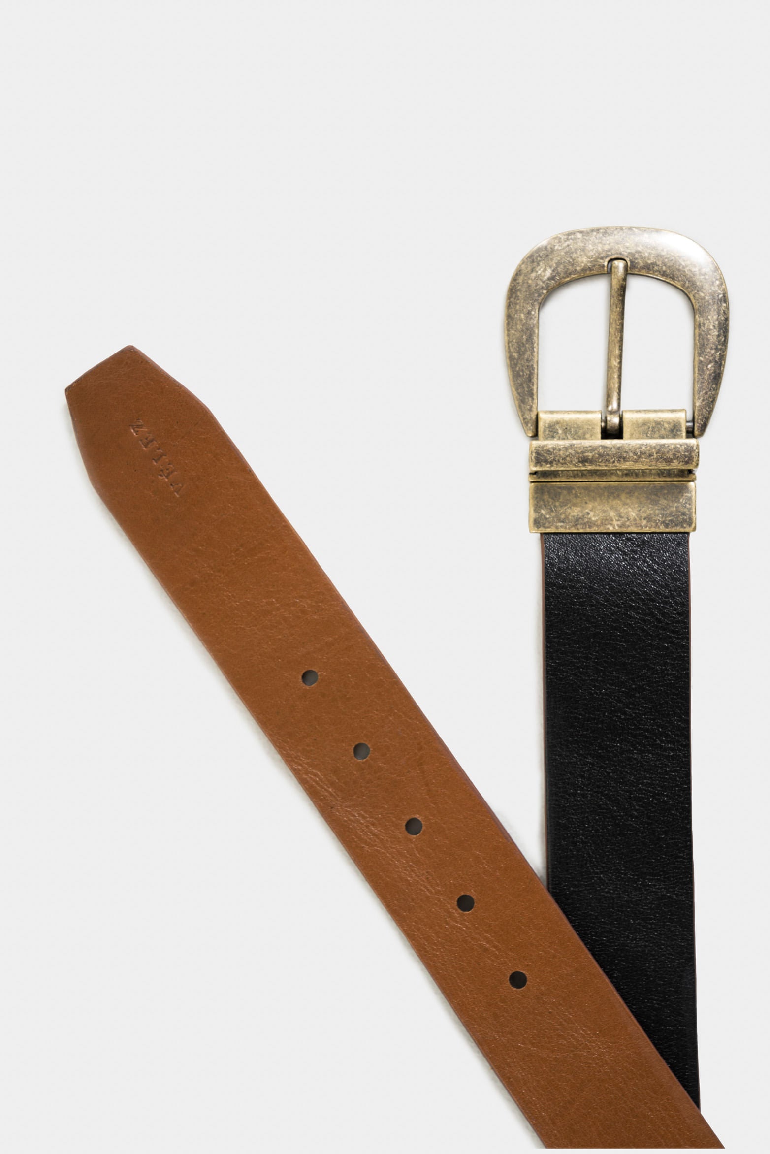 With a sophisticated and timeless design, our double-sided smooth leather belt with natural grain is ideal for office looks. Its rustic-finish buckle and hexagonal tip give this piece a refreshed style, making it perfect for complementing your looks with a touch of fashion. You can also have it custom-cut at our Vélez stores.