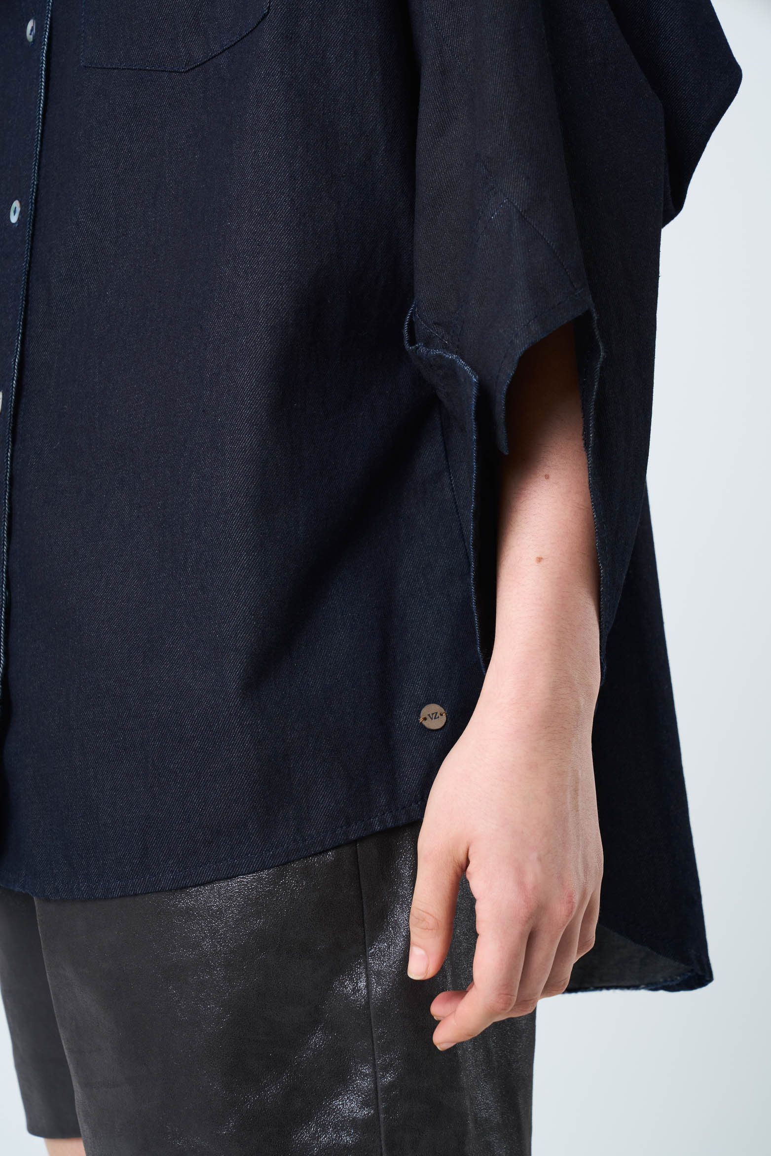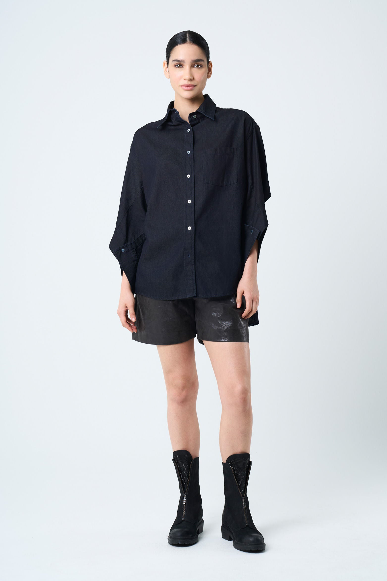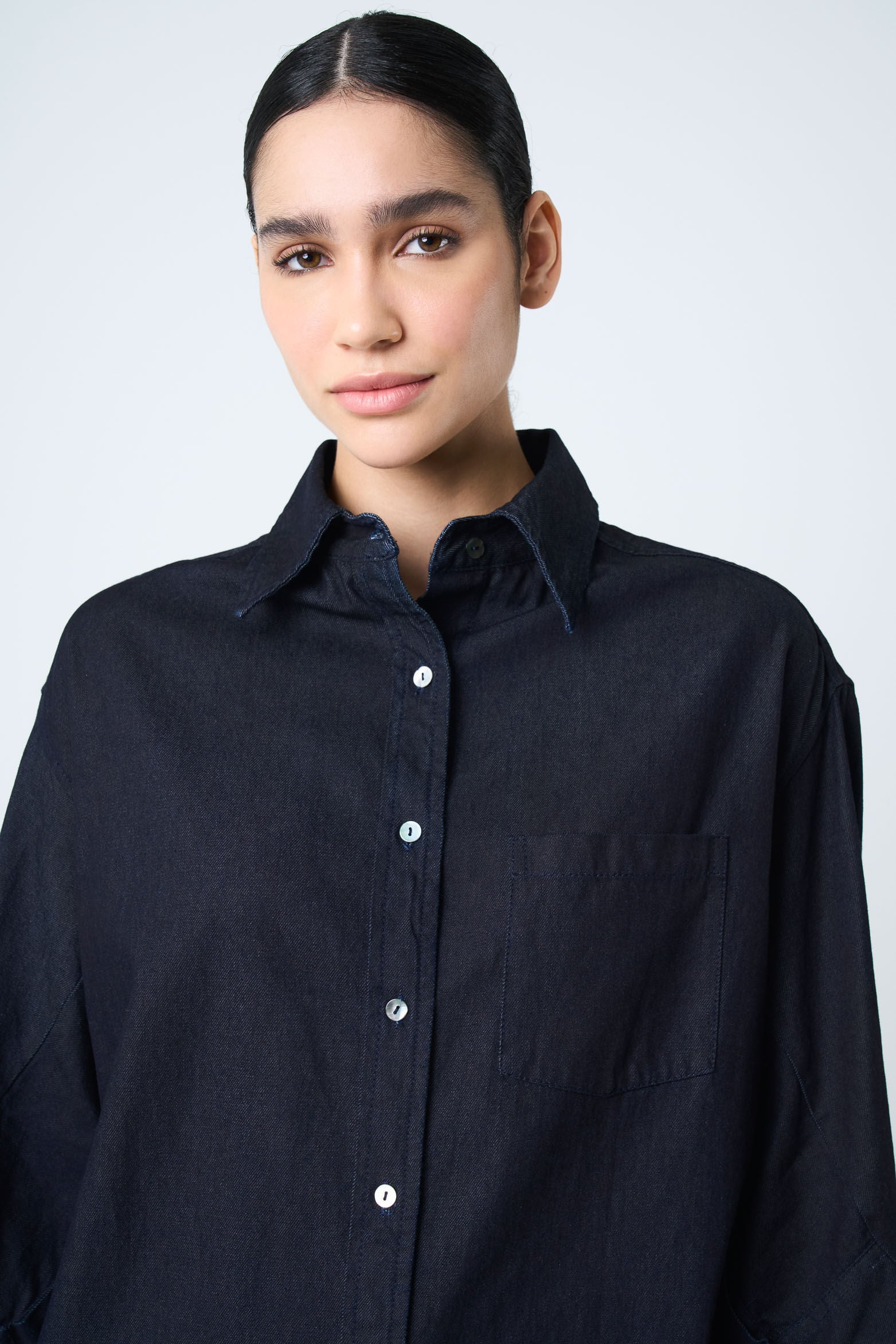 Lightweight and versatile, denim is a classic reinvented every season. Our oversized shirt captures the essence of timelessness with raw textures that evoke artisanal craftsmanship and our handmade legacy. Featuring a fresh design and details like a classic collar and long sleeves with an asymmetrical cut, this piece is perfect for pairing with cowboy boots, adding authenticity and style to your outfit.