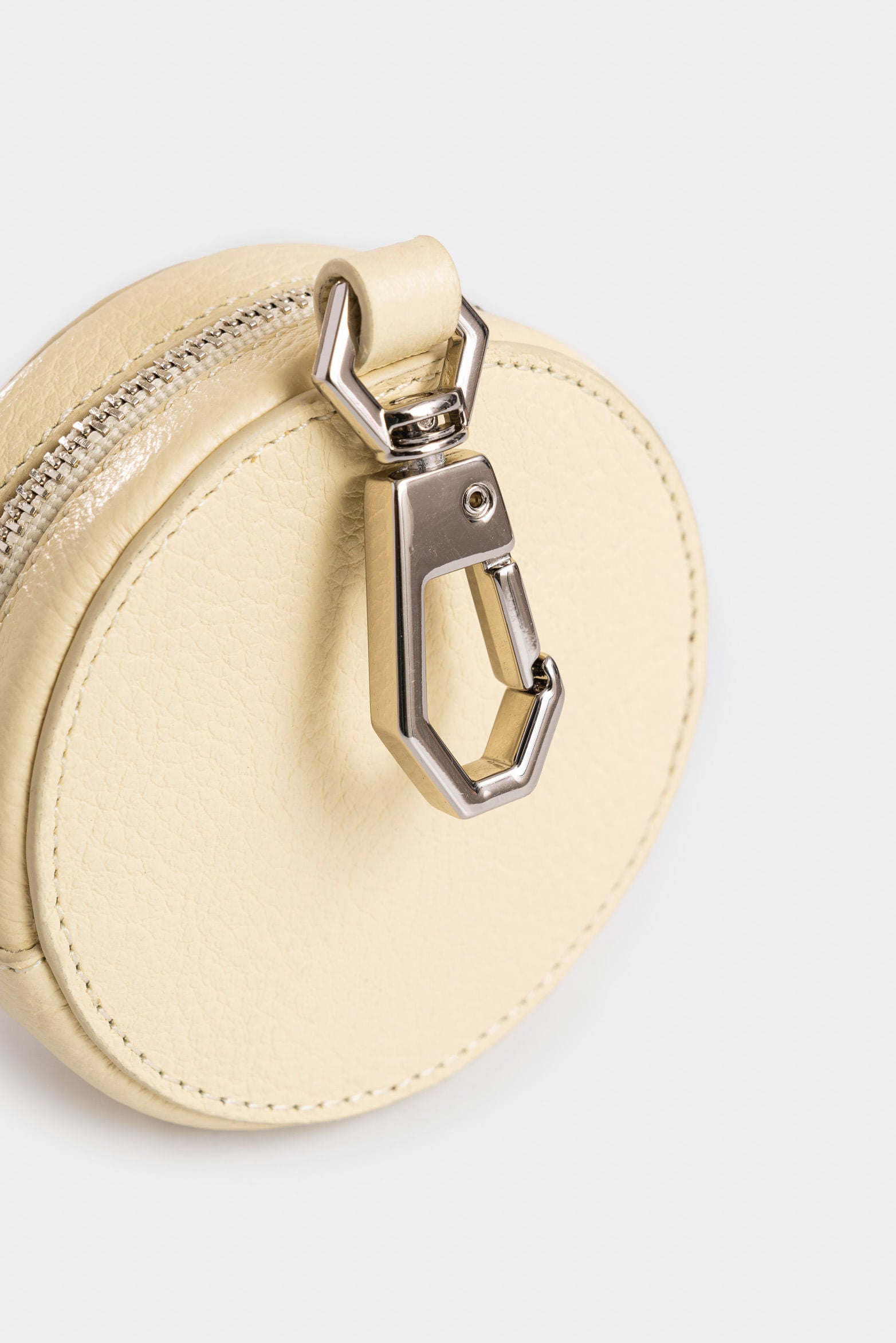 This circular coin purse, crafted from subtly grained leather, is the perfect blend of lightness and simplicity, with a contemporary touch. Its practical design includes a metal zipper and a clasp that allows you to attach it to bags or belts, keeping your small essentials always close at hand.
