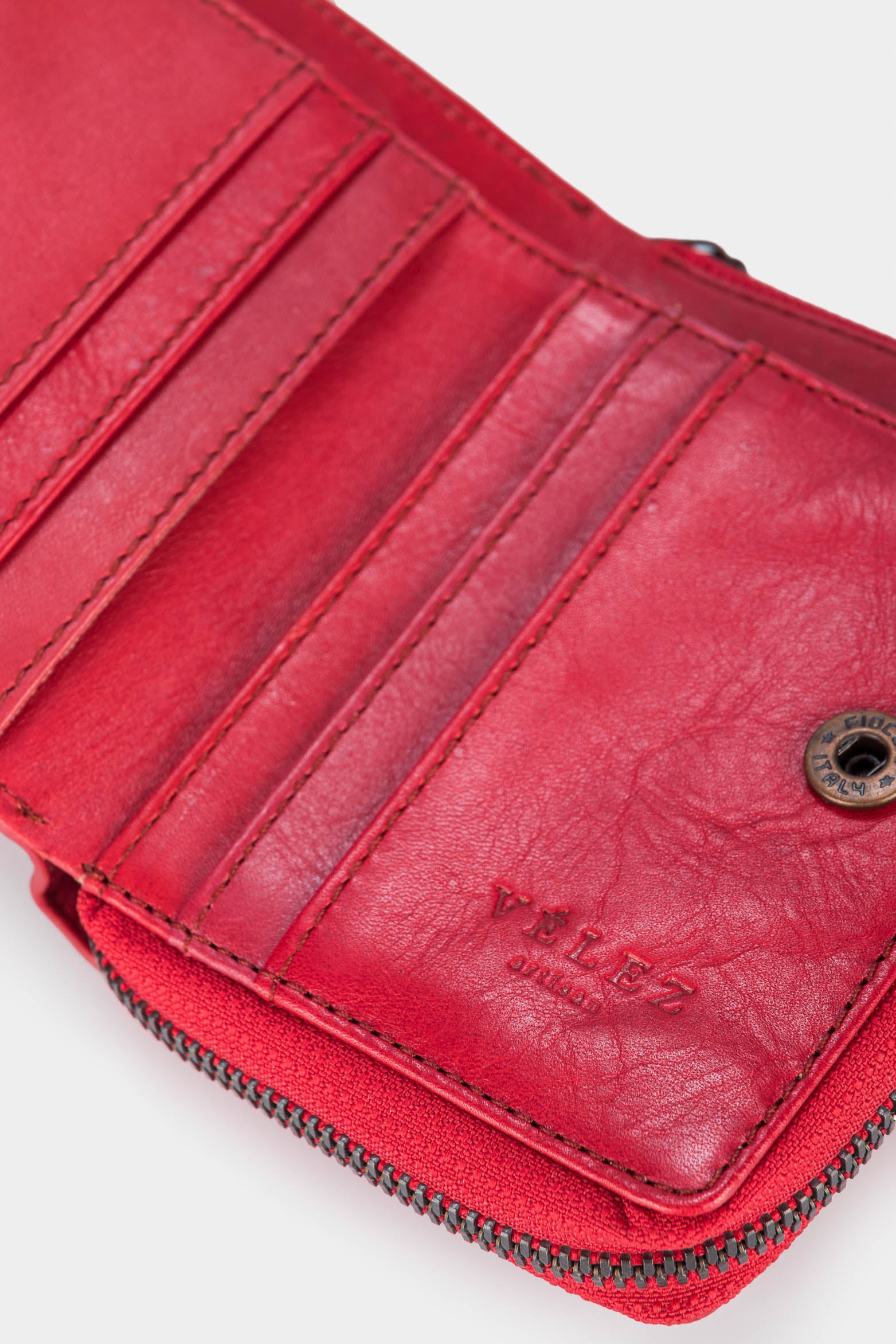 Carry your cards, bills, and documents with peace of mind wherever you go. This leather wallet features a zipper closure system and RFID security that prevents data cloning. Its design is practical and easy to carry, with 6 card slots, an interior in color contrast, and a metal appliqué with the Vélez mark. Subtle details provide a better experience when using it.