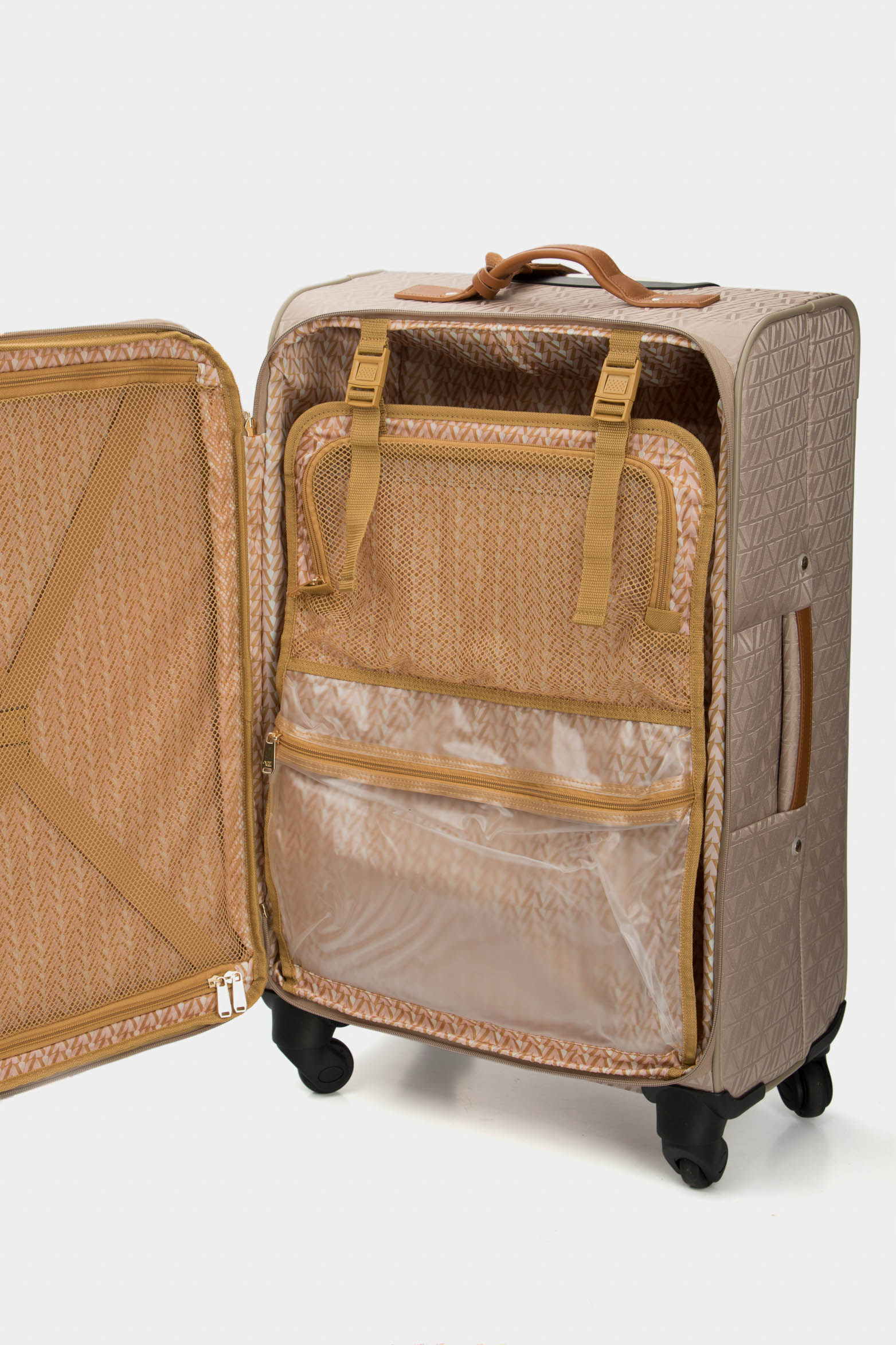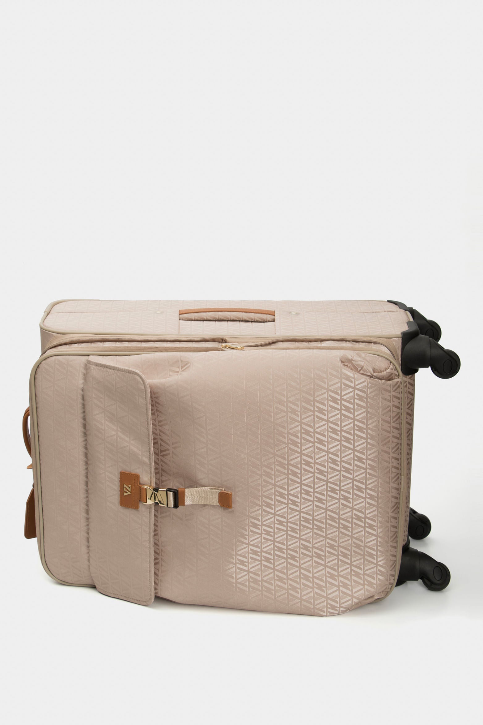 Our 24” Jacquard suitcase with VZ monogram features leather appliqués and four 360° wheels for improved comfort and ease of use. The front pocket with metal buckle closure is ideal for storing items you want to keep on hand. Crafted from the finest canvas, it is ideal for travel lovers. For casual, office or travel use. Pair it with our BLOOM luggage set and elevate your style.