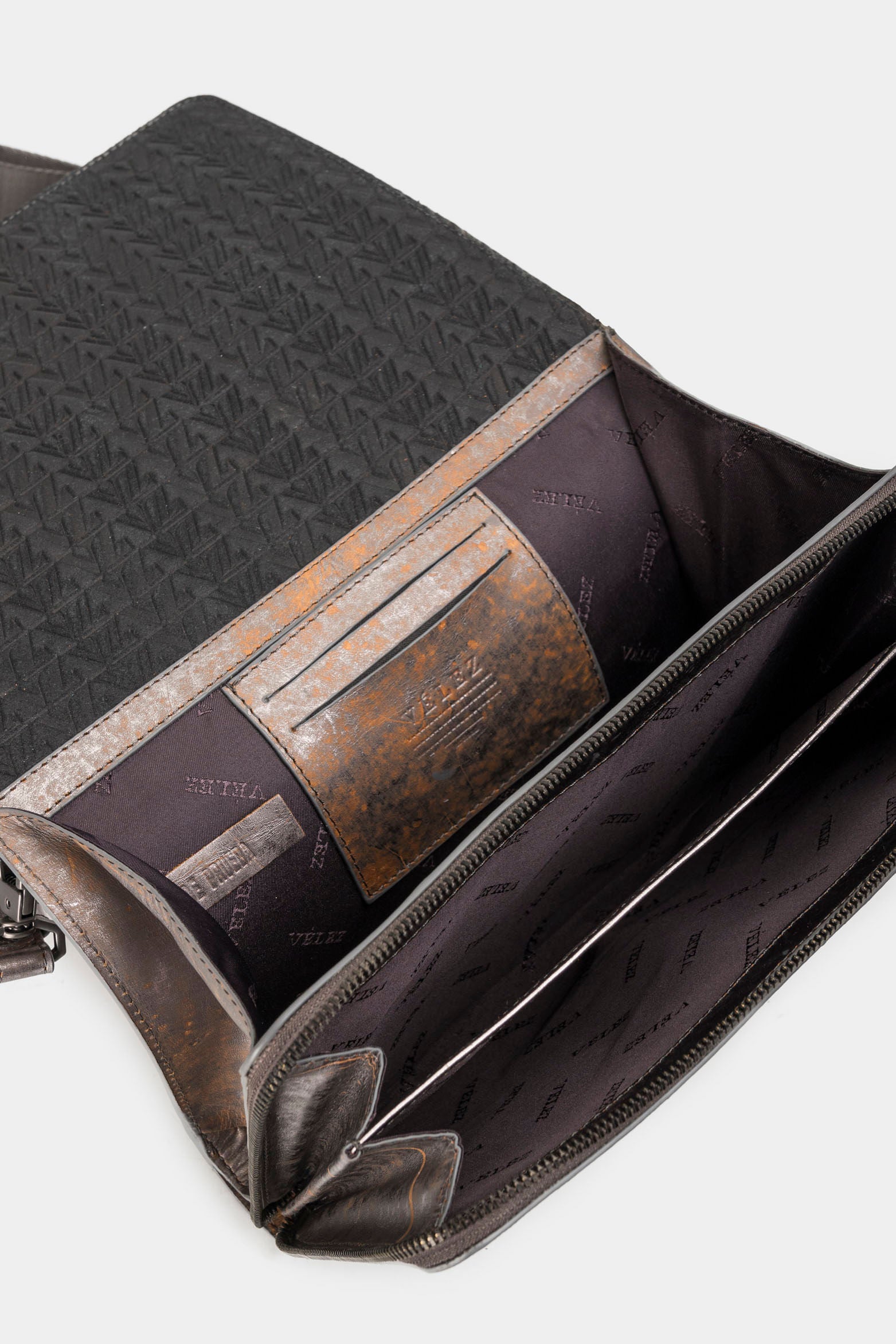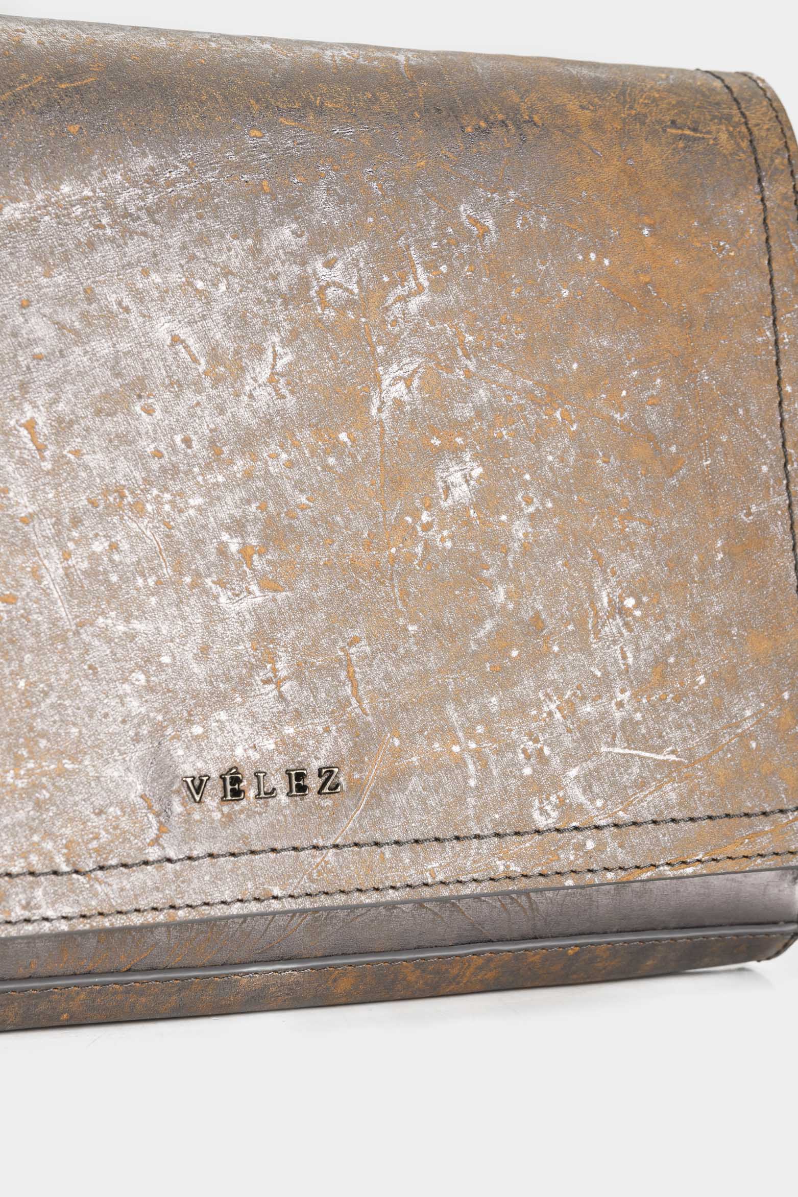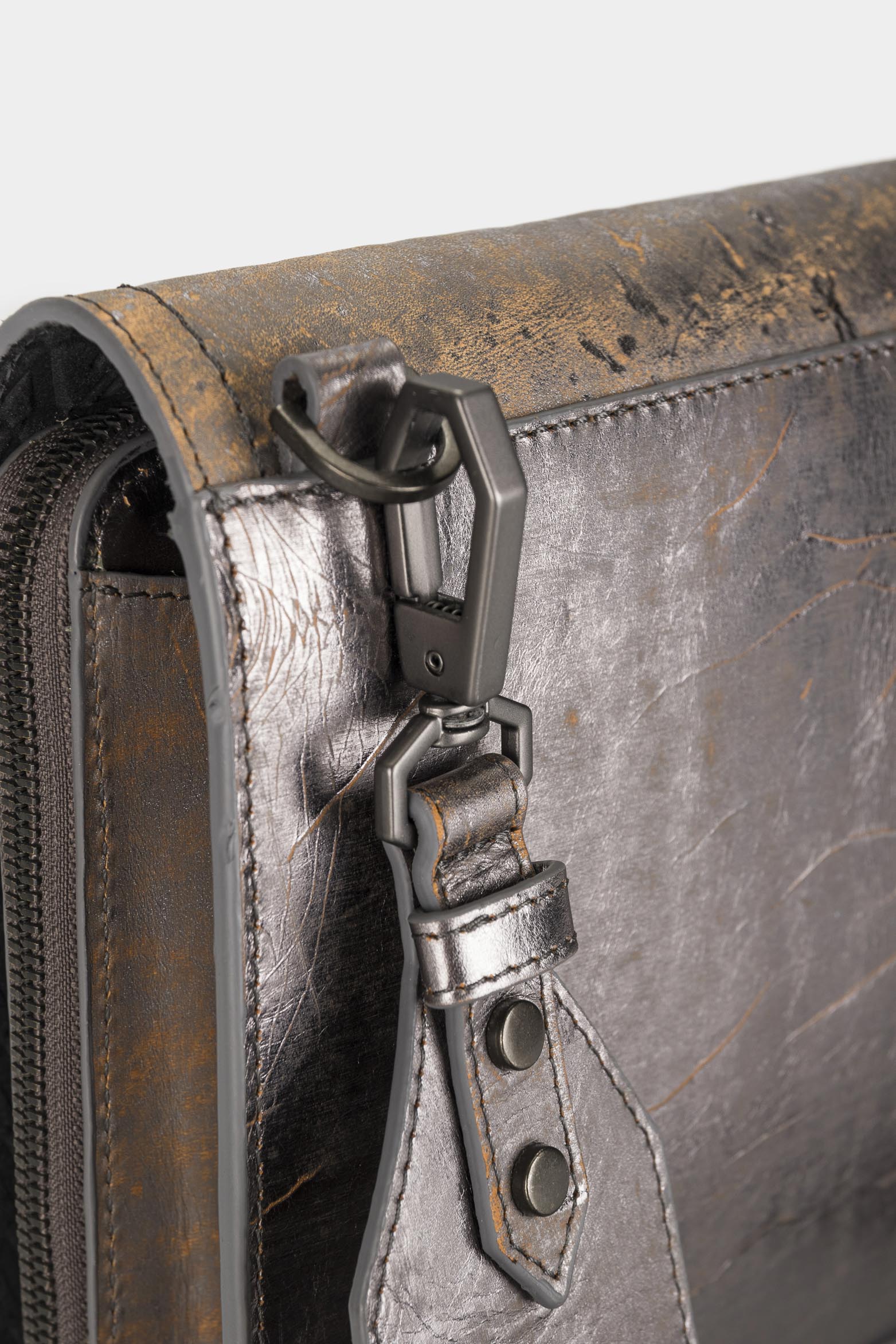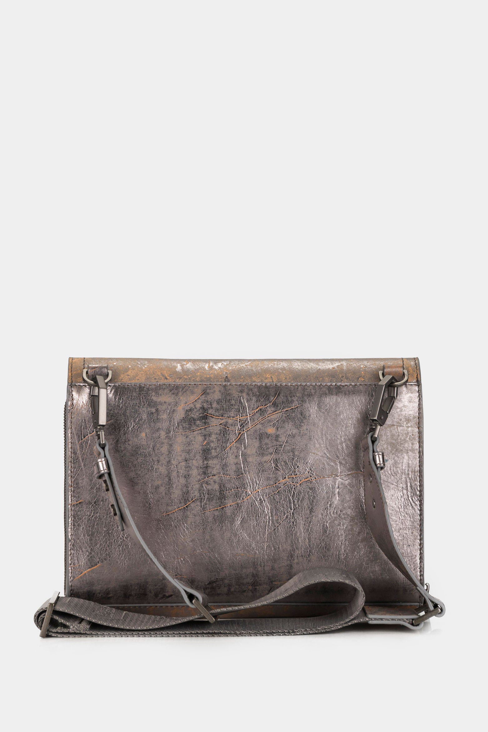 Hands-free metallized leather bowling bag with wide, seatbelt strap that is adjustable and removable by carabiners. It has functional and practical internal features such as card slots and a split compartment. Its zipper closure adds a layer of security and practicality. Additionally, by removing the long strap, it can be used as a clutch, making it the ideal accessory for daily wear or casual gatherings in a contemporary outfit with fashionable touches.