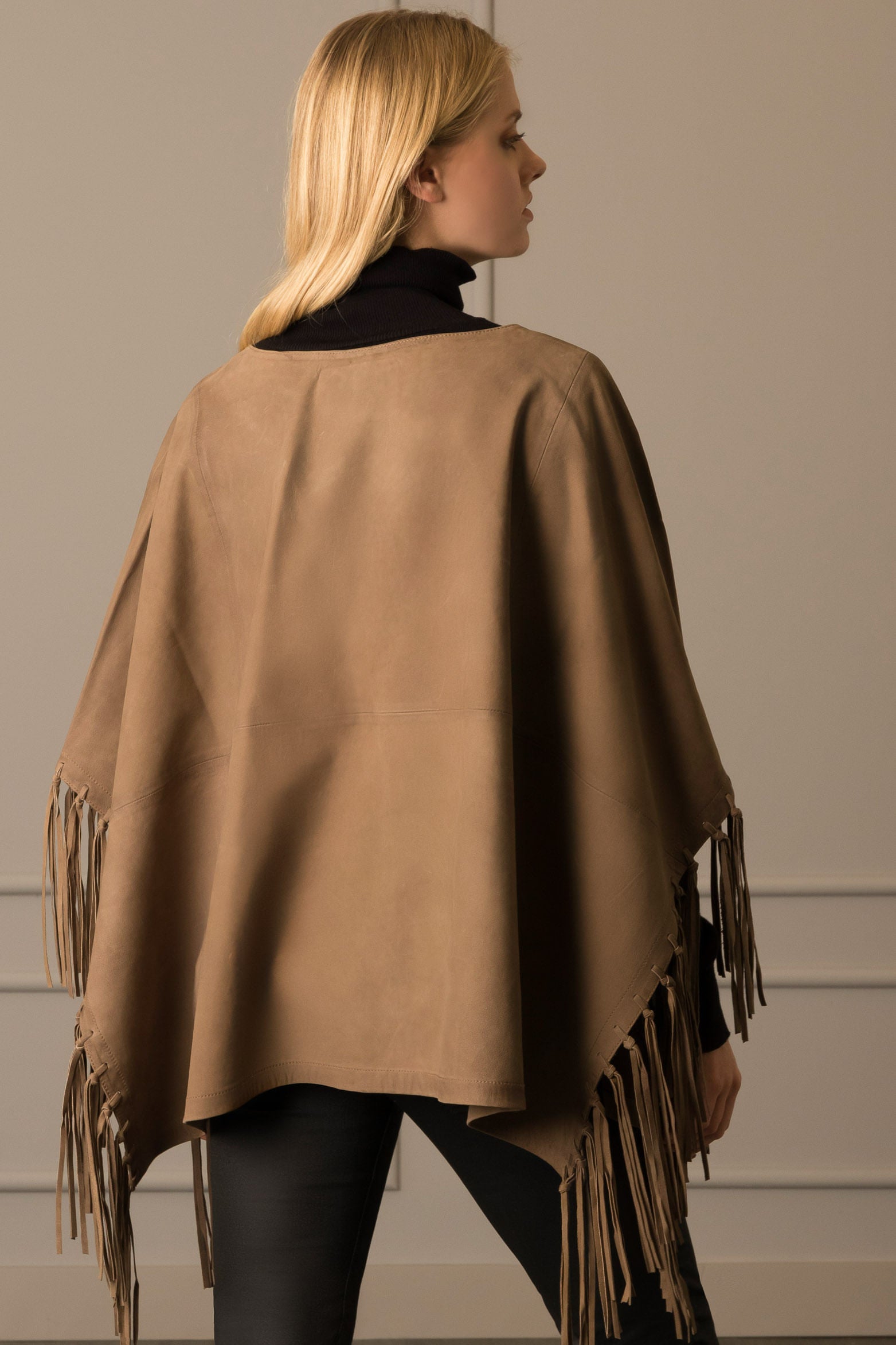 The resurgence of ponchos demonstrates their versatility as pieces that can be easily used on a daily basis. This style is made of nubuck leather and features fringe detailing on the sleeves. In addition, a loose silhouette provides comfort and adapts perfectly to cold and temperate weather looks. Pair it with jeans or wide pants for a more contemporary aesthetic.