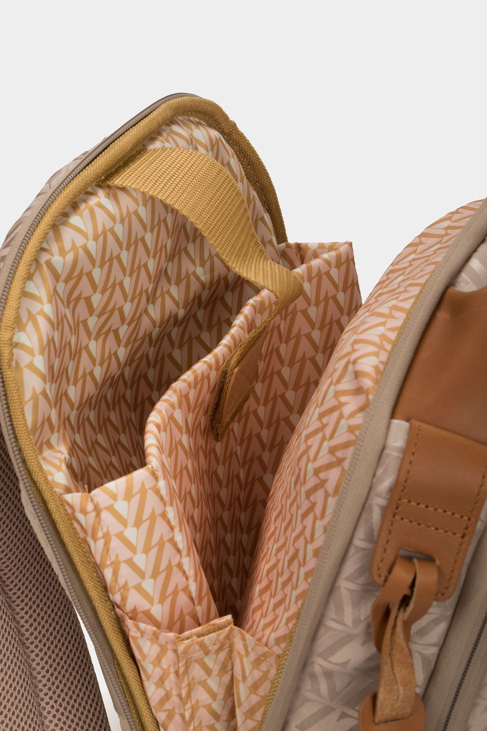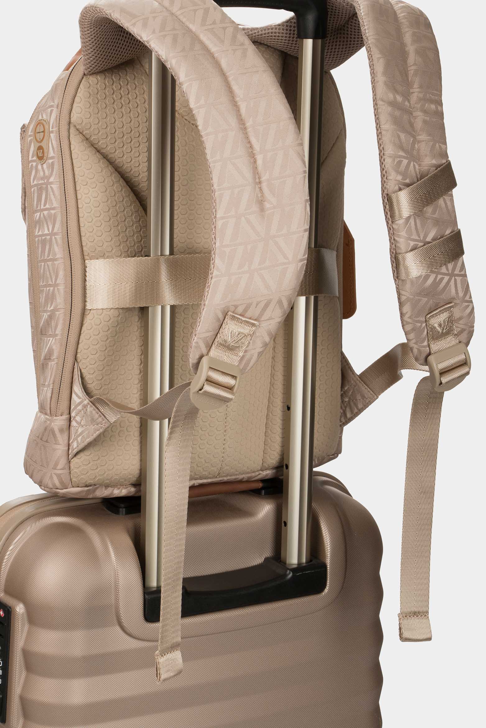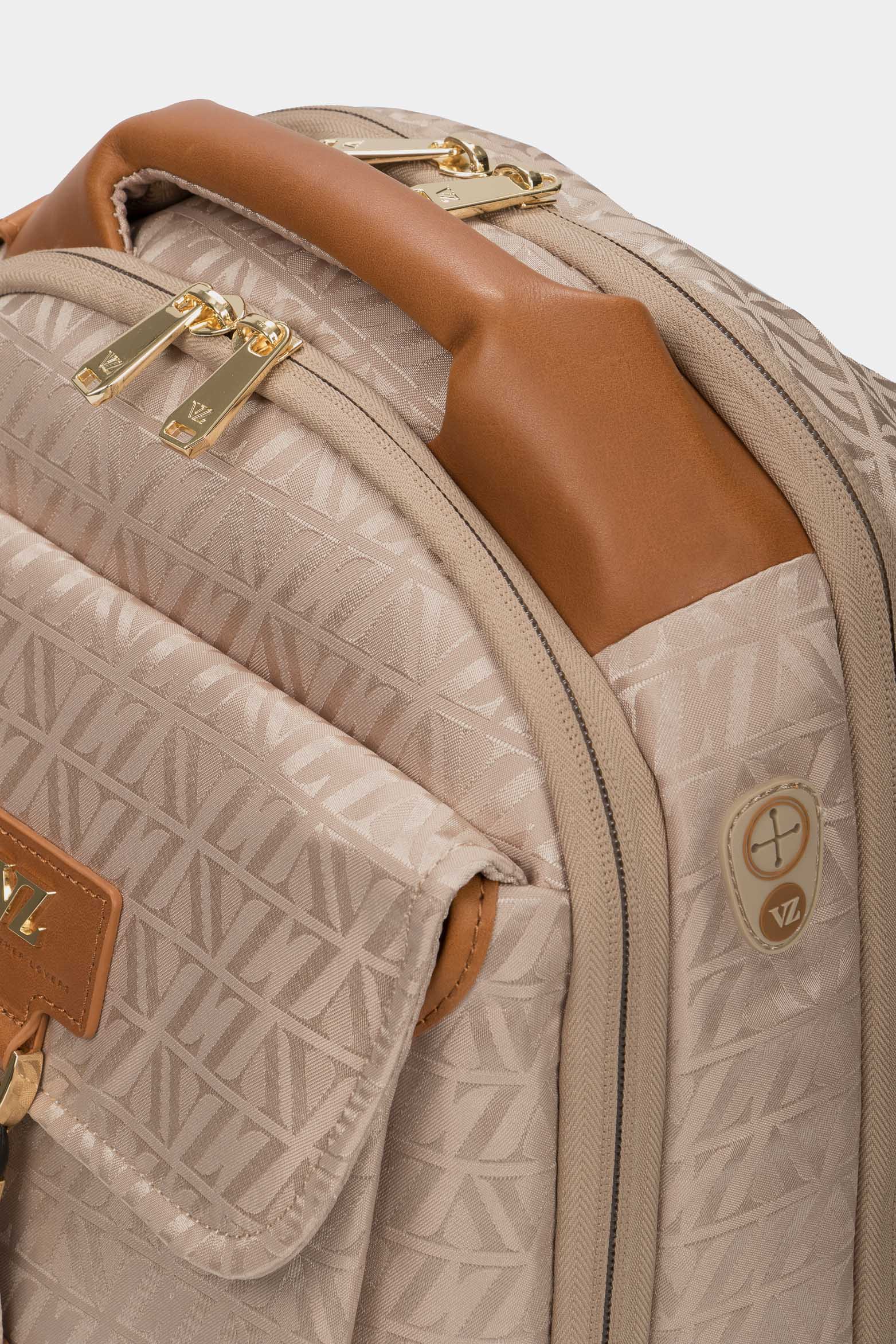 Our Jacquard backpack with VZ monogram and leather appliqués is a must-have for your travels. It features a trolley strap for attaching to a suitcase, large internal compartments for supplies and cards and an individual compartment for a 14” laptop. Ideal for casual office or travel looks. Pair it with our BLOOM luggage set and elevate your style.