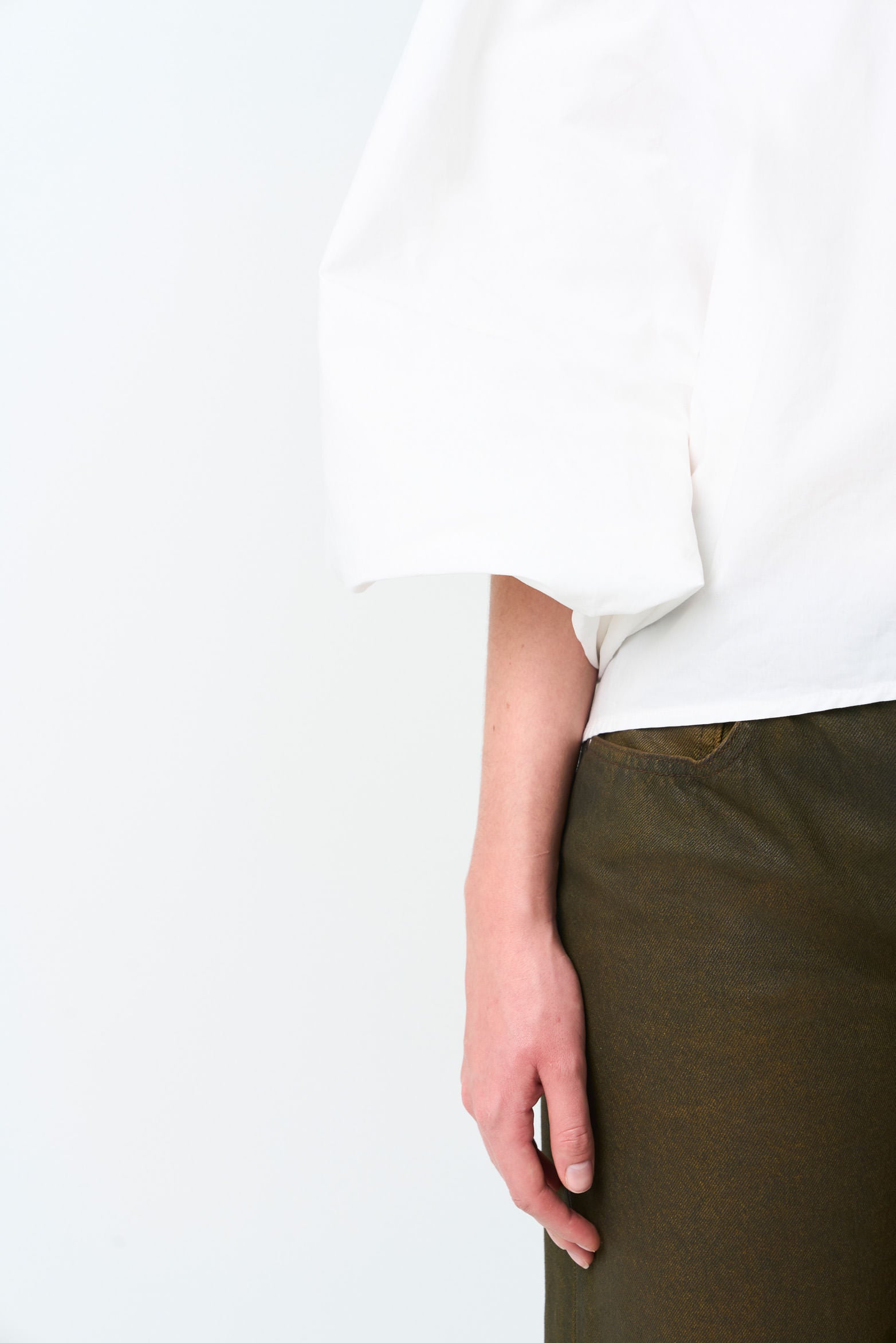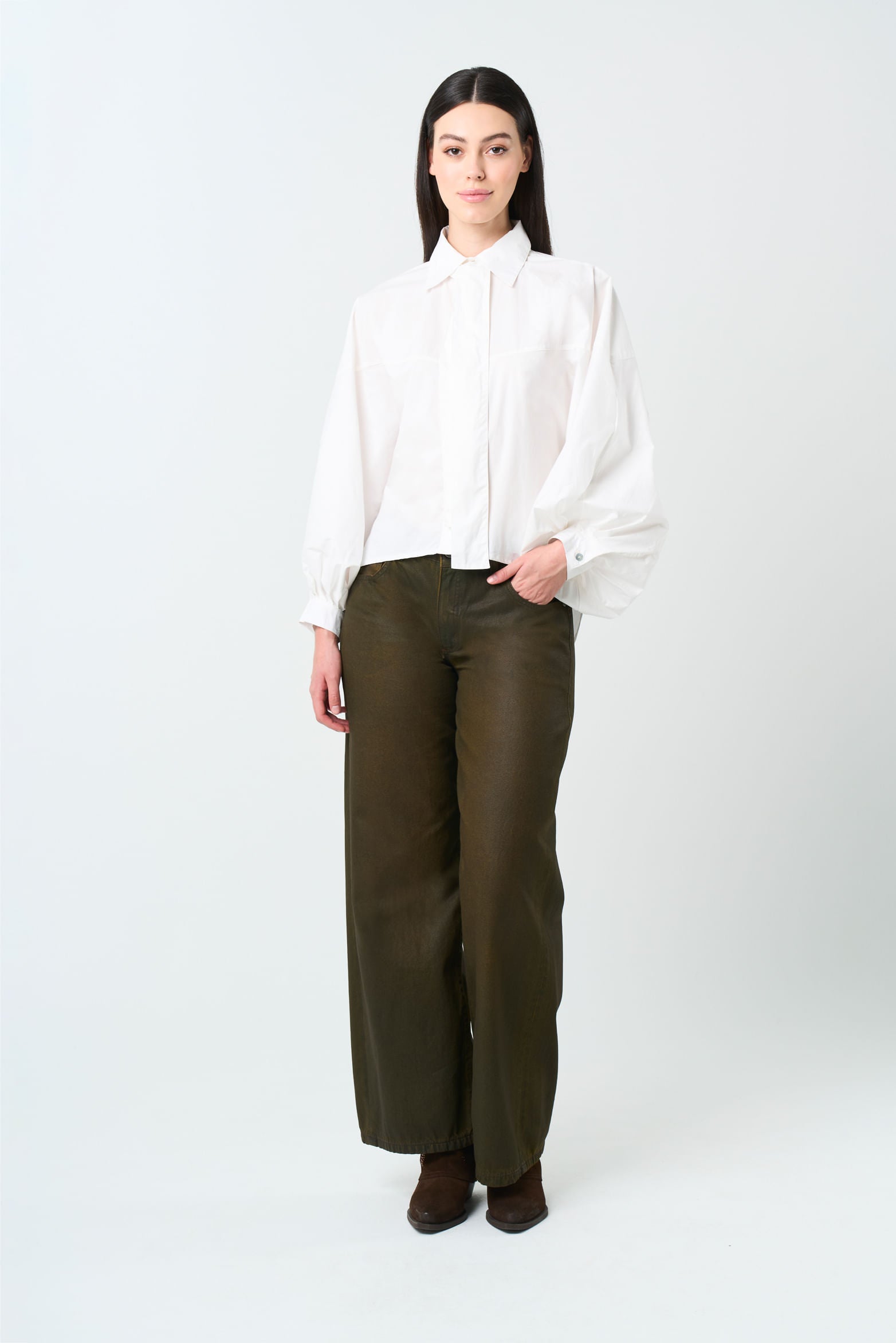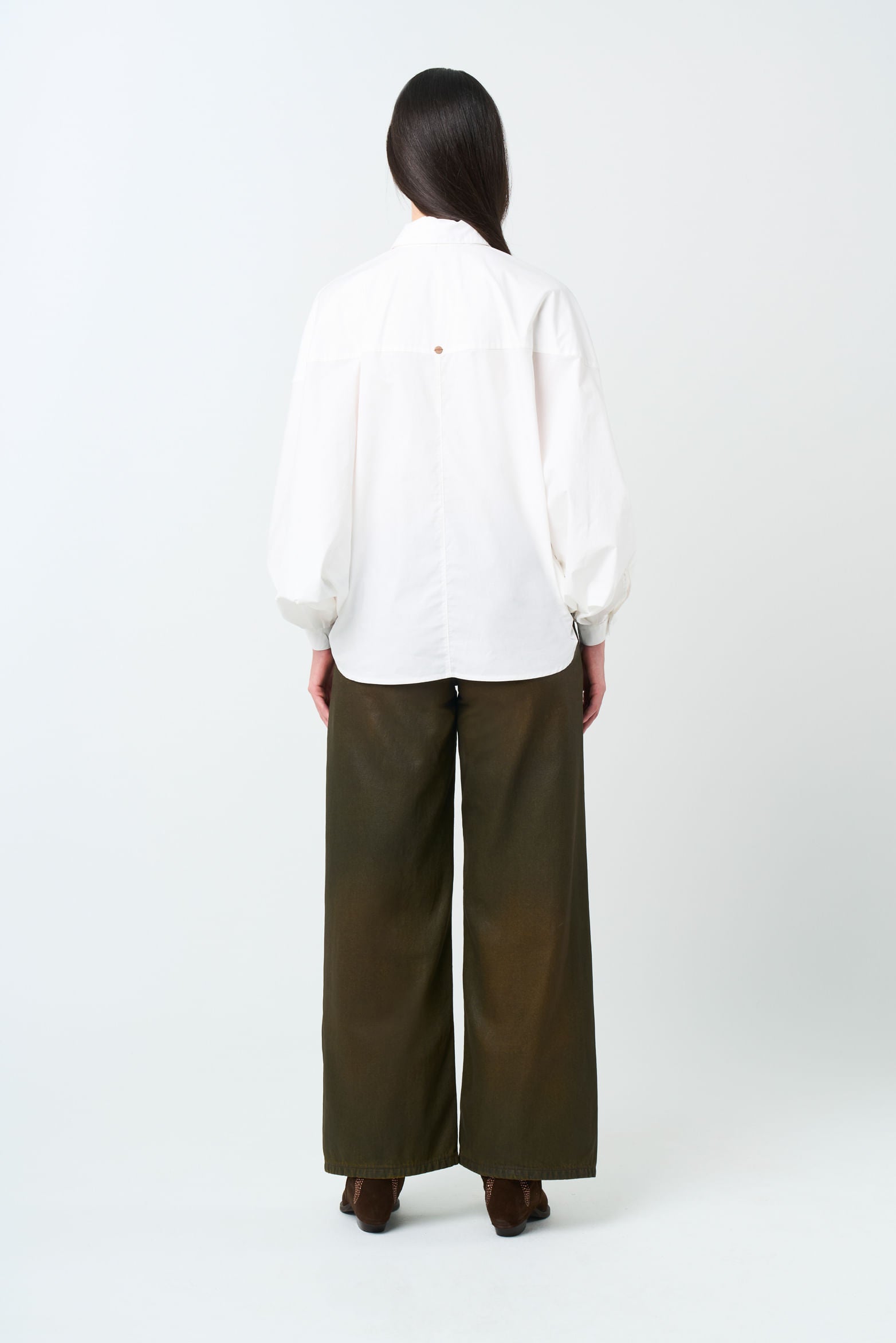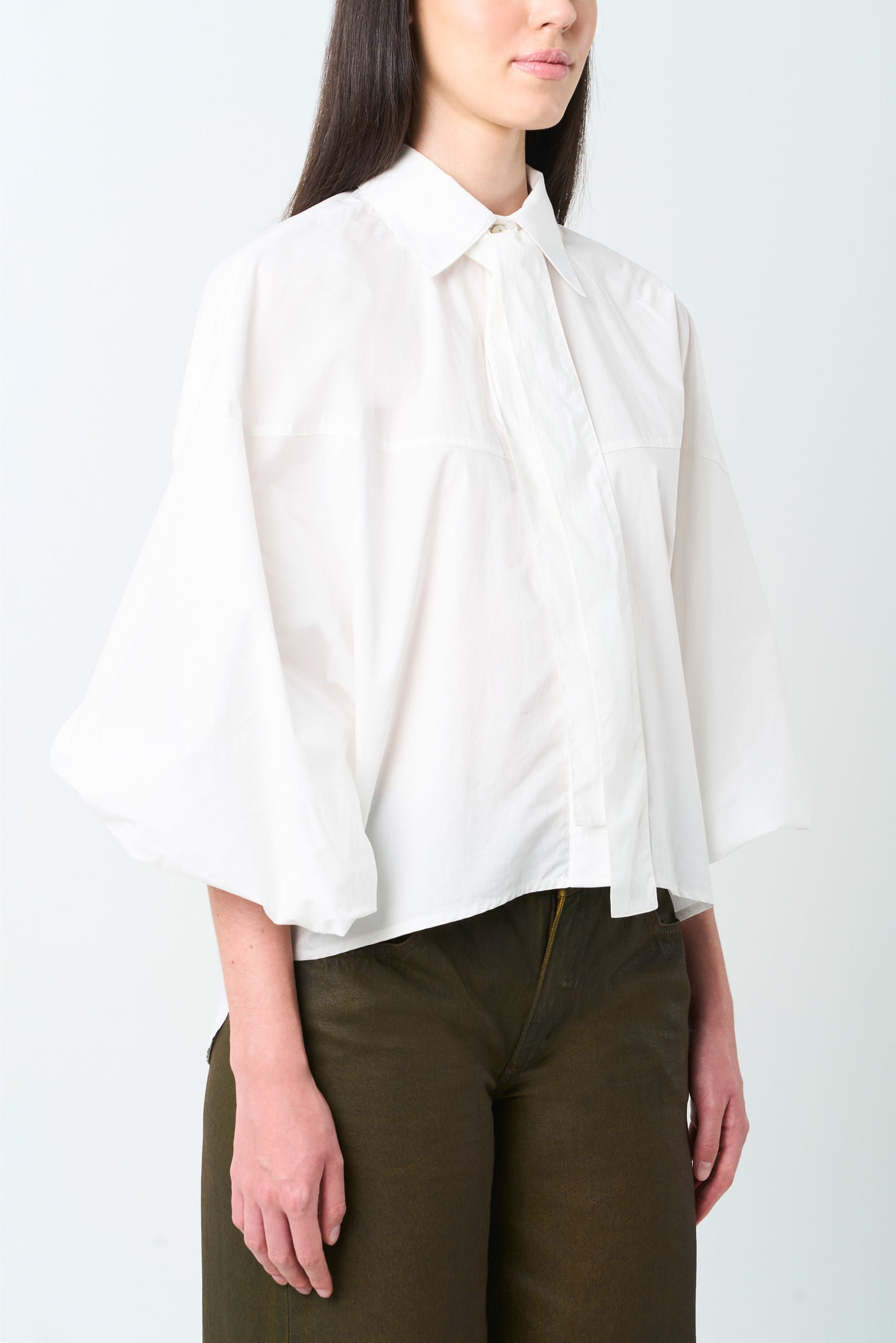 A design that elevates bohemian character and luxury craftsmanship. This oversized, balloon-silhouette shirt pairs a poplin-style fabric with singular details, including a shirt collar with a removable tie for a bow finish. Balloon sleeves with pleats and refined cuffs make it a versatile piece that adds a vintage touch to fluid skirts and your favorite jeans.