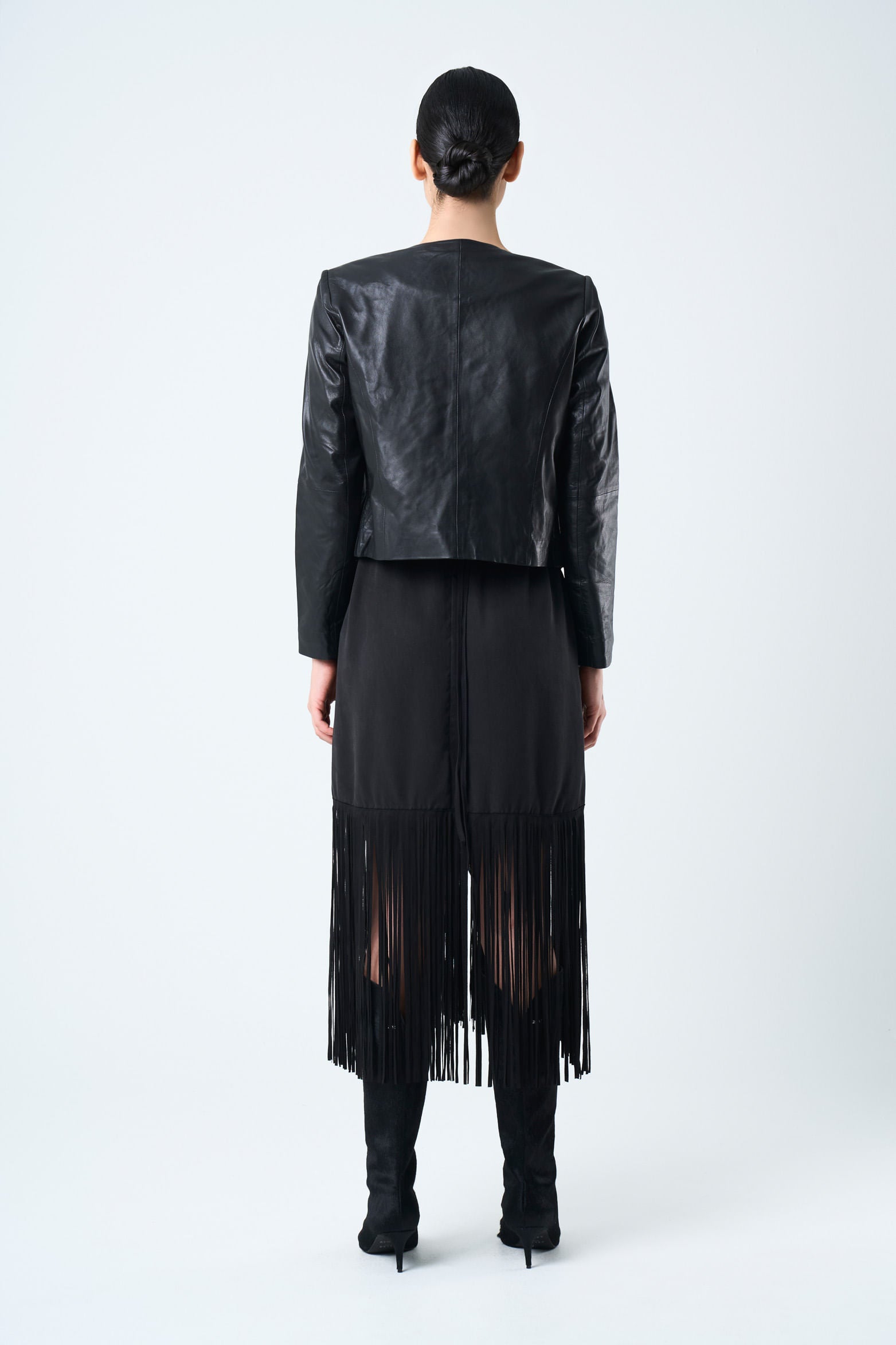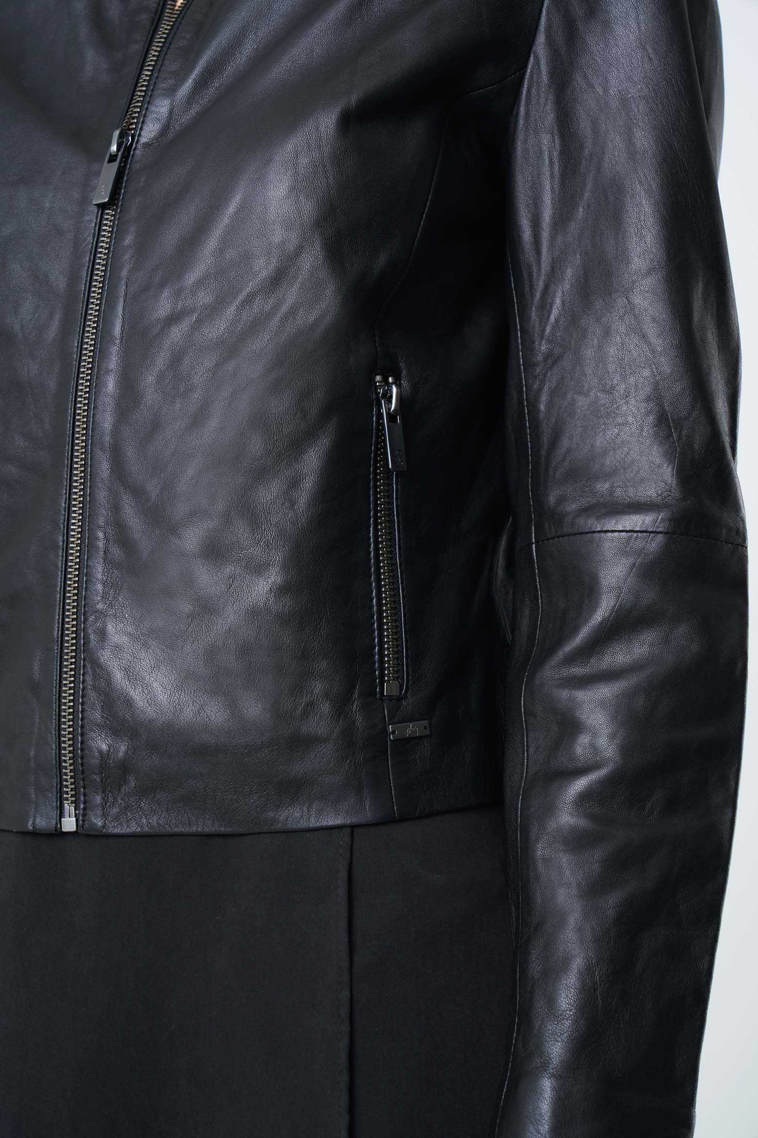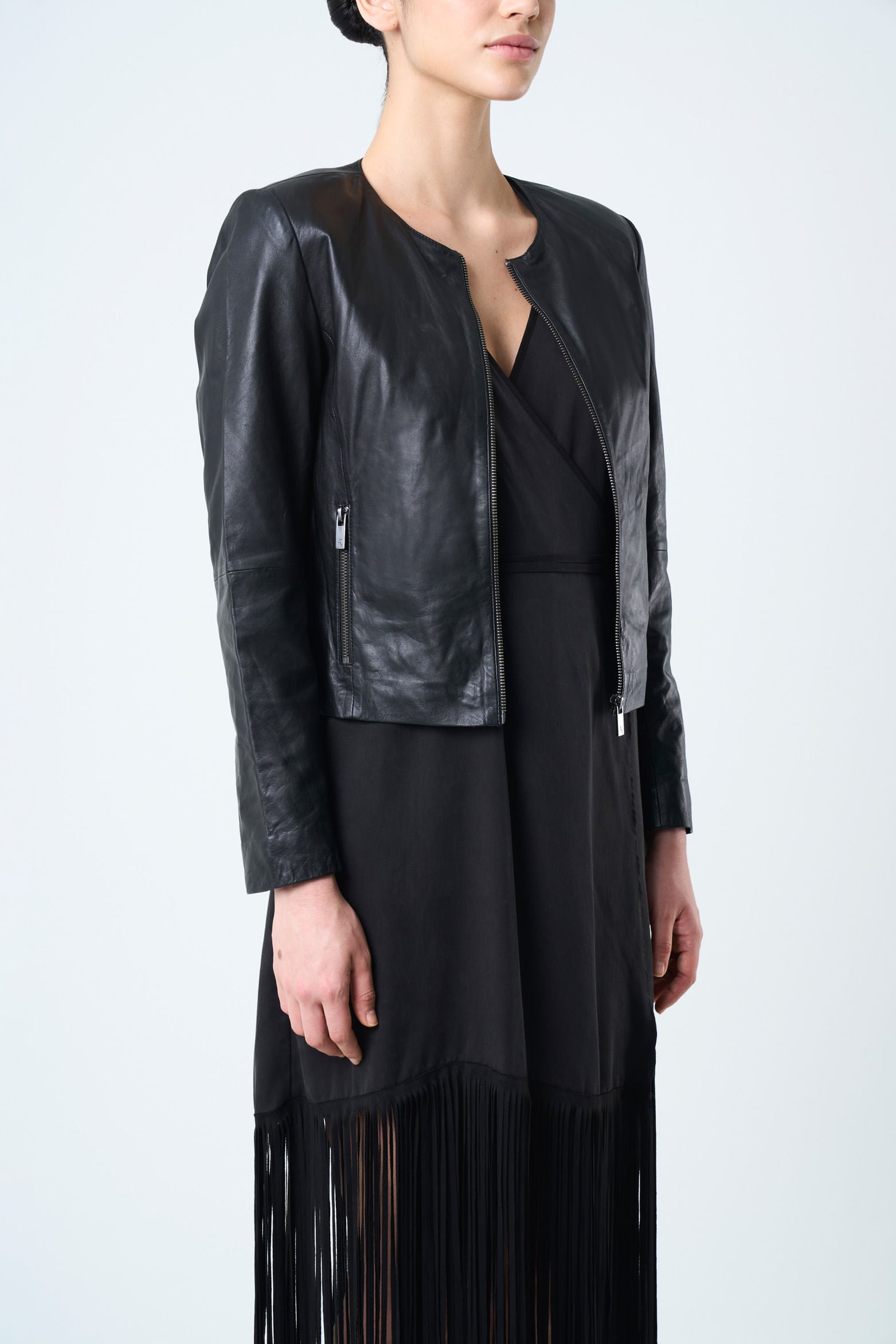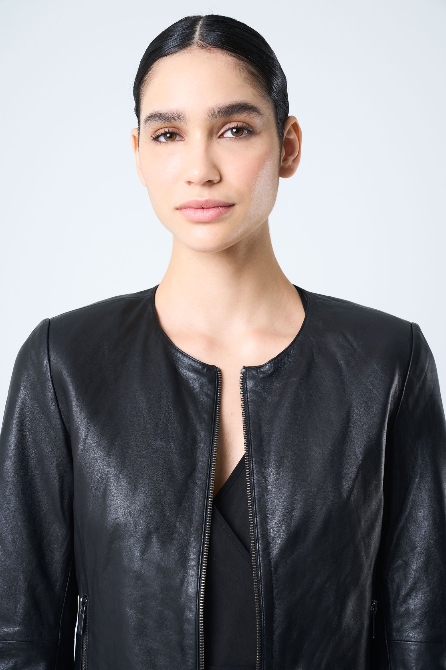 Clean lines and bold attitude in a piece that fuses minimalism with biker spirit. Crafted in smooth leather, its fitted silhouette and round neckline refine a sophisticated, versatile aesthetic. Metal zippers add character, while the defined structure balances ease and comfort. A timeless classic that elevates maxi dresses or fluid trousers with sophistication and edge.