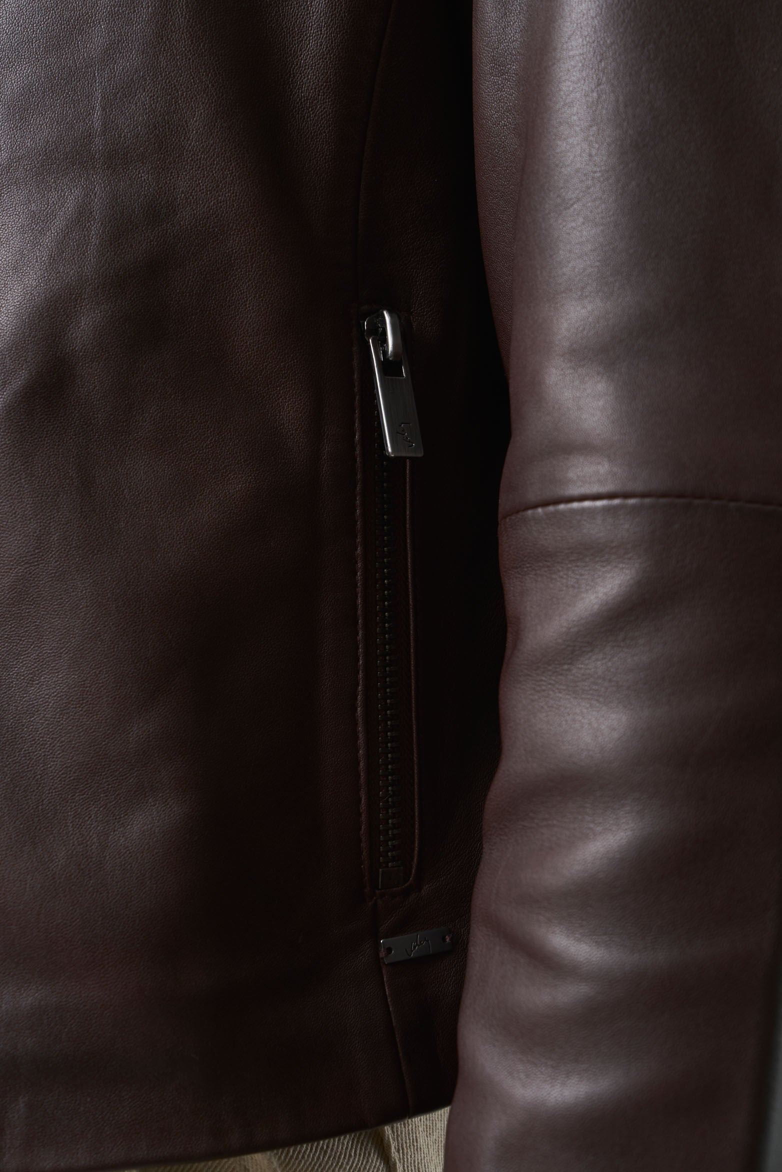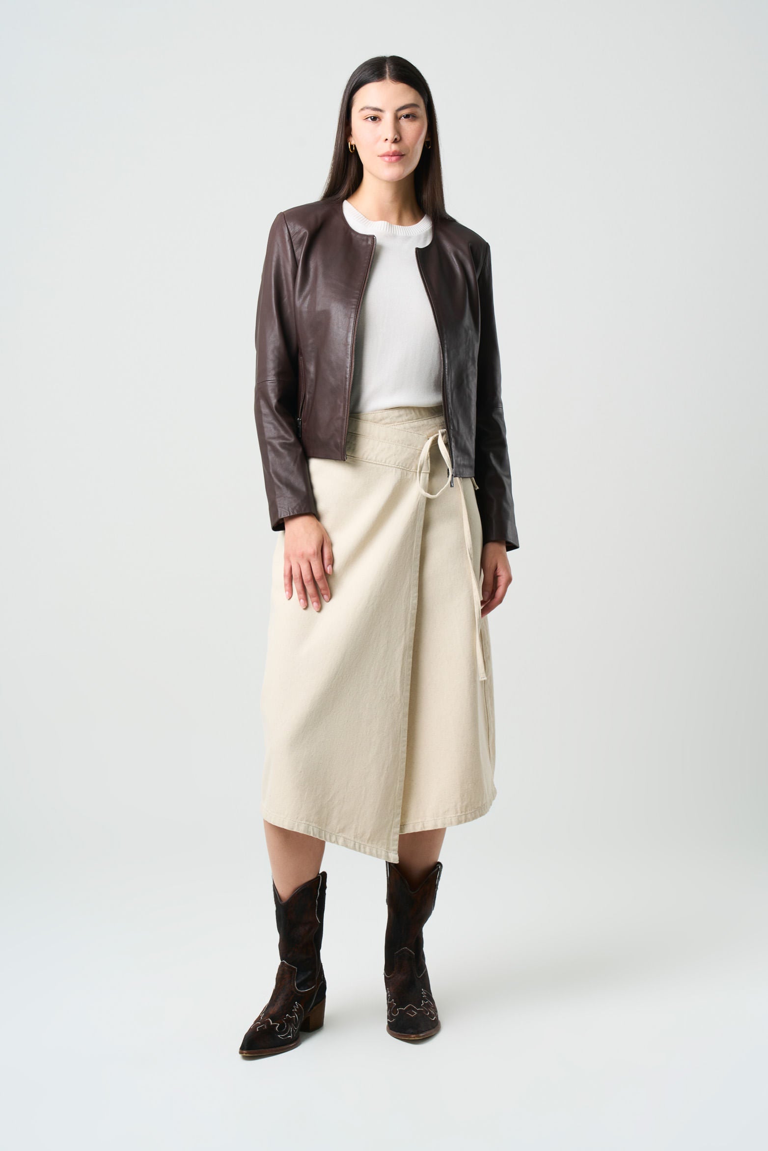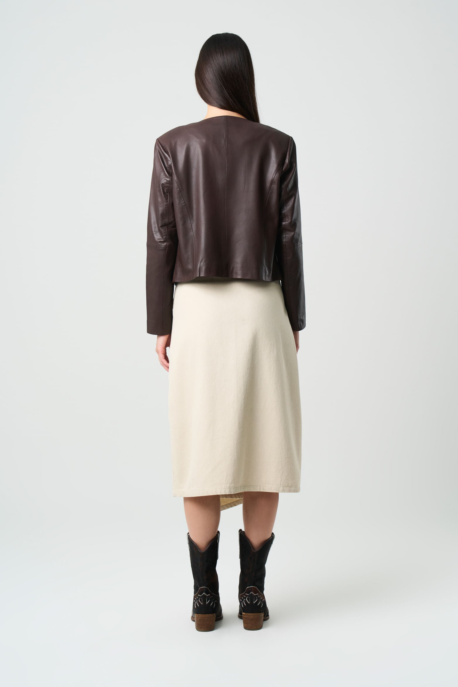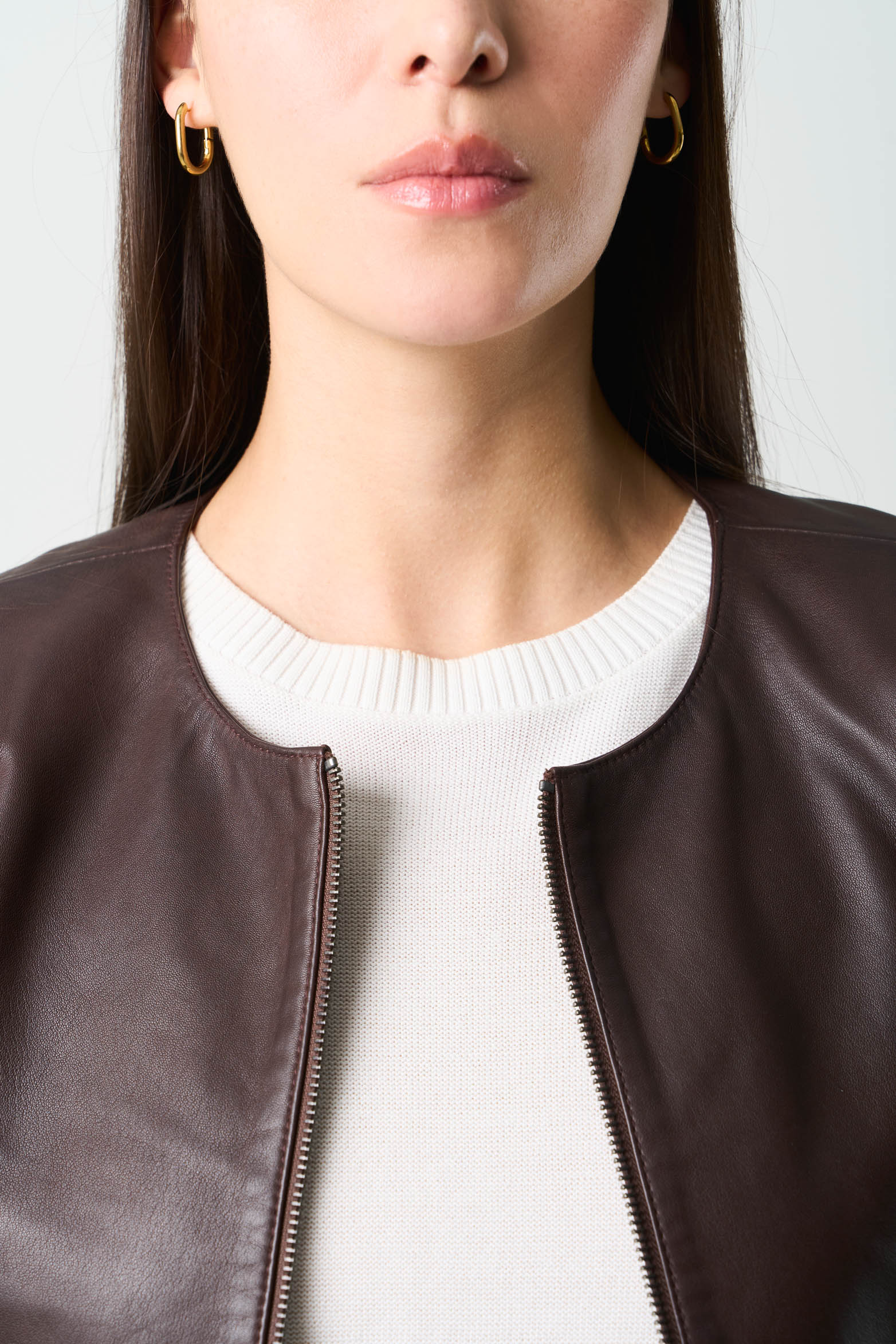 Clean lines and bold attitude in a piece that fuses minimalism with biker spirit. Crafted in smooth leather, its fitted silhouette and round neckline shape a sophisticated, versatile aesthetic. Metal zippers add character, while the defined structure balances freshness and comfort. A timeless classic that elevates maxi dresses or fluid trousers with sophistication and edge.