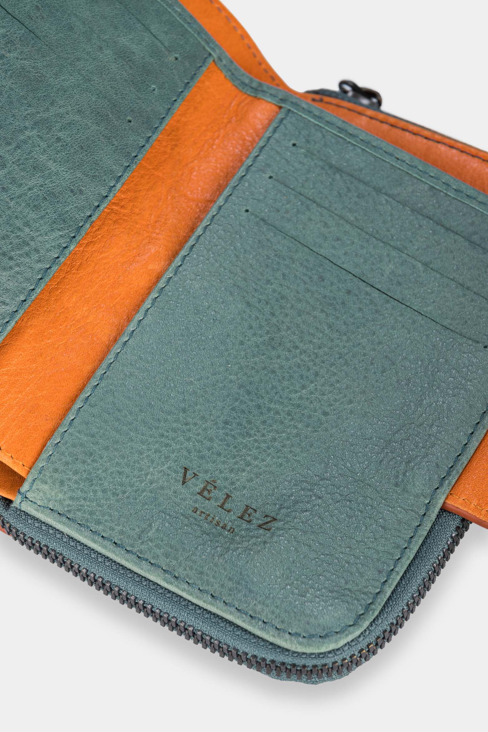 Inspired by the Vélez woman who seeks functionality and style in her accessories, our wallet offers a practical, comprehensive solution to carry your essentials on your day-to-day. Made of soft leather with subtle shine, this item features a bill pocket, six card slots, pockets to store IDs, coin pocket and RFID technology to protect your data and cards. Plus, its snap closure and color accents complement the design and make it the perfect wallet to accompany a minimalistic look.