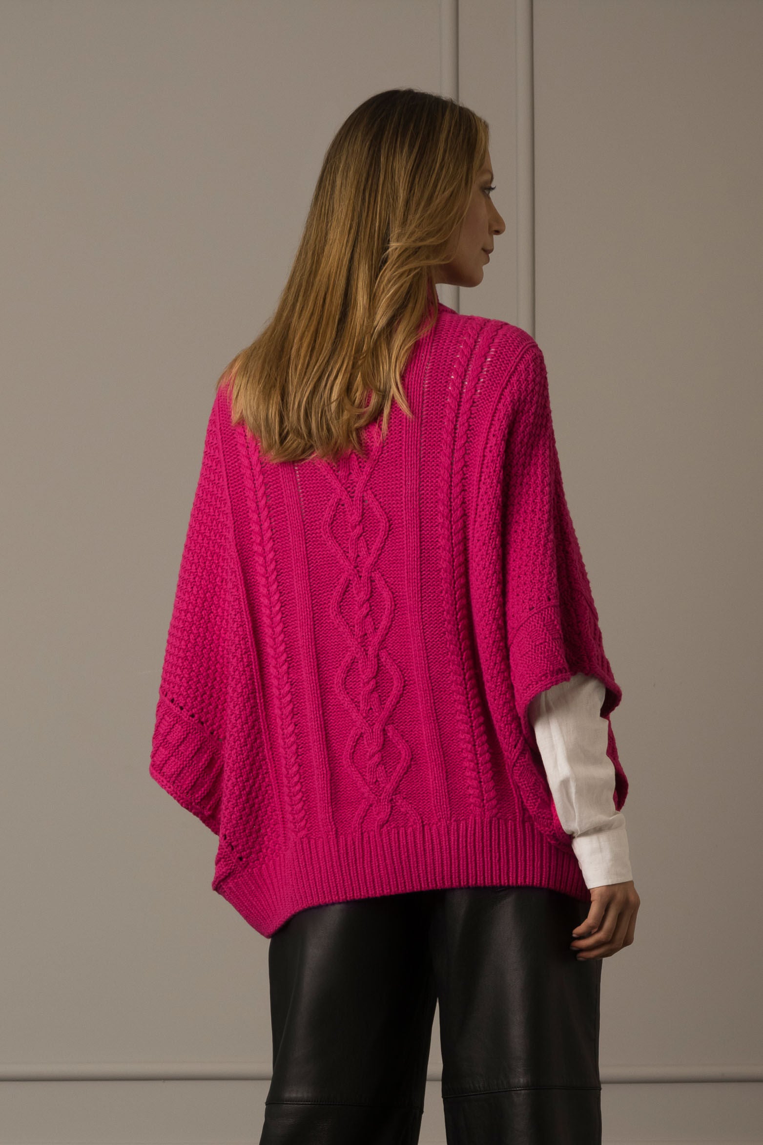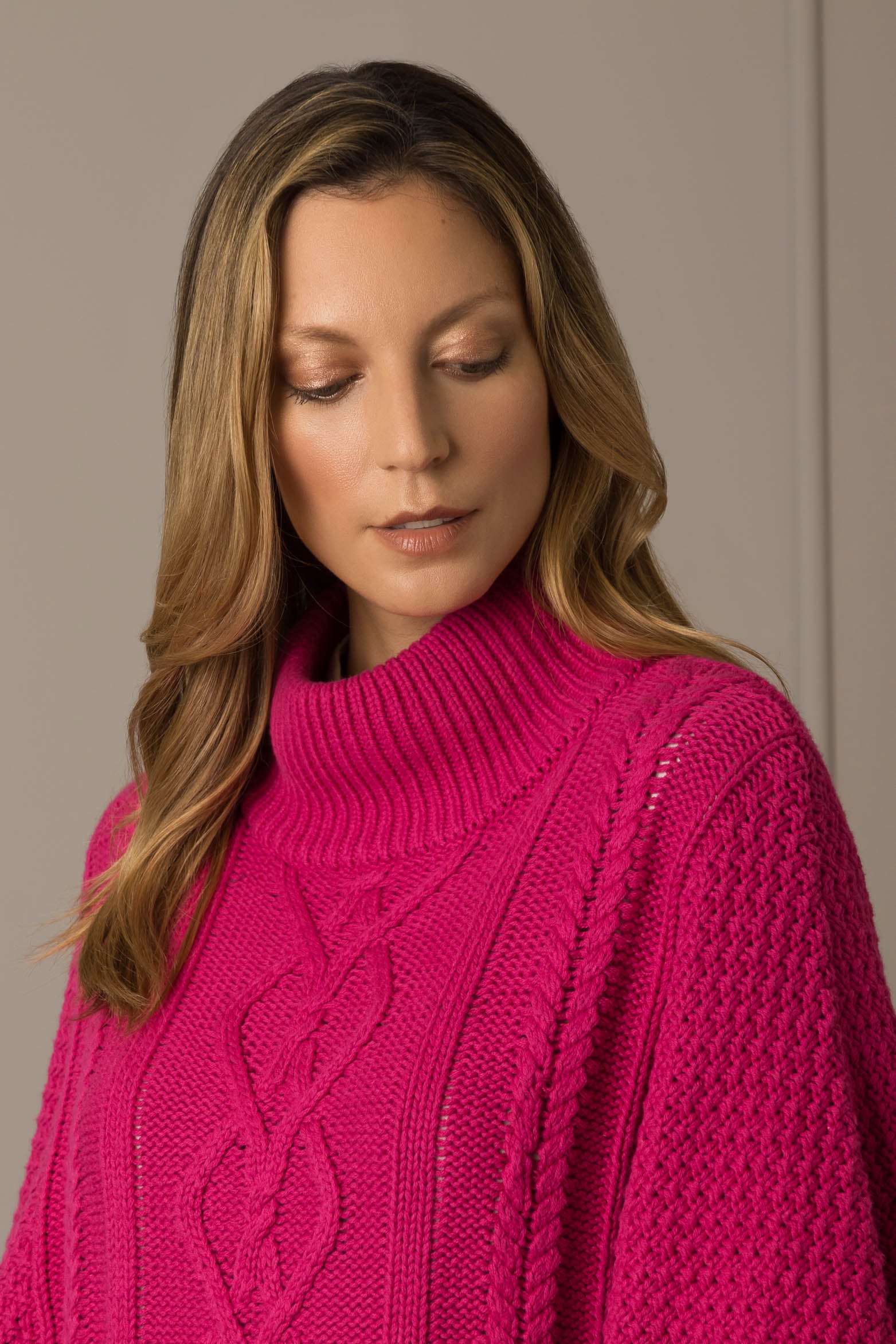 The poncho has become an important style item that represents comfort and creates cozy layers with movement. This piece is made of straight-cut cable knit fabric, with turtleneck, ribbed hem and long batwing sleeve with a large raglan opening. Its perfect for creating casual, layered looks for cold- and mild-weather looks, accompanied with jeans and with a sweater underneath.