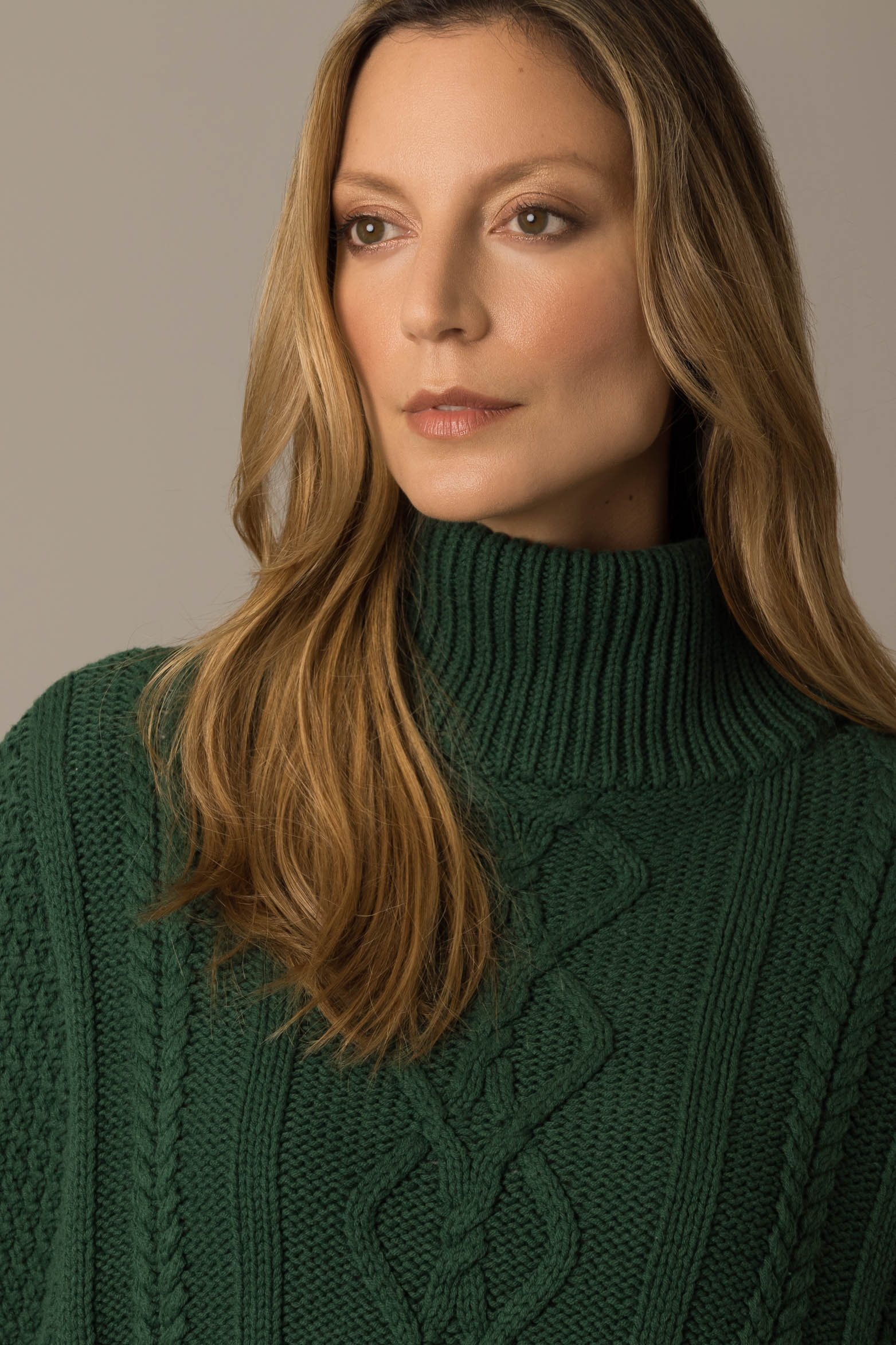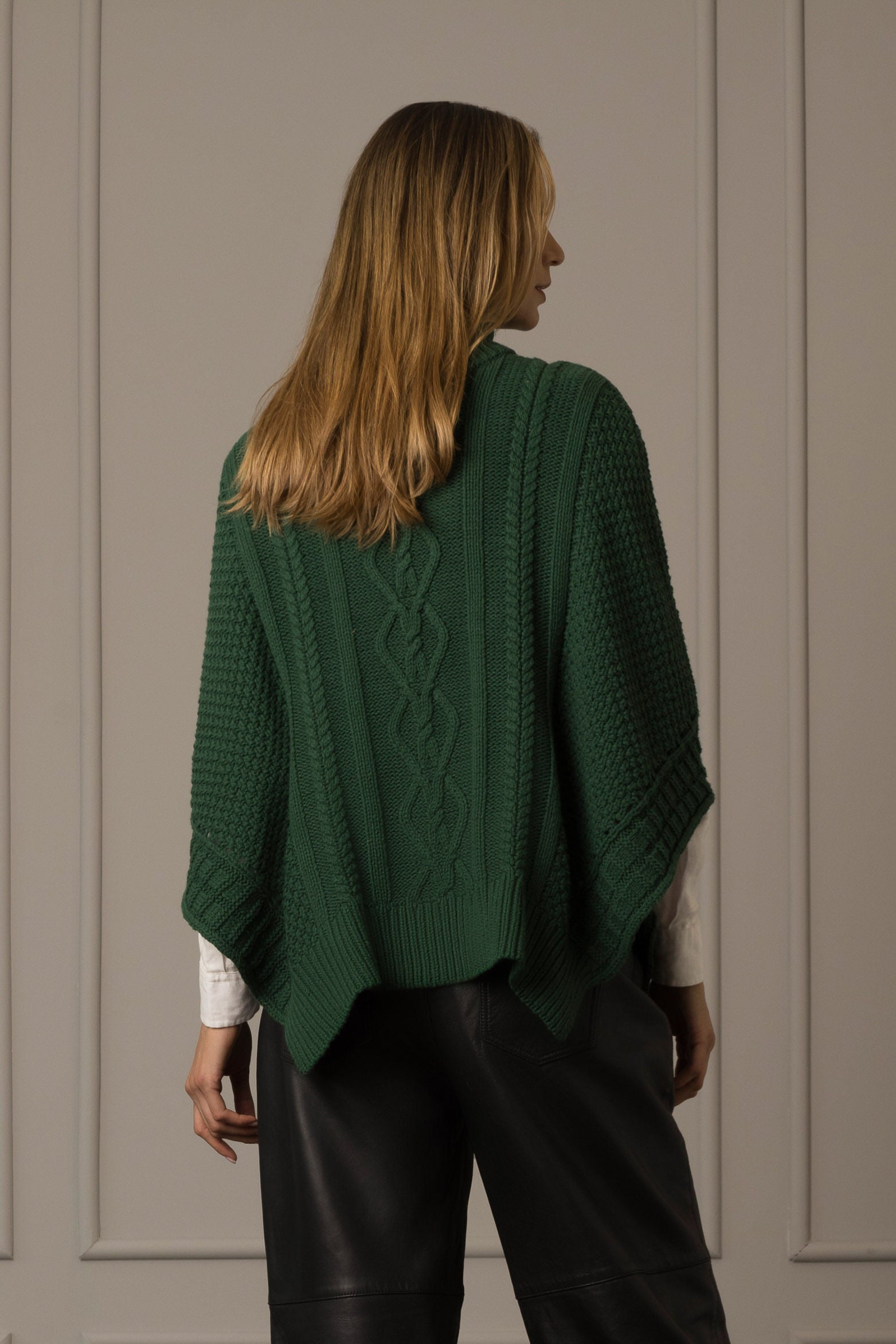 The poncho has become an important style item that represents comfort and creates cozy layers with movement. This piece is made of straight-cut cable knit fabric, with turtleneck, ribbed hem and long batwing sleeve with a large raglan opening. Its perfect for creating casual, layered looks for cold- and mild-weather looks, accompanied with jeans and with a sweater underneath.
