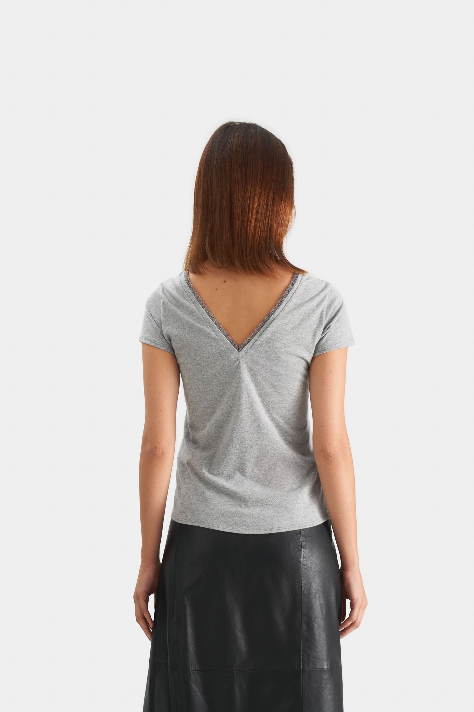 A timeless essential with luxurious detail. Our women’s semi-relaxed tee in soft knit fabric is a foundational piece for every wardrobe. The short sleeves and V-neckline create a signature Vélez look, while the metallic piping and high-hip length become the standout accents of your outfit.