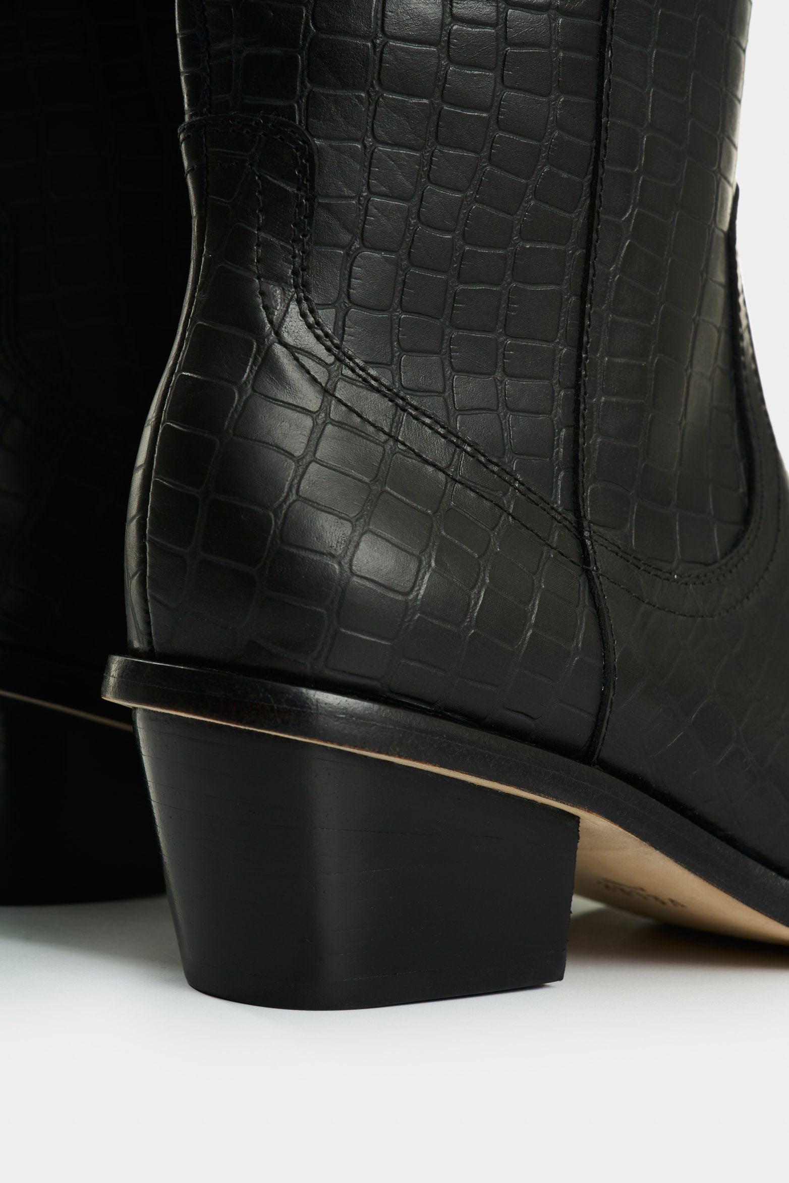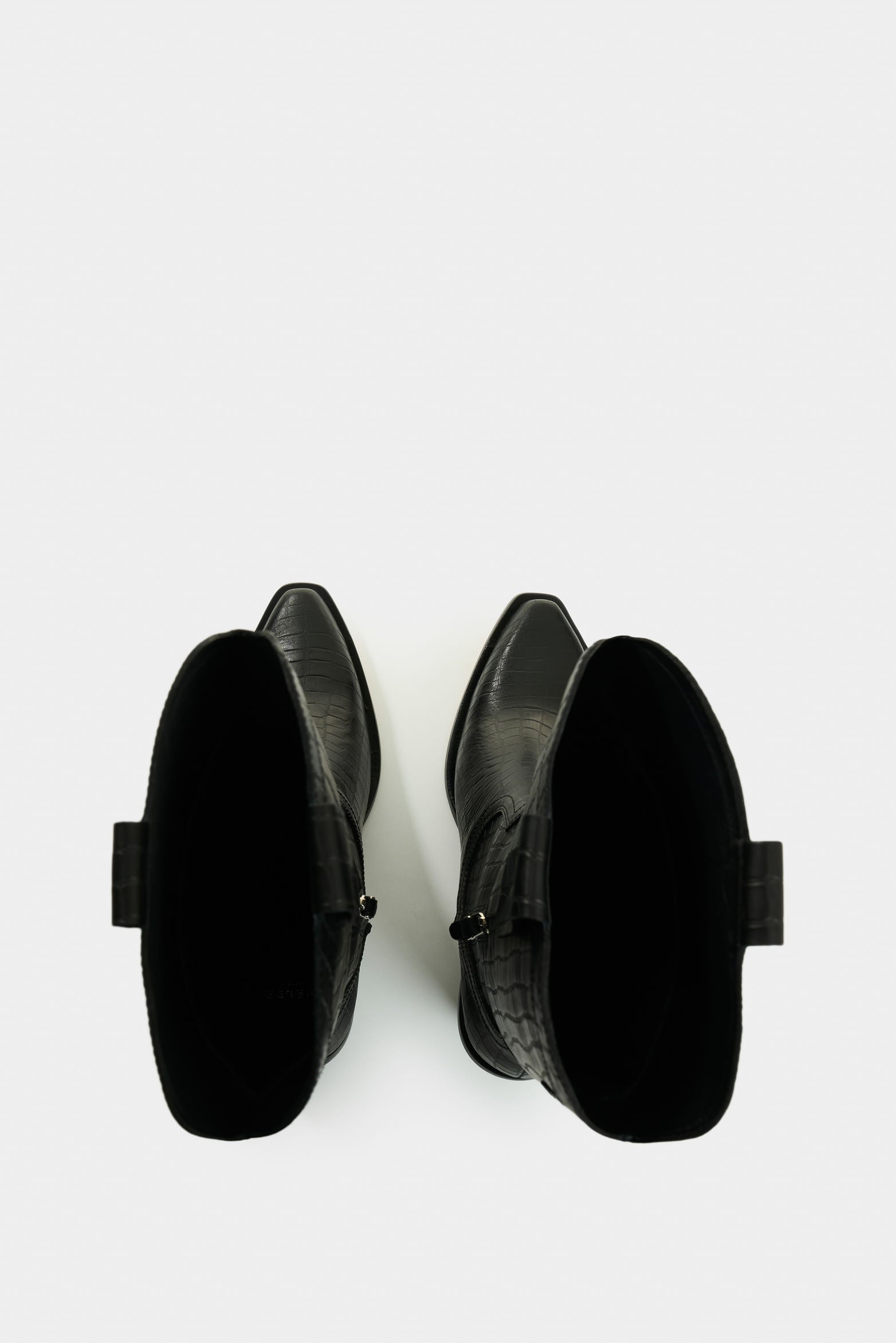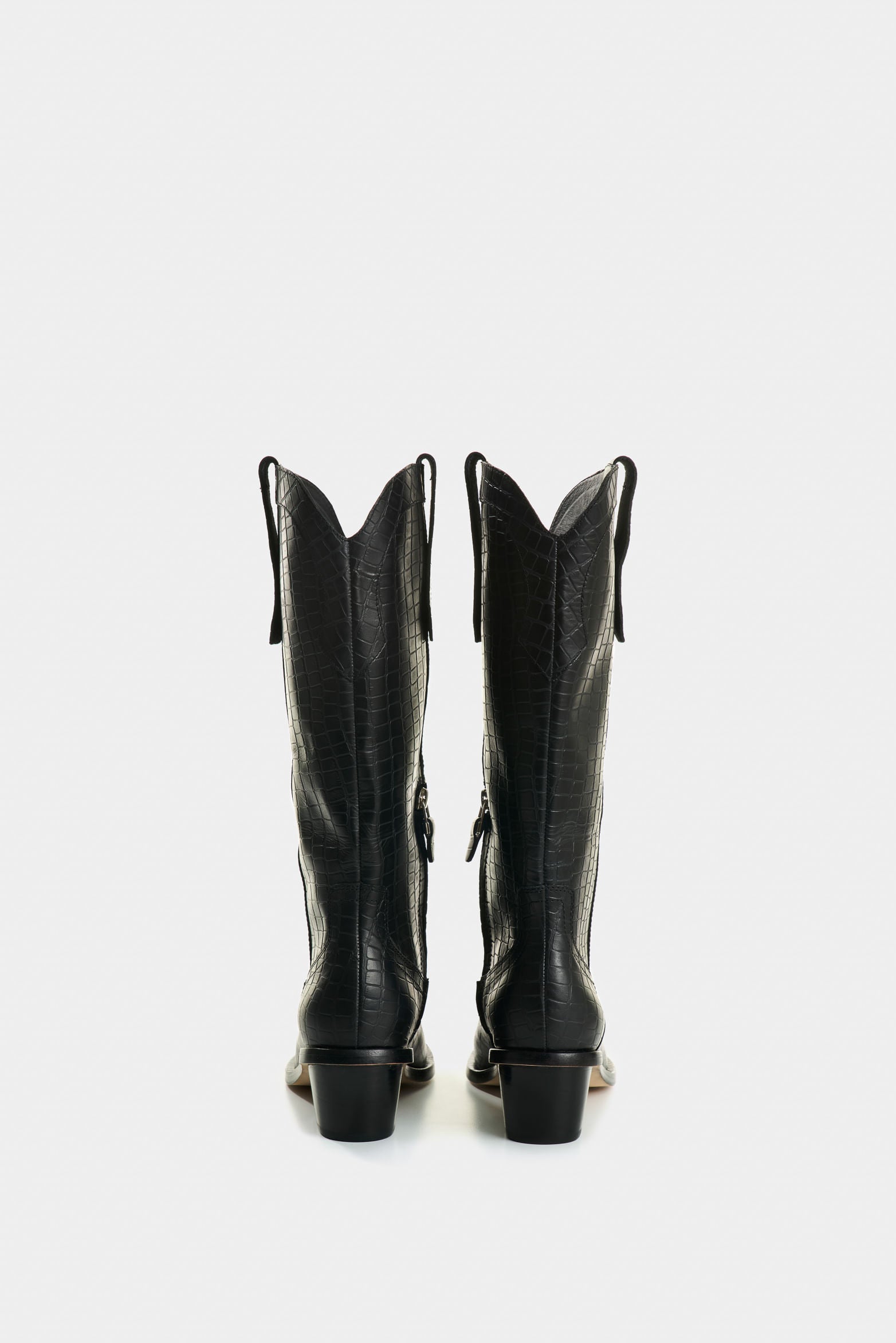 A timeless Western silhouette defined by textures that add character and authenticity. Croc-finish leather heightens the sophistication, while the vamp paneling nods to classic Western design. A wooden heel lends rustic charm, and a leather-lined footbed ensures all-day comfort. A versatile piece that elevates any outfit with artisanal finesse and refined allure.