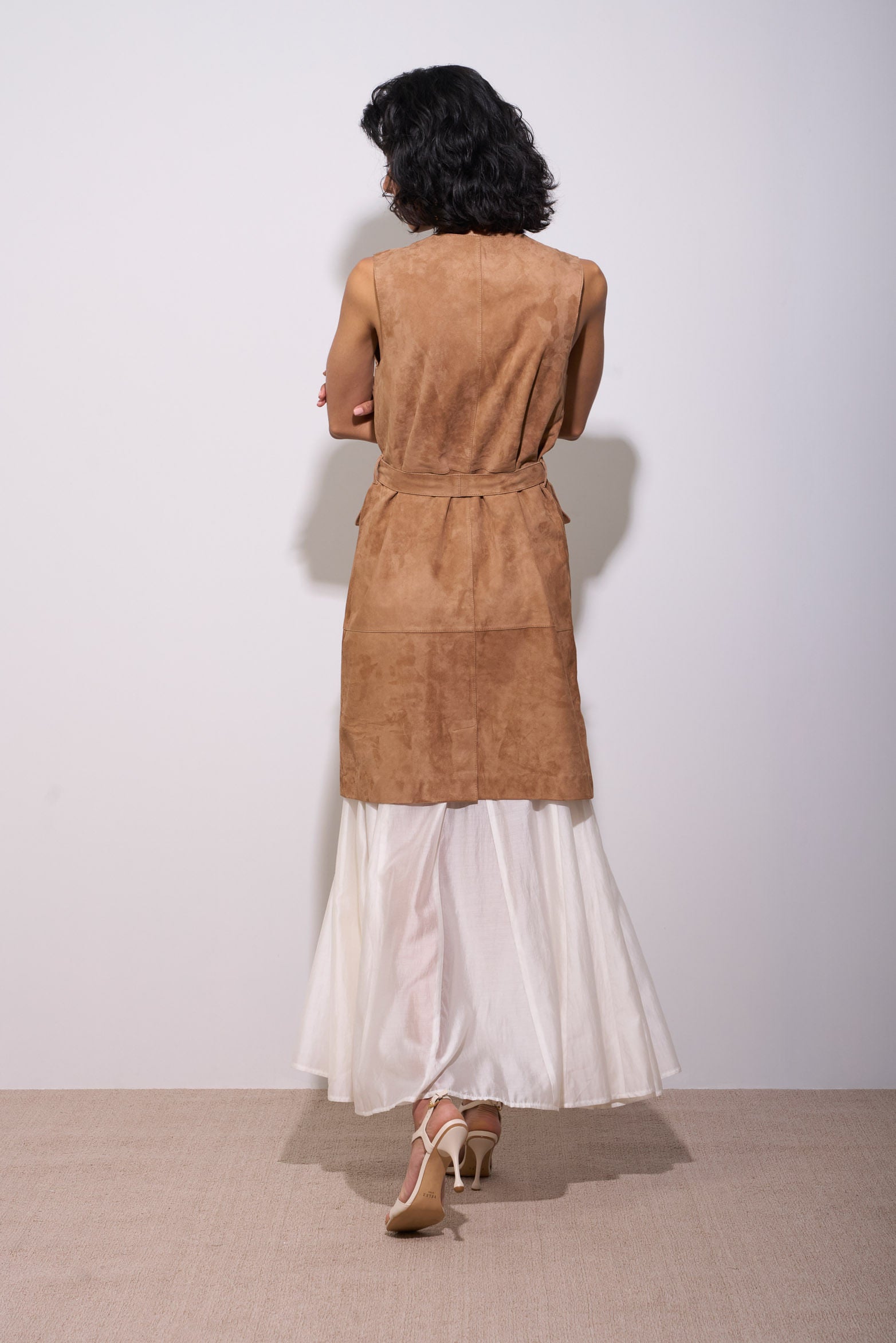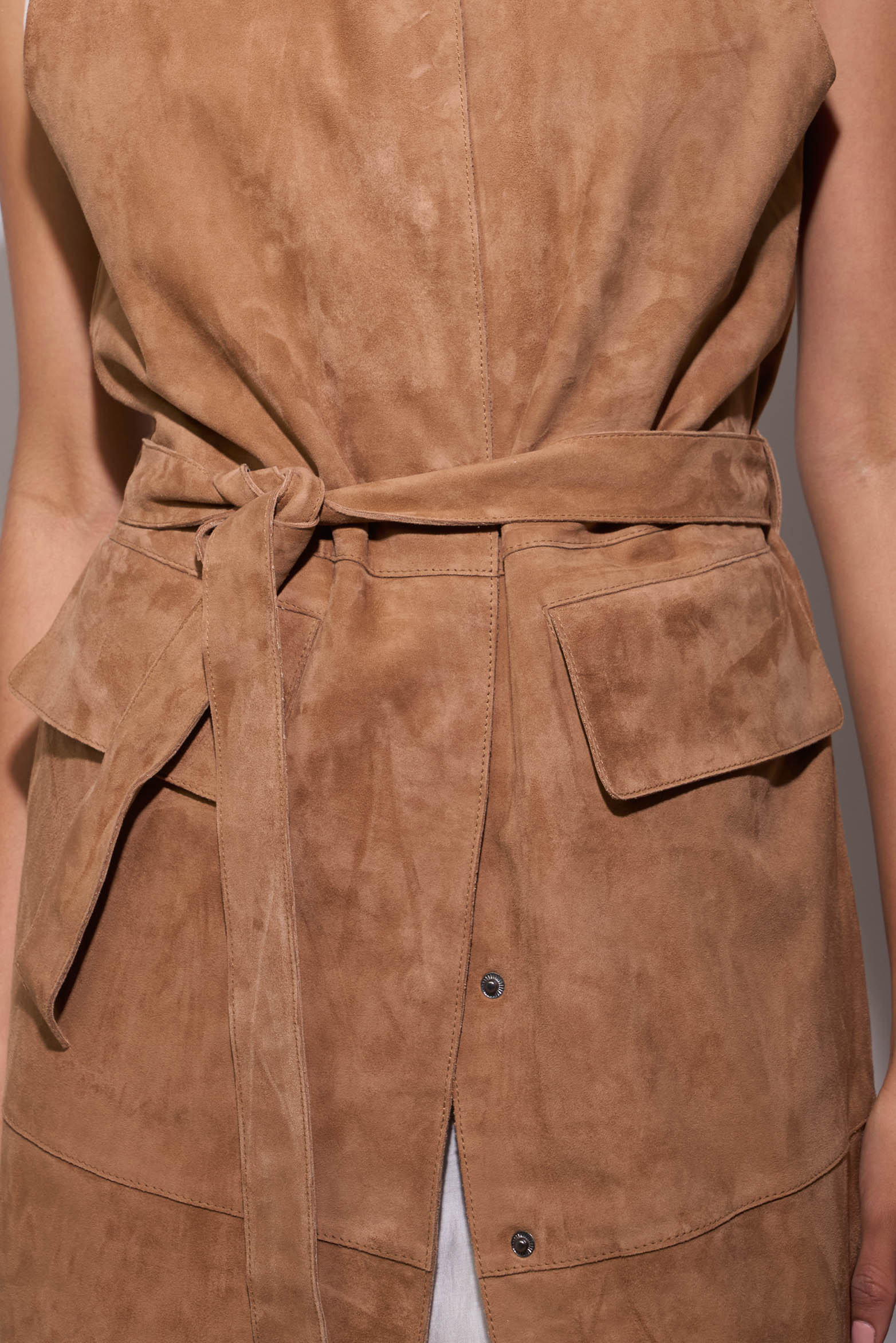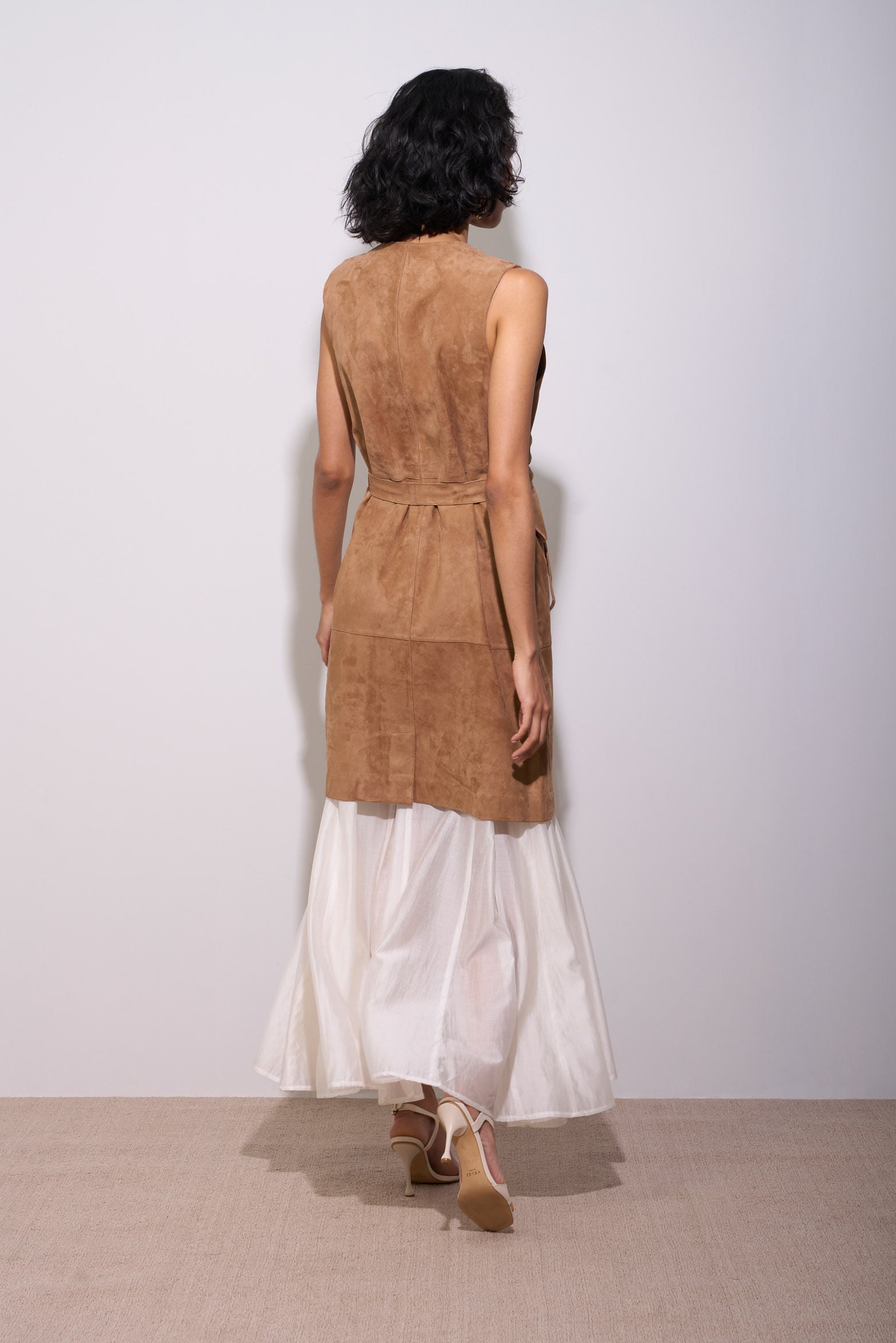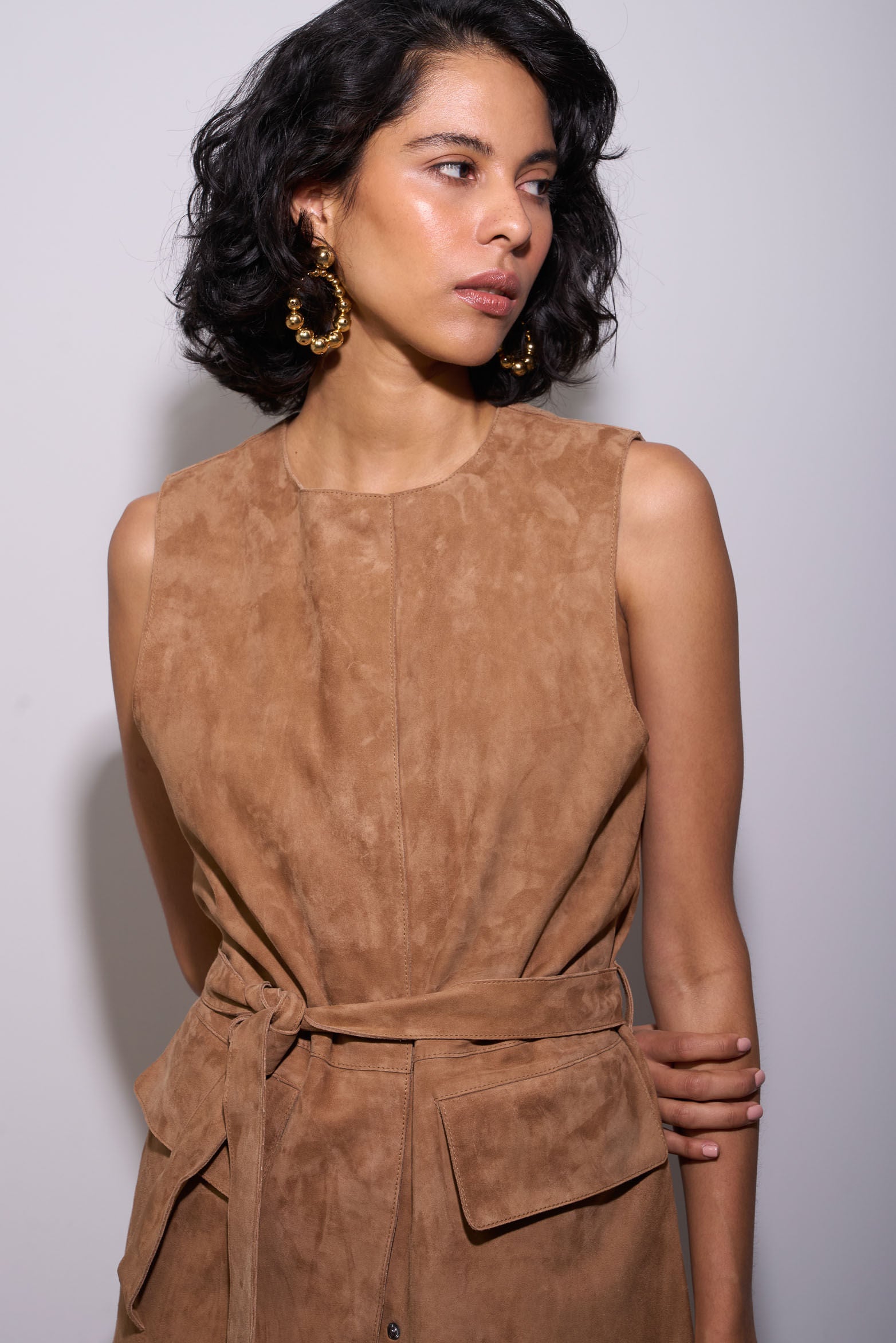 A balance between the classic and the bold. This short dress from the Suite 86 capsule, crafted in goat suede leather, stands out for its soft texture and clean lines that lend an arty, authentic air. Its relaxed silhouette and contemporary construction renew timeless charm. Wear it with tall Western boots for a look with its own strength. We are craftsmanship, we are heritage and transformation.