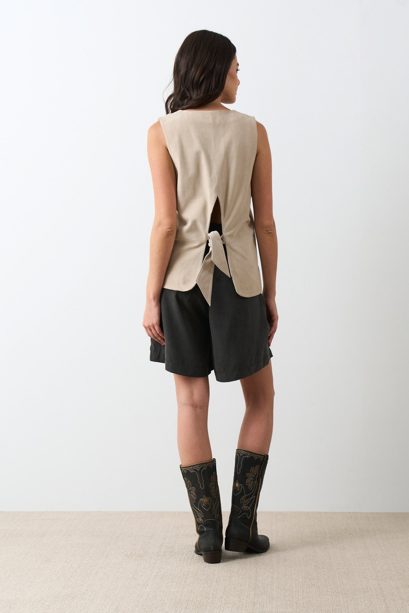 With satin fabric that reflects a subtle luminosity, these tailored shorts blend classic details with a modern design. Their fluid silhouette is refined by pleats and welt pockets, offering comfort and elegance. Perfect with bohemian blouses or lightweight knits, they’re a versatile piece that elevates your everyday looks with timeless sophistication.