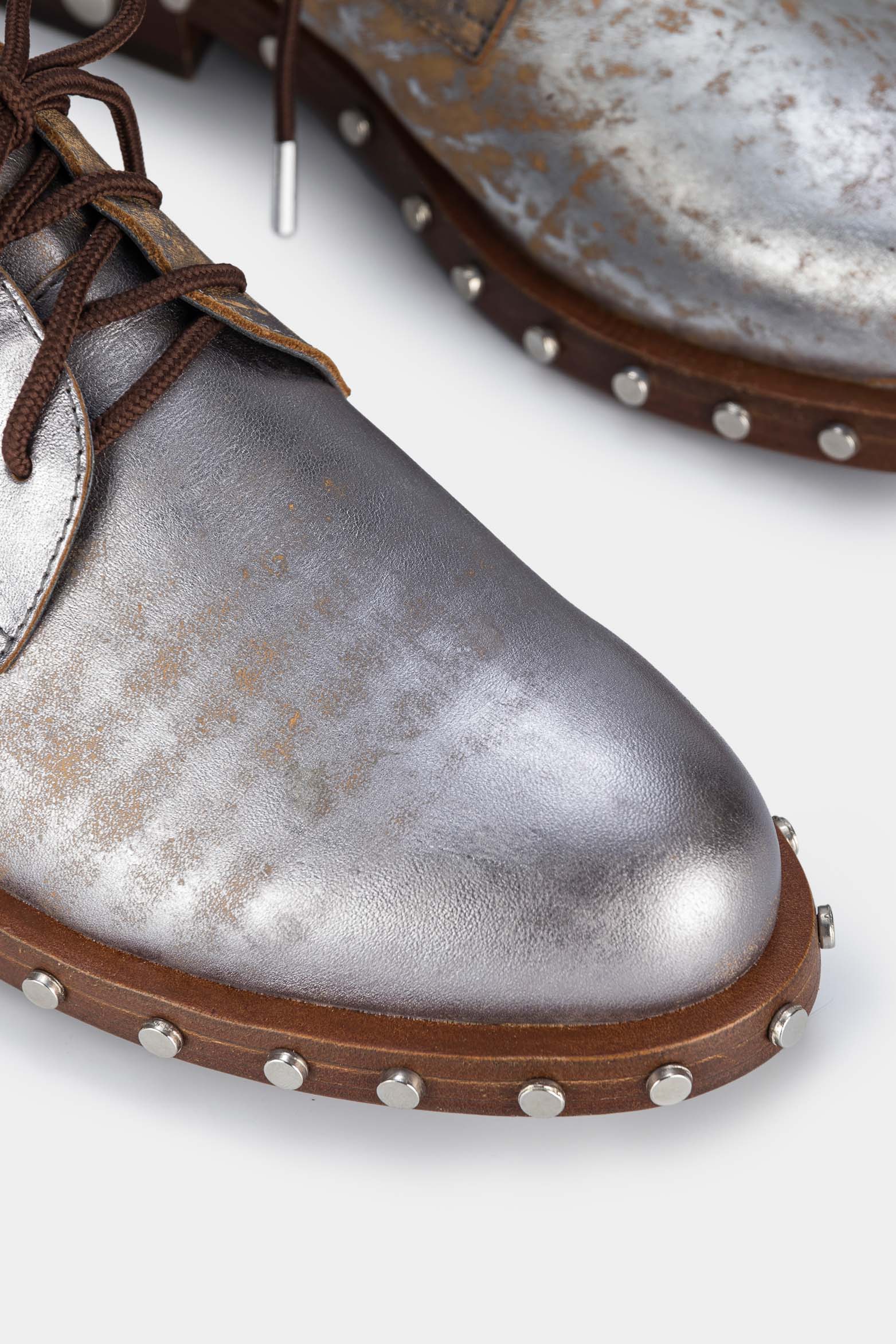 Home Women’s Lace-Up Oxfords in Gunmetal Gray Metallized Leather with Stud Detail