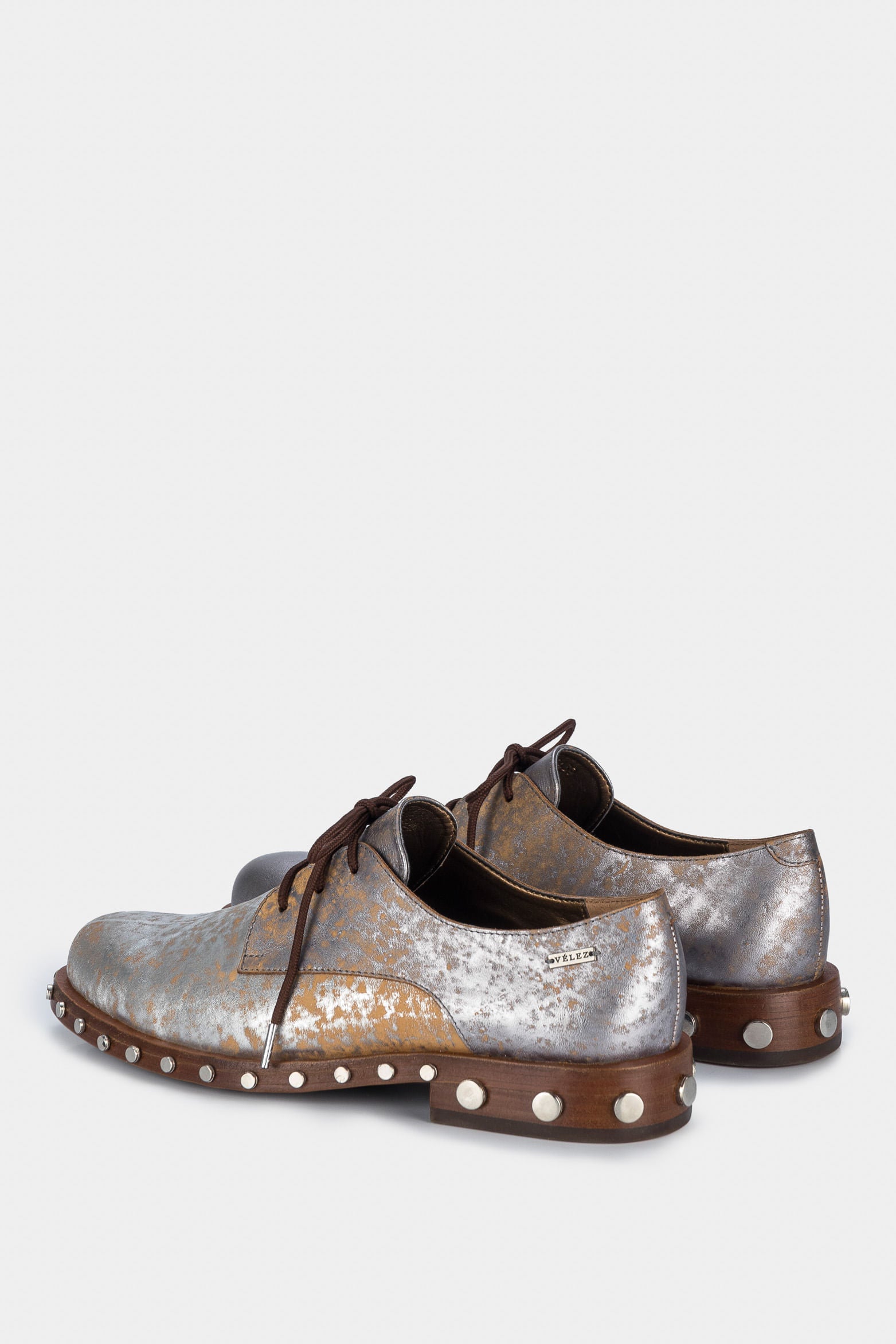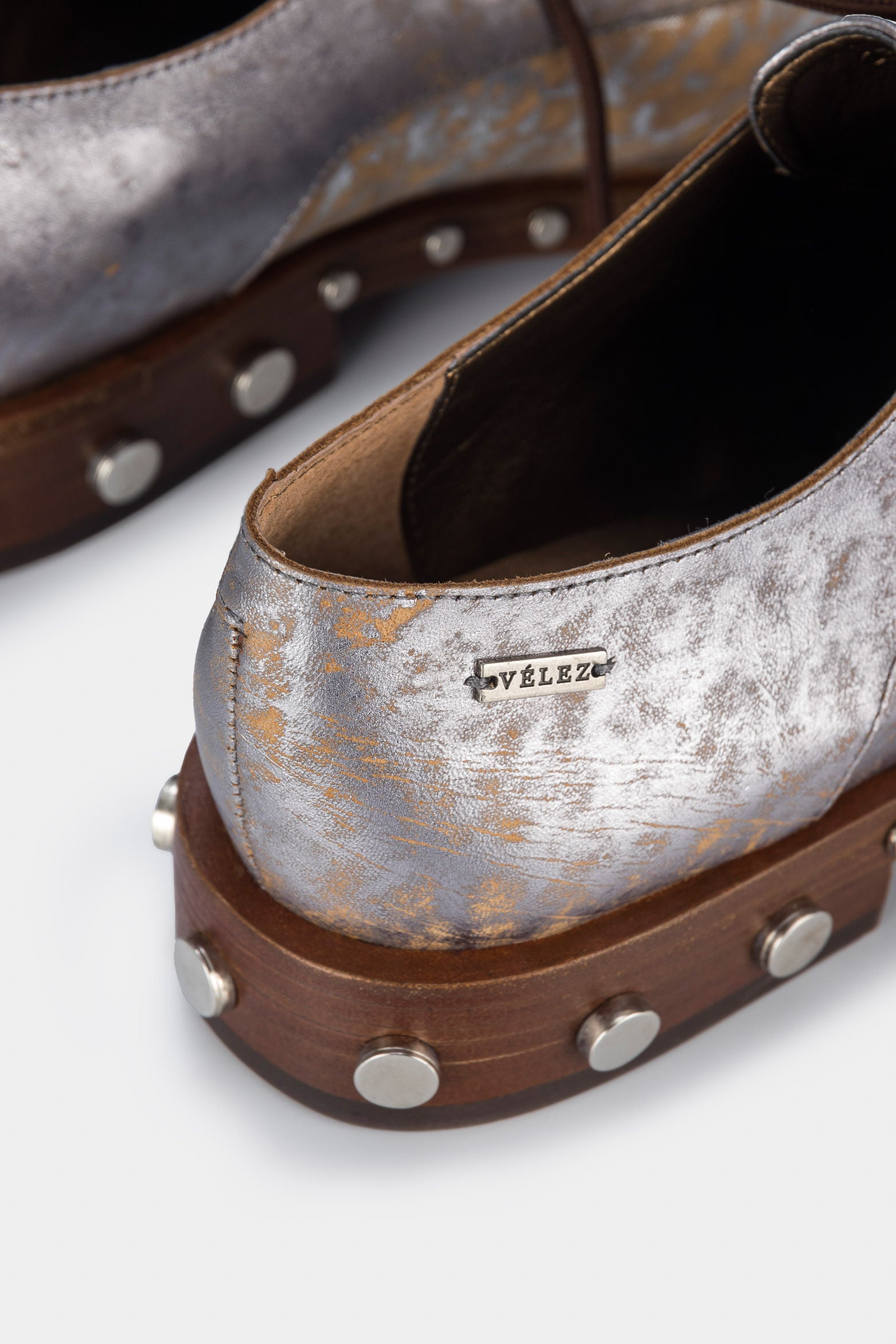 Set your looks apart with our lace-up oxford shoes made of metallized leather. They’re a bold choice for the sophisticated Vélez woman who values versatile pieces. Featuring croupon welding, a notched rubber sole and stud detail around the midsole, these shoes are perfect for pairing with boyfriend or baggy jeans, vintage silhouettes that give a trendy air, and accompanied by a leather jacket.