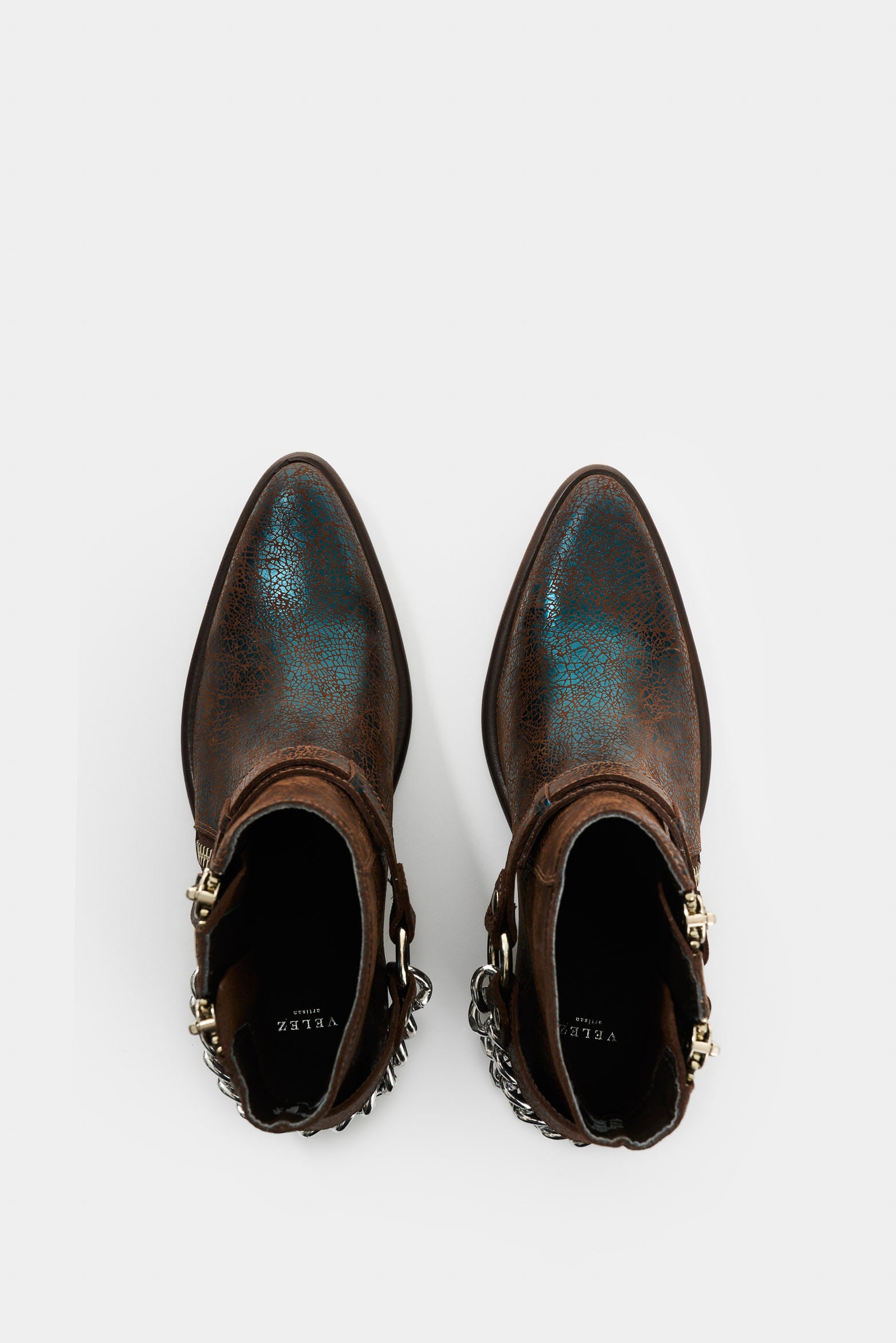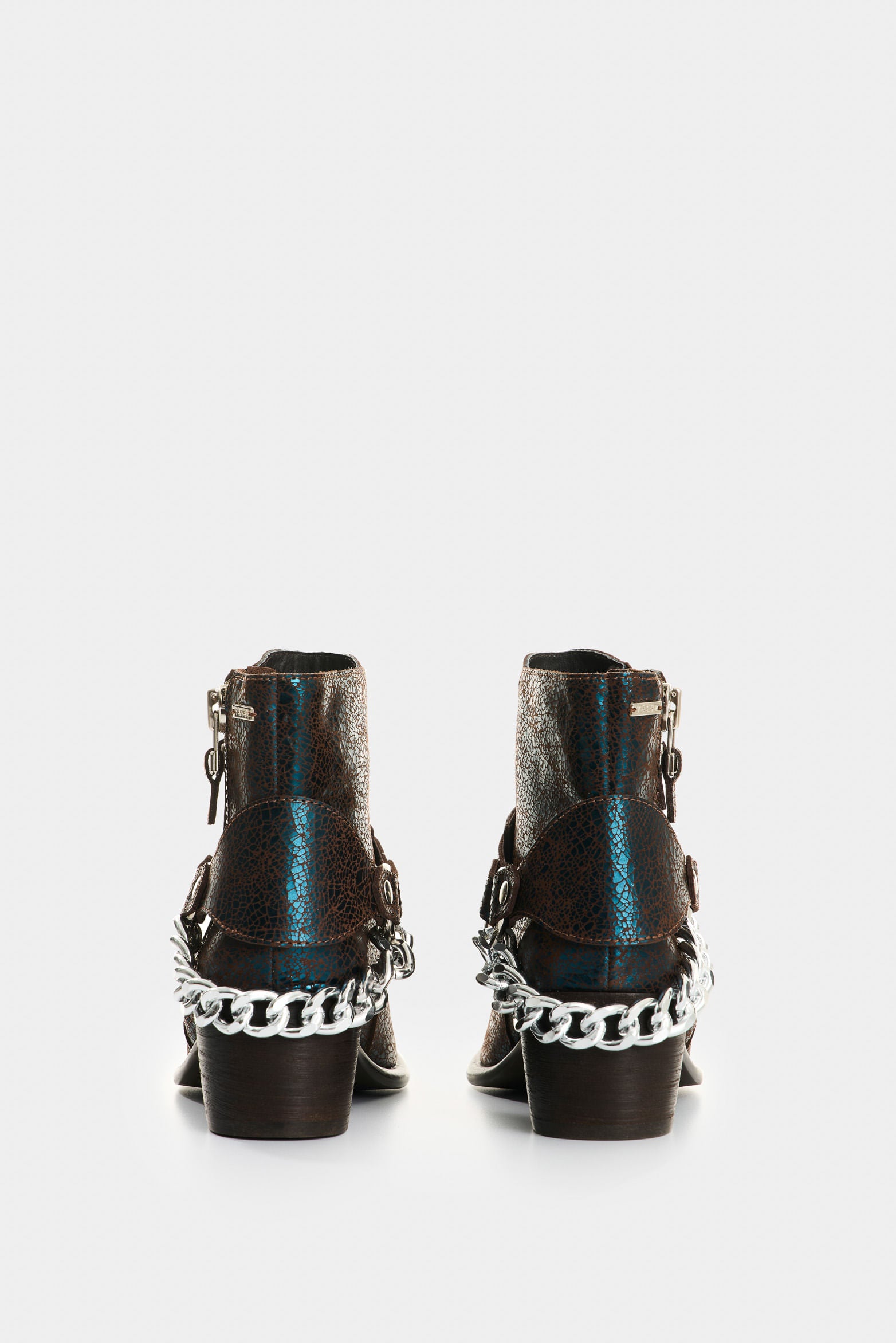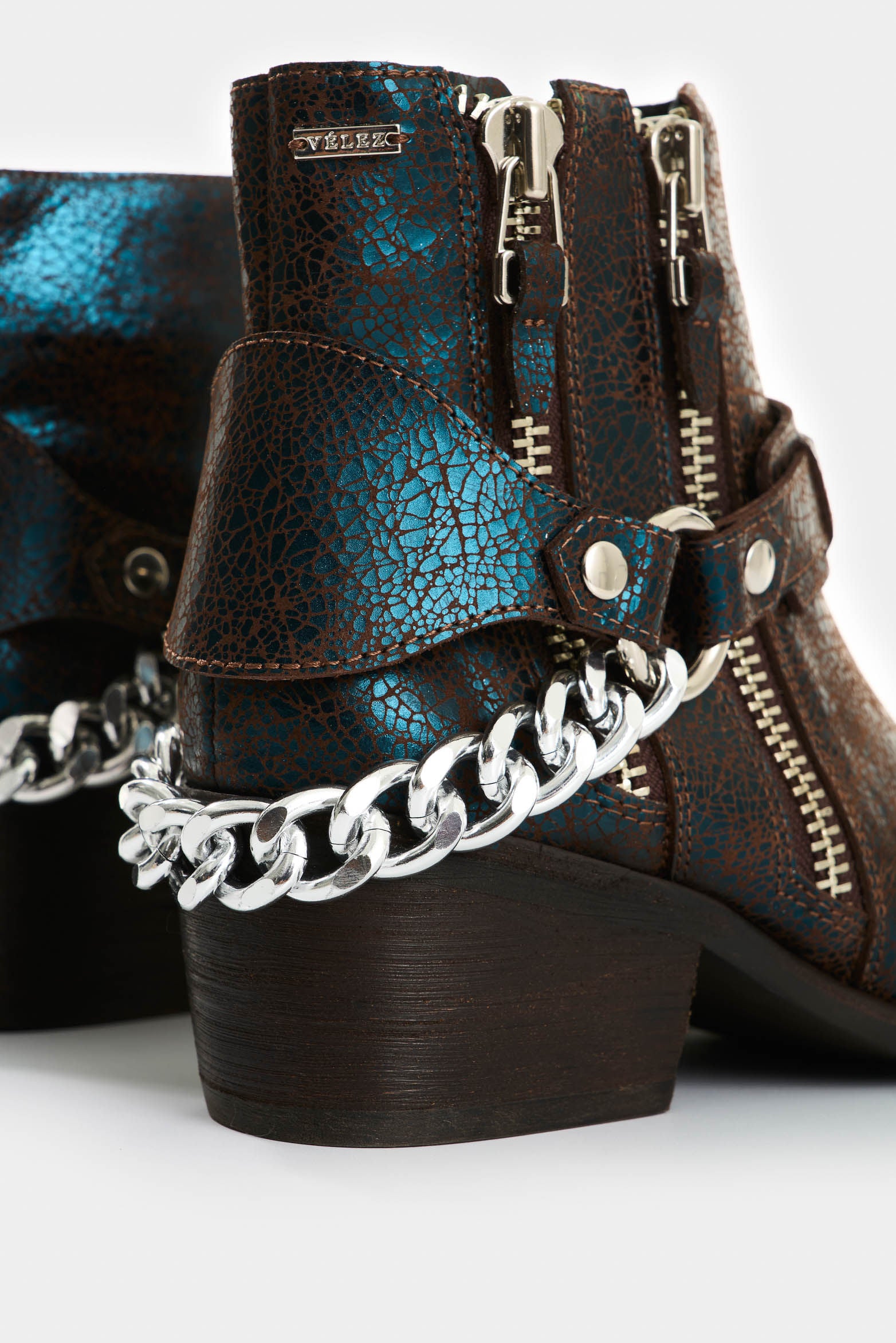 A bold silhouette that fuses biker spirit with an urban, sophisticated edge. Crackled leather with an iridescent finish adds character, while side zippers and a removable metal chain underscore its rebellious attitude. A wooden heel with a rustic finish and a thick neolite sole balance comfort and strength, creating a versatile boot with unmistakable presence and personality.